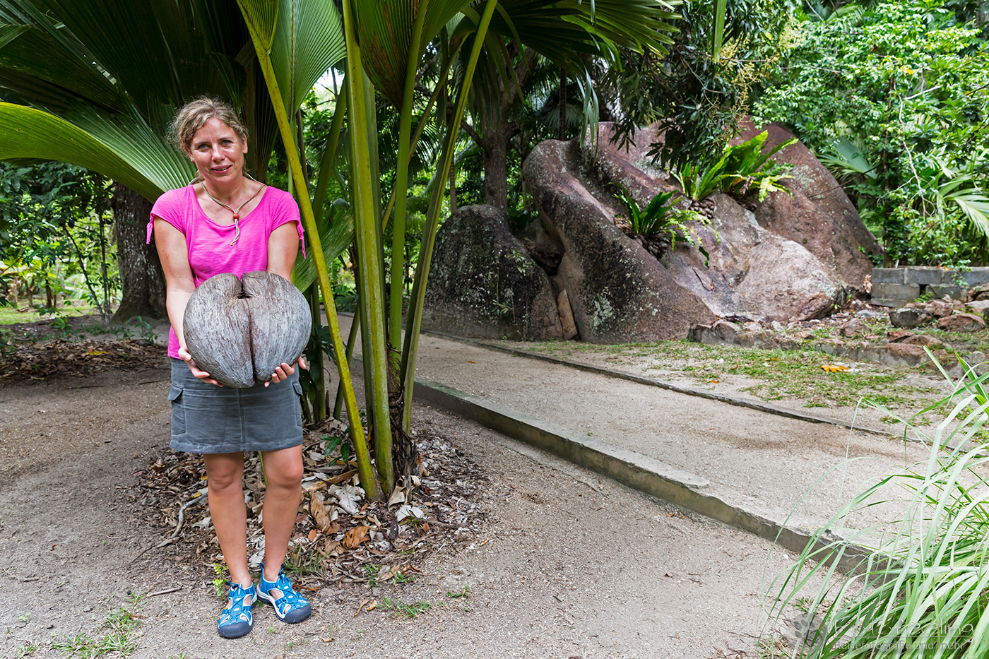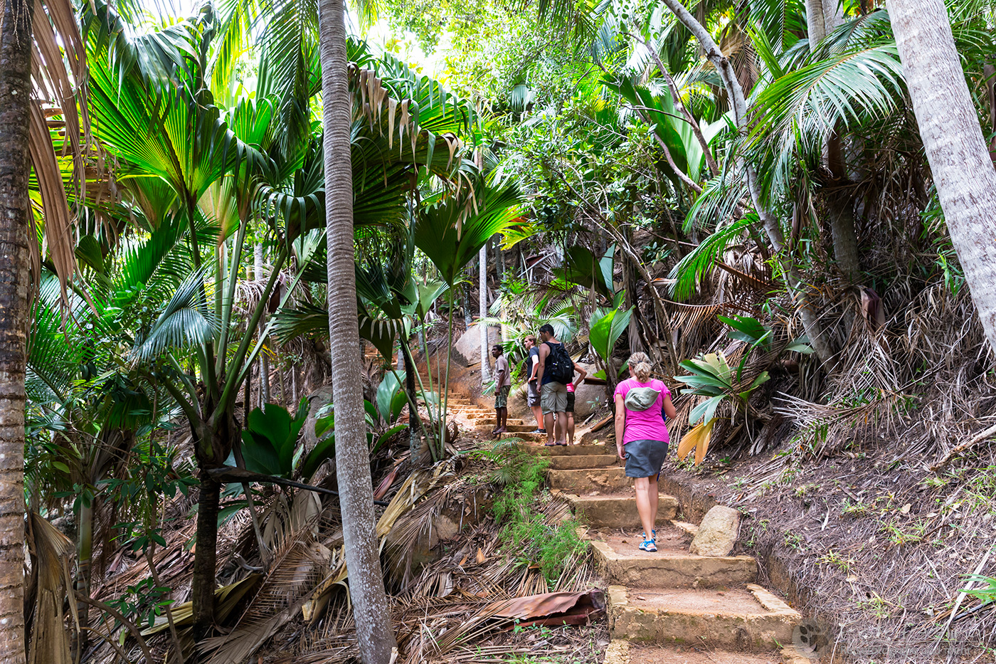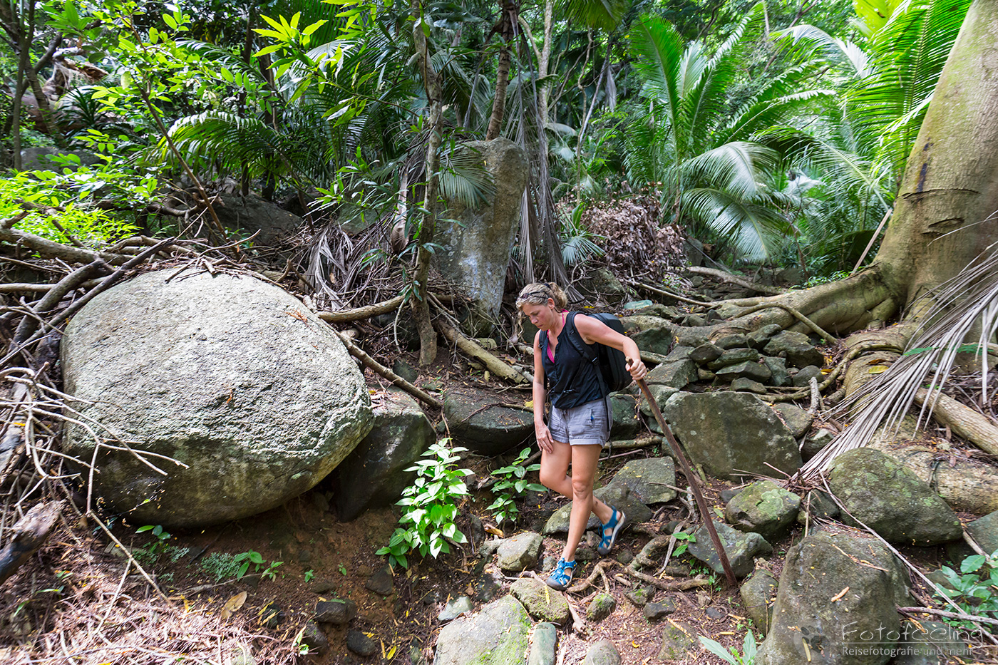 Über einen Pfad mit vielen Stufen wanderten wir durch den imposanten Palmenwald. Natürlich war es sehr schwül und schon bald waren wir pitschnass und durchgeschwitzt, doch der Weg durch die riesigen Bäume war jeden Tropfen Schweiß wert. Hoch über uns wuchsen die Früchte der Coco de Mer. Die männlichen Blüten erinnern an einen riesigen Schnabel mit kleinen Blüten darauf. Witzig war, dass sie total nach gekochtem Reis rochen und man sie schon von weitem wahrnahm, noch ehe man sie sah. Die weiblichen Blüten bilden die reifen Samen aus, die bekannten Coco de Mer "Nüsse". Sie können bis zu 50 cm lang werden und ein Nuss (Samen) kann ein Gewicht von