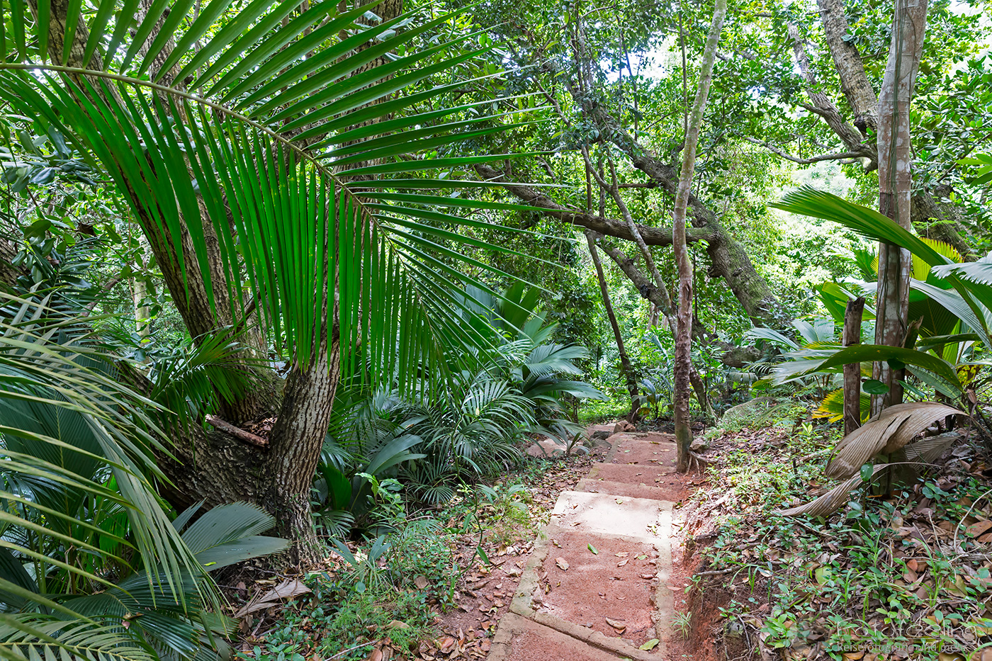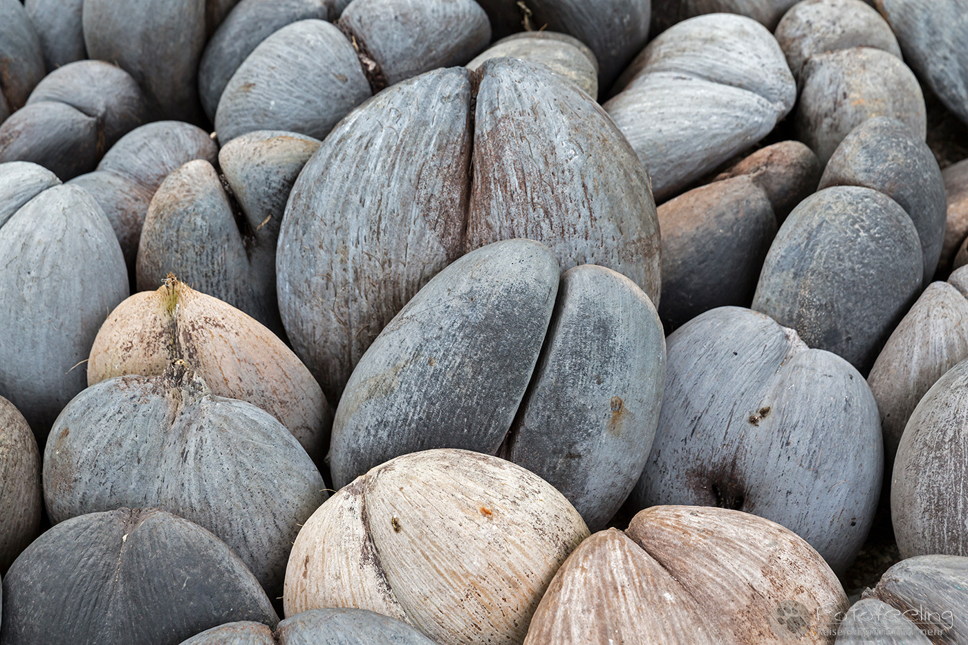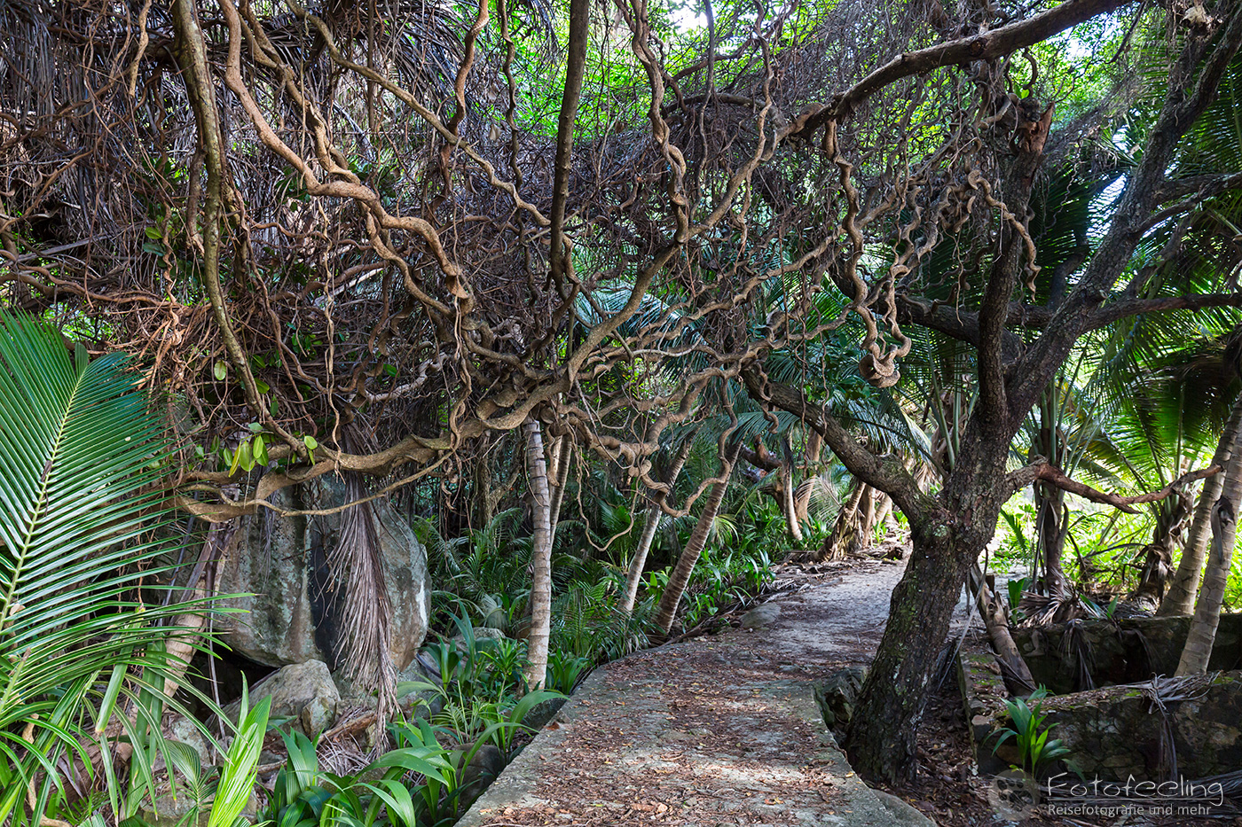 Über einen Pfad mit vielen Stufen wanderten wir durch den imposanten Palmenwald. Natürlich war es sehr schwül und schon bald waren wir pitschnass und durchgeschwitzt, doch der Weg durch die riesigen Bäume war jeden Tropfen Schweiß wert. Hoch über uns wuchsen die Früchte der Coco de Mer. Die männlichen Blüten erinnern an einen riesigen Schnabel mit kleinen Blüten darauf. Witzig war, dass sie total nach gekochtem Reis rochen und man sie schon von weitem wahrnahm, noch ehe man sie sah. Die weiblichen Blüten bilden die reifen Samen aus, die bekannten Coco de Mer "Nüsse". Sie können bis zu 50 cm lang werden und ein Nuss (Samen) kann ein Gewicht von