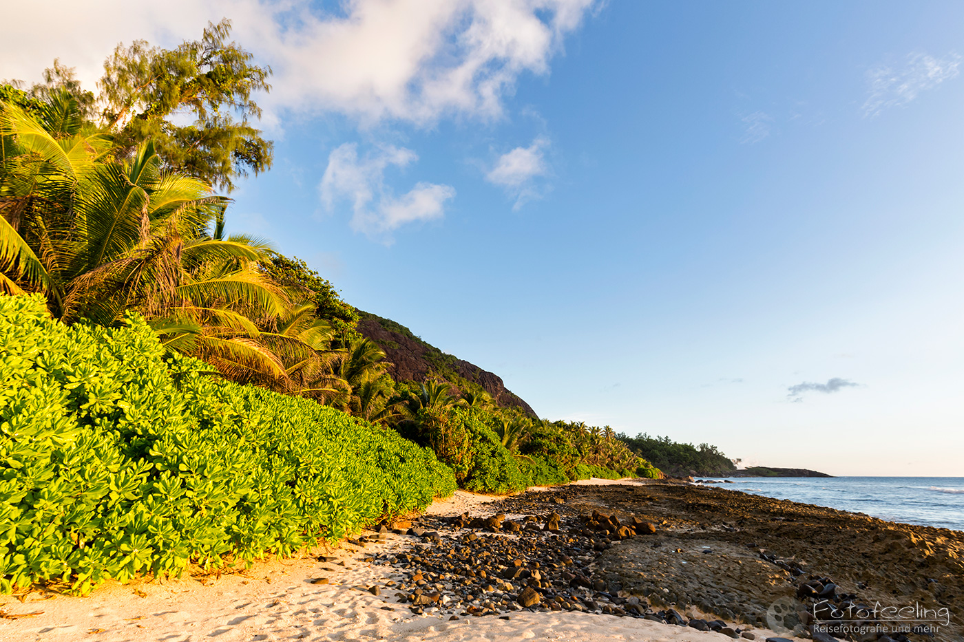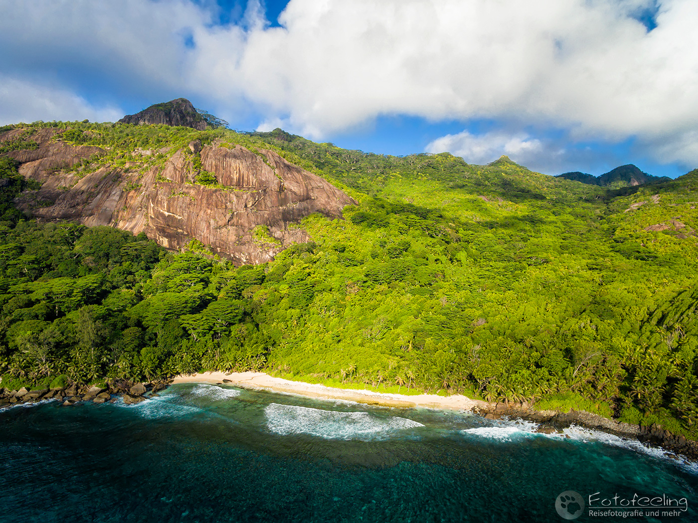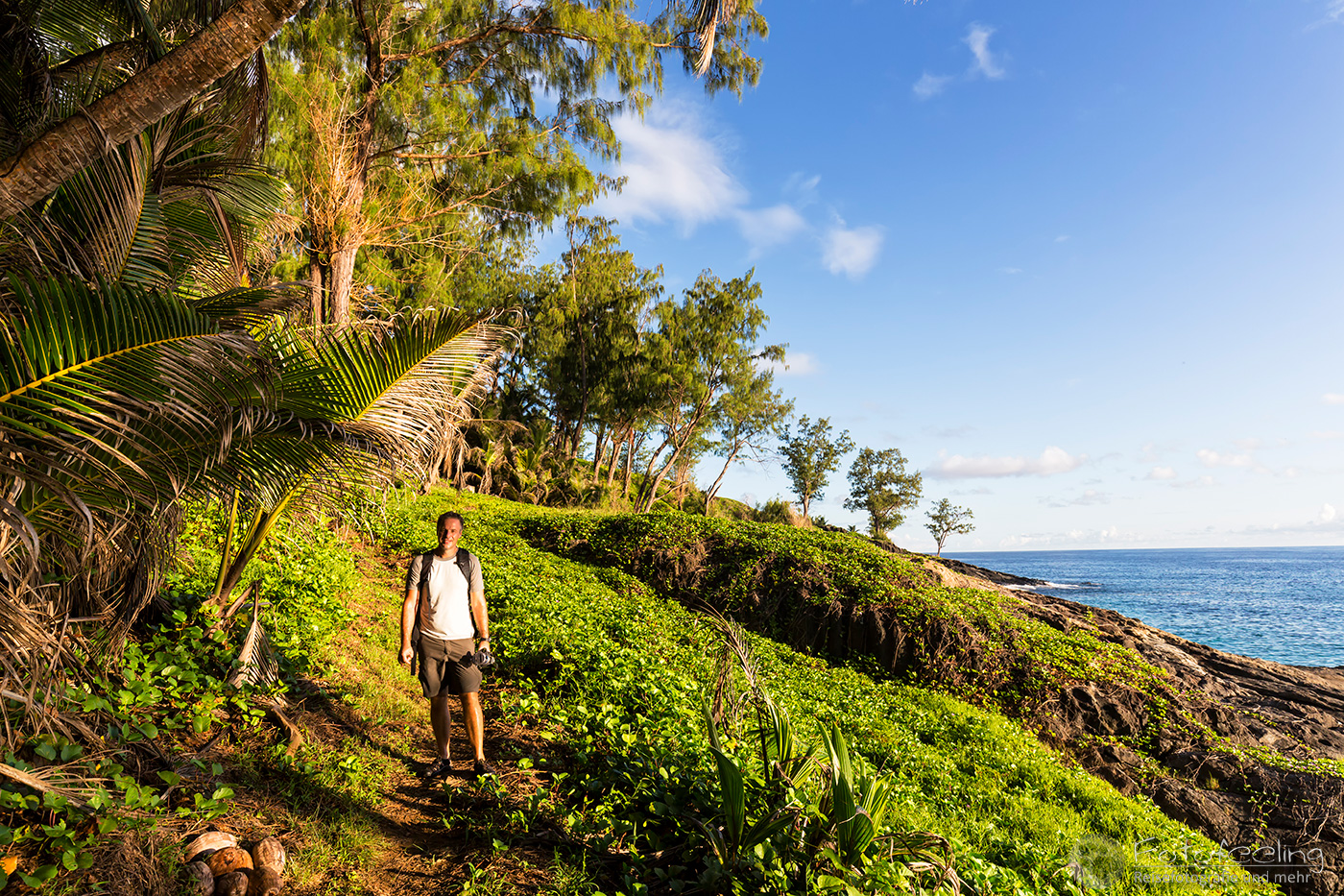 Schon als wir über die schwarzen Steine liefen, wussten wir, dass es sich hier um vulkanisches Gestein handelte, denn es war dunkel, rau und zerklüftet. Auf der Lava wuchsen lila Blumen an langen Ranken. Einige Meter unter uns krachten die Wellen mit voller Wucht auf die Felsen und überspülten sie mit weißer Gischt. Was für ein Ort und was für eine traumhafte Aussicht. Die ganze Küste mit ihren schönen Stränden lag vor uns, die Felsen im Hintergrund erstreckten sich rot glänzend in die Höhe, Flughunde kreisten über uns und es war noch grüner als auf den anderen Inseln. Das hier war eine wild romantische Perle im Inselparadies der Seychellen, die unter einer rauen Schale einen wahren Schatz verbarg. Man musste nur die Sinne öffnen. Allein dieser Punkt hier oben hatte etwas Magisches und lud zum Verweilen ein. Doch natürlich wollten wir noch etwas mehr von der Insel sehen und so stiegen wir den Hügel wieder hinab bis zu dem Weg, der uns zum nächsten Strand, dem Anse Lascars, brachte. Wir passierten das Dauban Mausoleum, gingen durch die alte Kokosnuss-Plantage und durch wilden Regenwald. Eine Kokospalme lag quer über dem Weg, doch zwischen den Palmwedeln konnten wir leicht gebückt durchschlüpfen. Kurz vor dem Strand öffnete sich der Wald und wir passierten ein Felsengebiet, das sich rechts von uns in die Höhe erhob. Danach führte der Weg zu den zwei Stränden von Anse Lascars. Wieder lag ein wilder Riffstrand vor uns, der neben dem unebenen Riffgestein schönen feinen Sand hatte. Auch hier brachen sich die Wellen an den Klippen. Palmen umrandeten den Strand. Nach dem ersten Strand gingen wir weiter zum zweiten Strandabschnitt, denn natürlich wollten wir noch etwas weiter in Richtung Anse Patates gehen. Auf dem Weg dorthin sahen wir auf einmal eine Bewegung. Hier hatte es doch keine Tiere, wunderten wir uns. Dann entdeckten wir an einen Felsen geschmiegt eine wilde Katze. Sie schaute uns sehr skeptisch an. Weit und breit war hier nichts, das musste wirklich eine Wildkatze sein. Sie war gut genährt und zwinkerte uns sogar zu. Schnell gingen wir weiter, damit sie sich nicht ängstigt und in Ruhe verschwinden konnte. Der Weg hatte sich für uns mehr als gelohnt. Kurz bevor der Weg und hinab zum Strand führte, gab die Vegetation einen Blick auf die kleine Bucht vom Anse Patates vor uns frei. Im Hintergrund ragten wieder die roten Felsen in luftige Höhen hinauf und das satte Grün der Palmen und Bäume leuchteten im Nachmittagslicht. Während Chris eine Runde mit dem Kopter flog, wanderte ich den abenteuerlichen Weg durch die alte Palmenplantage bis zum Strand hinab. Früher waren hier sicher Fahrzeuge unterwegs, aber jetzt war der Weg kaputt und man musste selbst beim Laufen genau aufpassen, wohin man trat. Die Palmen standen kreuz und quer, mit vielen schweren Kokosnüssen beladen, aber auch andere Bäume und Büsche wucherten abseits des Weges. Ich schaute mir kurz den Strand an, aber da es schon spät war, hielt ich mich nicht lange auf, sondern kehrte zu Chris zurück. Dabei hatte ich immer einen Blick auf die Palmen, da die Nüsse oftmals über meinem Kopf hingen. Auf dem Rückweg erbeutete Chris noch zwei Kokosnüsse für uns, die wir mit zu unserer Villa nahmen.