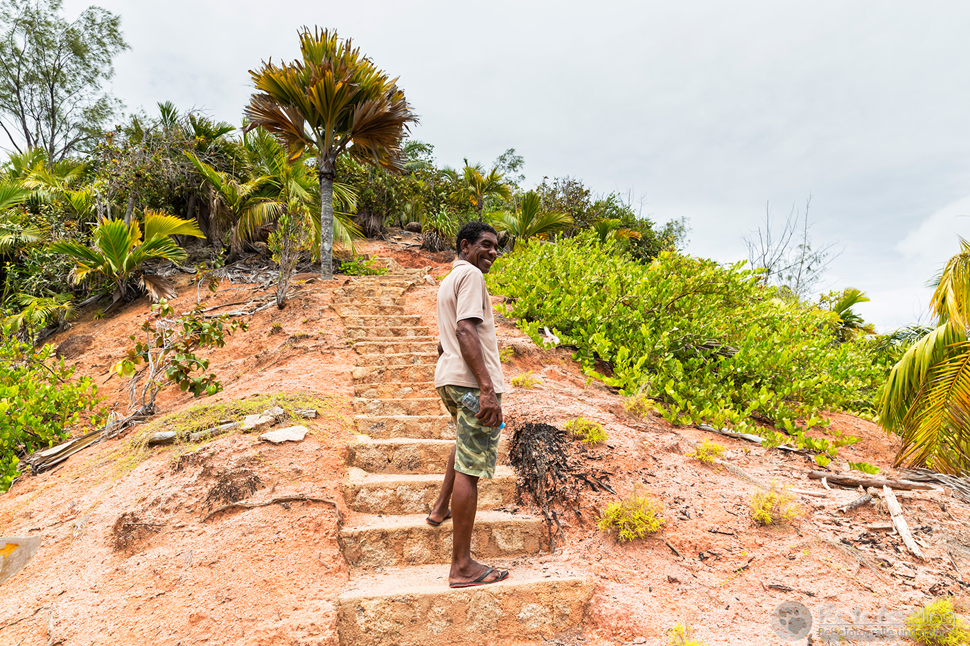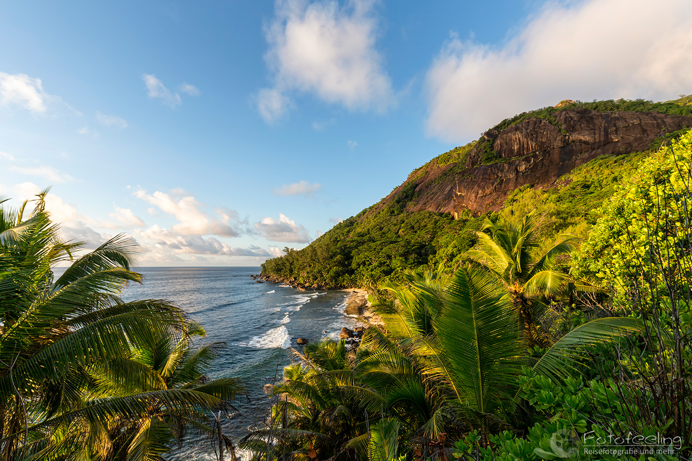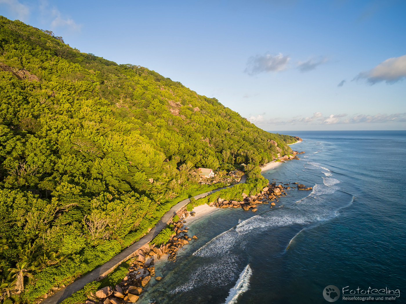 Schon als wir über die schwarzen Steine liefen, wussten wir, dass es sich hier um vulkanisches Gestein handelte, denn es war dunkel, rau und zerklüftet. Auf der Lava wuchsen lila Blumen an langen Ranken. Einige Meter unter uns krachten die Wellen mit voller Wucht auf die Felsen und überspülten sie mit weißer Gischt. Was für ein Ort und was für eine traumhafte Aussicht. Die ganze Küste mit ihren schönen Stränden lag vor uns, die Felsen im Hintergrund erstreckten sich rot glänzend in die Höhe, Flughunde kreisten über uns und es war noch grüner als auf den anderen Inseln. Das hier war eine wild romantische Perle im Inselparadies der Seychellen, die unter einer rauen Schale einen wahren Schatz verbarg. Man musste nur die Sinne öffnen. Allein dieser Punkt hier oben hatte etwas Magisches und lud zum Verweilen ein. Doch natürlich wollten wir noch etwas mehr von der Insel sehen und so stiegen wir den Hügel wieder hinab bis zu dem Weg, der uns zum nächsten Strand, dem Anse Lascars, brachte. Wir passierten das Dauban Mausoleum, gingen durch die alte Kokosnuss-Plantage und durch wilden Regenwald. Eine Kokospalme lag quer über dem Weg, doch zwischen den Palmwedeln konnten wir leicht gebückt durchschlüpfen. Kurz vor dem Strand öffnete sich der Wald und wir passierten ein Felsengebiet, das sich rechts von uns in die Höhe erhob. Danach führte der Weg zu den zwei Stränden von Anse Lascars. Wieder lag ein wilder Riffstrand vor uns, der neben dem unebenen Riffgestein schönen feinen Sand hatte. Auch hier brachen sich die Wellen an den Klippen. Palmen umrandeten den Strand. Nach dem ersten Strand gingen wir weiter zum zweiten Strandabschnitt, denn natürlich wollten wir noch etwas weiter in Richtung Anse Patates gehen. Auf dem Weg dorthin sahen wir auf einmal eine Bewegung. Hier hatte es doch keine Tiere, wunderten wir uns. Dann entdeckten wir an einen Felsen geschmiegt eine wilde Katze. Sie schaute uns sehr skeptisch an. Weit und breit war hier nichts, das musste wirklich eine Wildkatze sein. Sie war gut genährt und zwinkerte uns sogar zu. Schnell gingen wir weiter, damit sie sich nicht ängstigt und in Ruhe verschwinden konnte. Der Weg hatte sich für uns mehr als gelohnt. Kurz bevor der Weg und hinab zum Strand führte, gab die Vegetation einen Blick auf die kleine Bucht vom Anse Patates vor uns frei. Im Hintergrund ragten wieder die roten Felsen in luftige Höhen hinauf und das satte Grün der Palmen und Bäume leuchteten im Nachmittagslicht. Während Chris eine Runde mit dem Kopter flog, wanderte ich den abenteuerlichen Weg durch die alte Palmenplantage bis zum Strand hinab. Früher waren hier sicher Fahrzeuge unterwegs, aber jetzt war der Weg kaputt und man musste selbst beim Laufen genau aufpassen, wohin man trat. Die Palmen standen kreuz und quer, mit vielen schweren Kokosnüssen beladen, aber auch andere Bäume und Büsche wucherten abseits des Weges. Ich schaute mir kurz den Strand an, aber da es schon spät war, hielt ich mich nicht lange auf, sondern kehrte zu Chris zurück. Dabei hatte ich immer einen Blick auf die Palmen, da die Nüsse oftmals über meinem Kopf hingen. Auf dem Rückweg erbeutete Chris noch zwei Kokosnüsse für uns, die wir mit zu unserer Villa nahmen.
