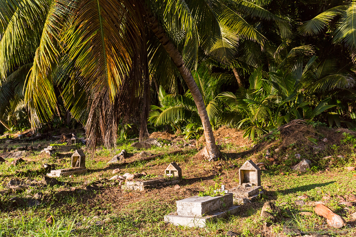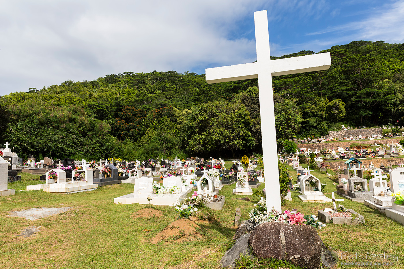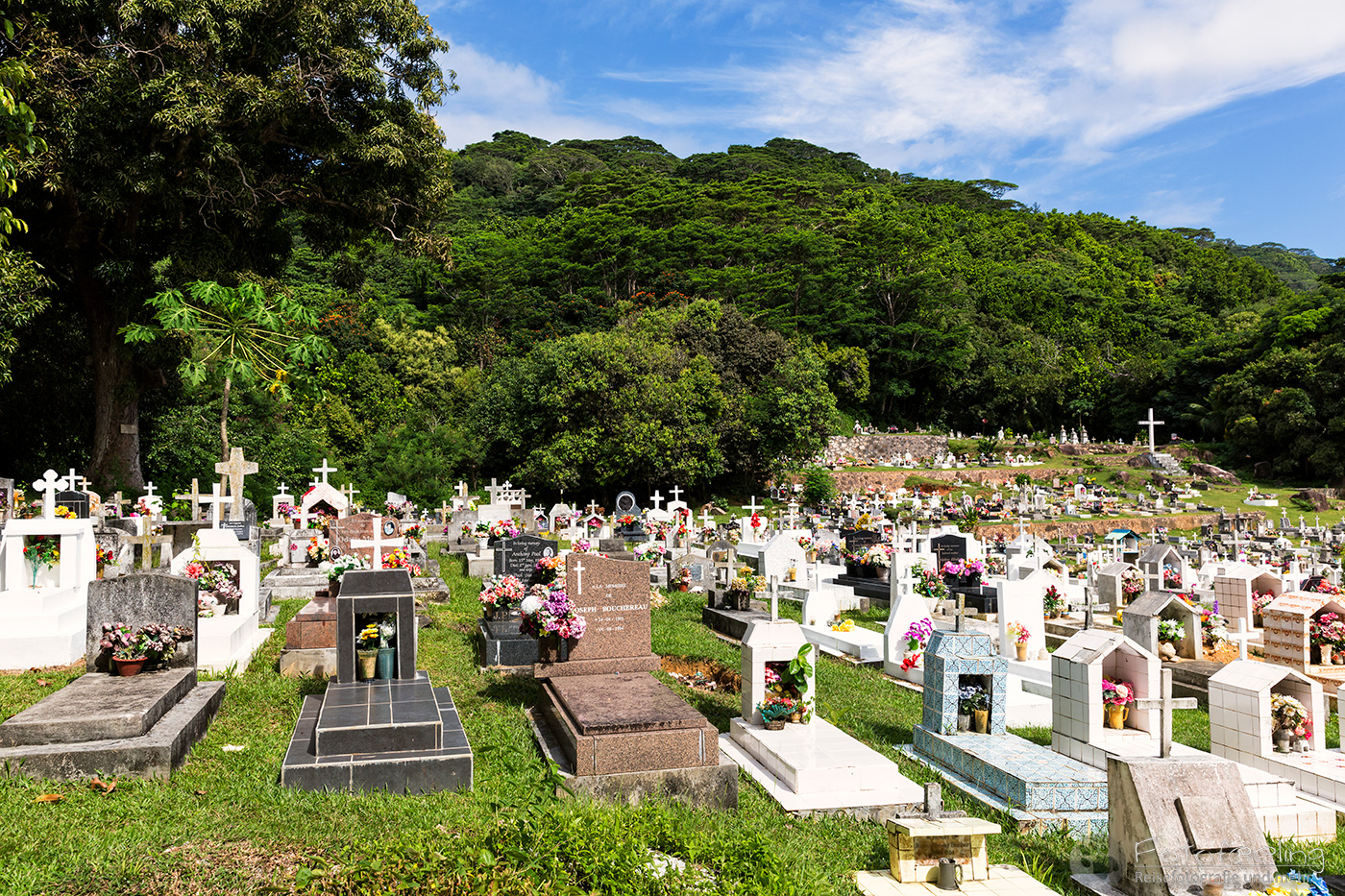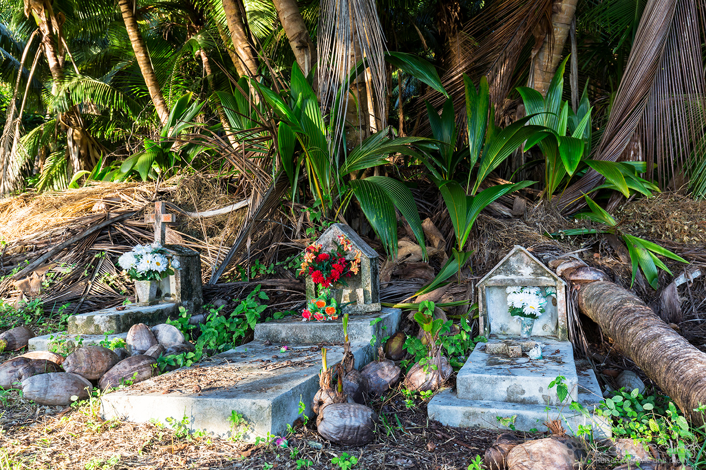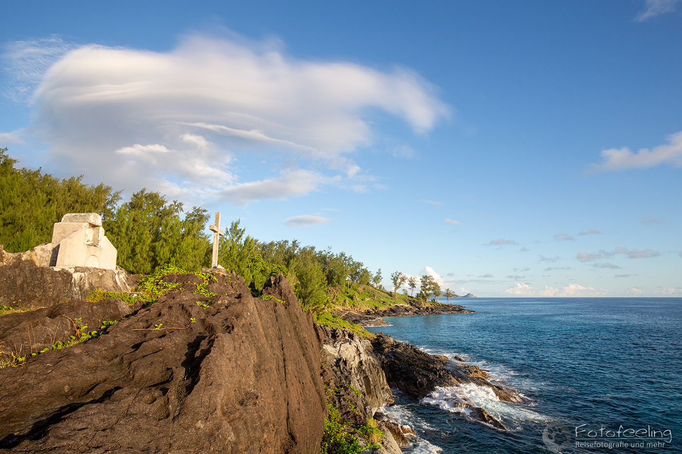 Mariannick hatte uns die einsamen Strände rechts vom Hotel empfohlen und so schulterten wir später am Nachmittag die Kamera und den Kopter und gingen los. Es ging leicht bergauf, vorbei an einem kleinen vom Meer gespeisten See, in dem ein Reiher stand. Krabben liefen vor uns davon und raschelten im Laub. An einer Betonbrücke zweigte nach links ein kleiner Weg ab, der uns bergauf durch den Wald auf einen Hügel führte. Rechts von uns lag ein kleiner alter Friedhof. Die Farbe war von einigen Steinen im Laufe der Zeit durch Regen abgewaschen, die Steine zum Teil leicht verwittert und verschoben, aber noch immer standen bunte Plastikblumen zur Erinnerung an den Grabstellen. Die Gräber lagen auf einer Wiese von Sträuchern umgeben und Palmen ragten im Hintergrund auf. Zwischen den Gräbern wuchs aus jungen Kokosnüssen neues Leben. Ein friedlicher Ort. Doch unser Ziel war der Pointe Ramasse Tout mit einem Kreuz und einer kleine Kapelle, die hoch oben auf der wilden Steilküste über dem Meer thronte. Hier hatten wir einen guten Blick auf den Anse Cimetiere, der von dieser wilden Landspitze begrenzt wird und weiter auf den Anse Lascars und den Anse Patates am Ende der Insel. Ca. 20 Kilometer entfernt ließen sich die Umrisse der Insel Mahé erkennen.