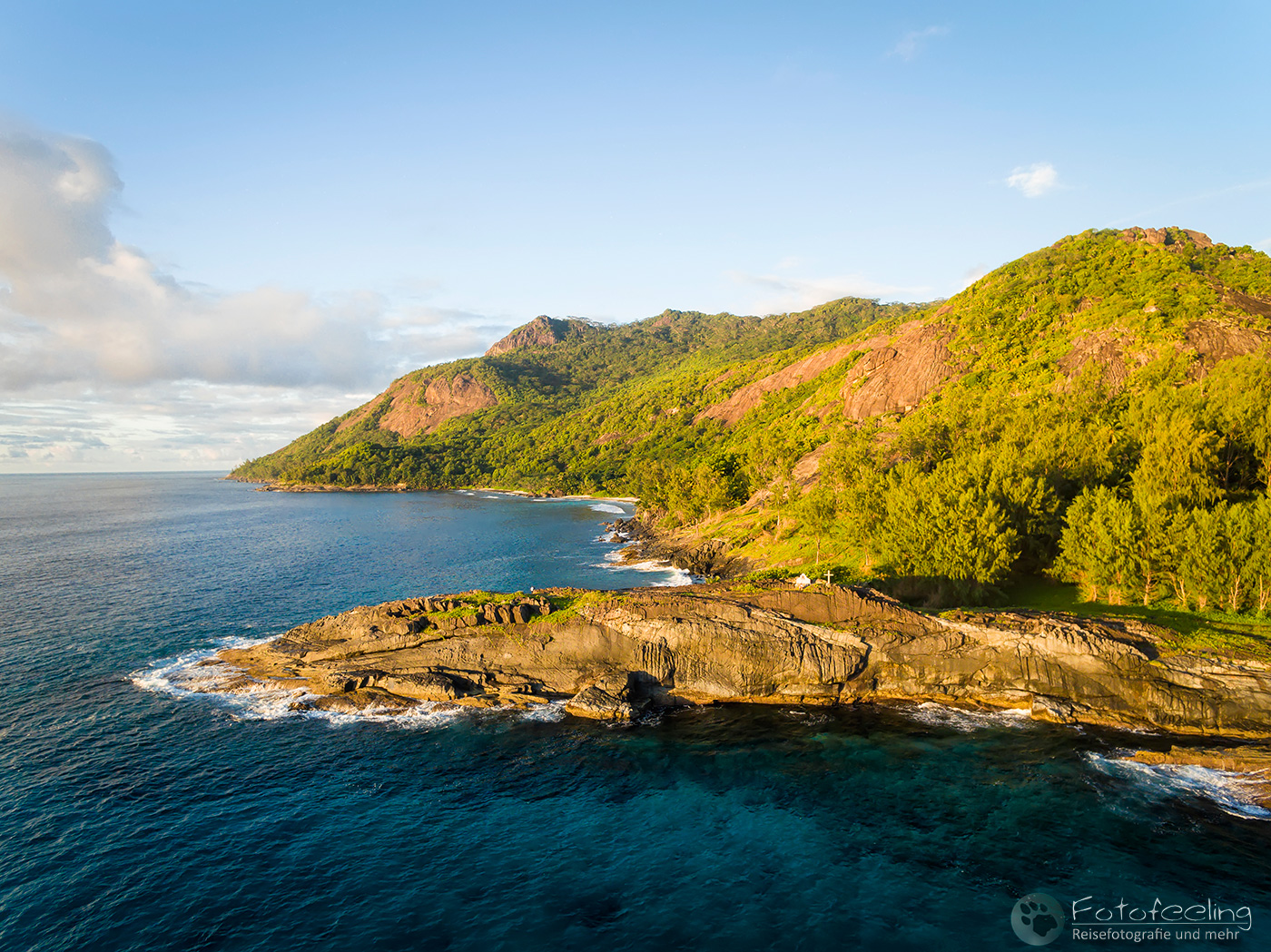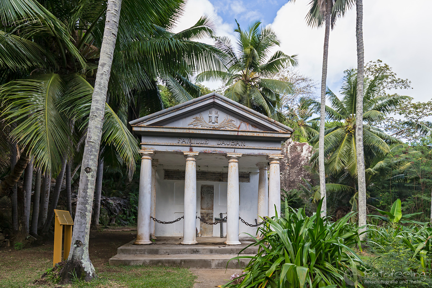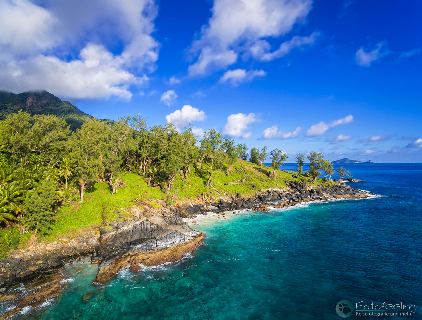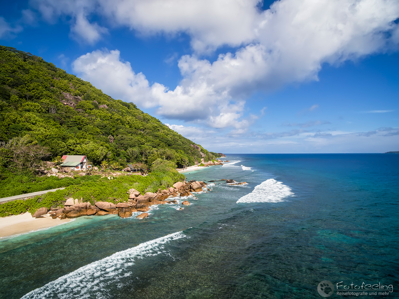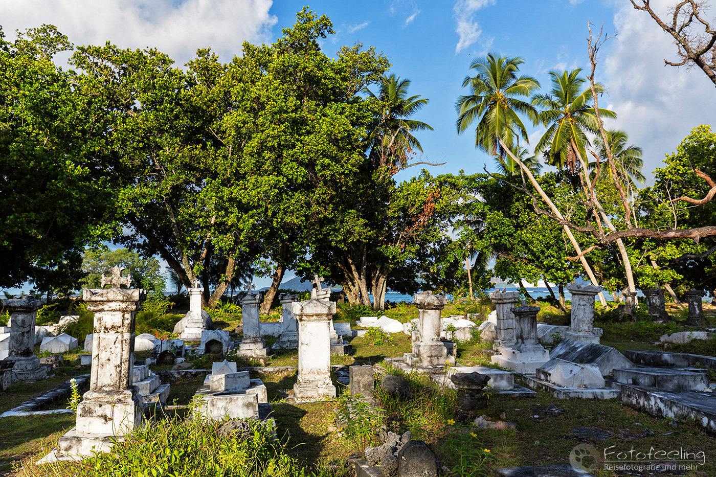 Mariannick hatte uns die einsamen Strände rechts vom Hotel empfohlen und so schulterten wir später am Nachmittag die Kamera und den Kopter und gingen los. Es ging leicht bergauf, vorbei an einem kleinen vom Meer gespeisten See, in dem ein Reiher stand. Krabben liefen vor uns davon und raschelten im Laub. An einer Betonbrücke zweigte nach links ein kleiner Weg ab, der uns bergauf durch den Wald auf einen Hügel führte. Rechts von uns lag ein kleiner alter Friedhof. Die Farbe war von einigen Steinen im Laufe der Zeit durch Regen abgewaschen, die Steine zum Teil leicht verwittert und verschoben, aber noch immer standen bunte Plastikblumen zur Erinnerung an den Grabstellen. Die Gräber lagen auf einer Wiese von Sträuchern umgeben und Palmen ragten im Hintergrund auf. Zwischen den Gräbern wuchs aus jungen Kokosnüssen neues Leben. Ein friedlicher Ort. Doch unser Ziel war der Pointe Ramasse Tout mit einem Kreuz und einer kleine Kapelle, die hoch oben auf der wilden Steilküste über dem Meer thronte. Hier hatten wir einen guten Blick auf den Anse Cimetiere, der von dieser wilden Landspitze begrenzt wird und weiter auf den Anse Lascars und den Anse Patates am Ende der Insel. Ca. 20 Kilometer entfernt ließen sich die Umrisse der Insel Mahé erkennen.