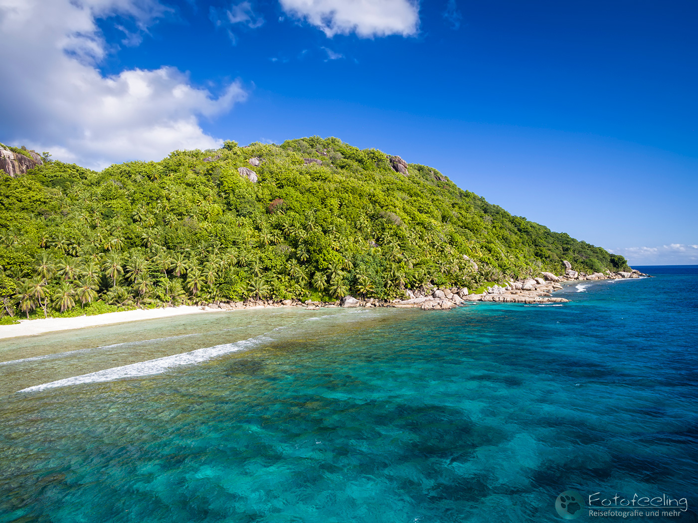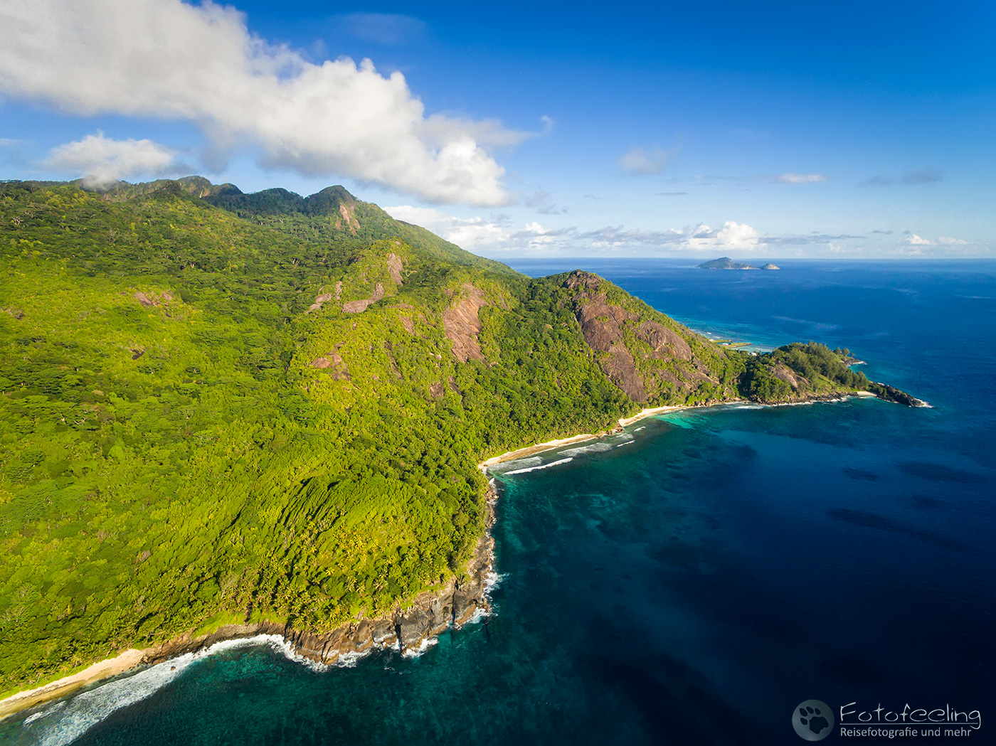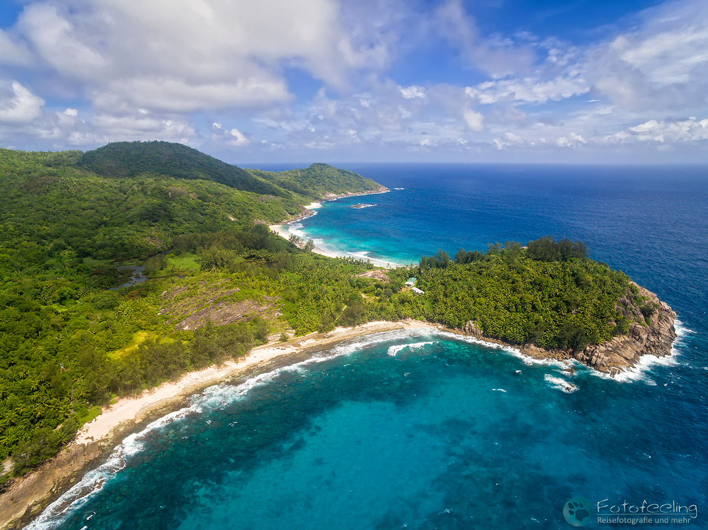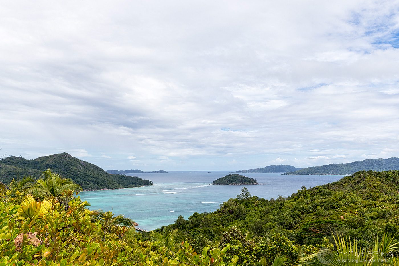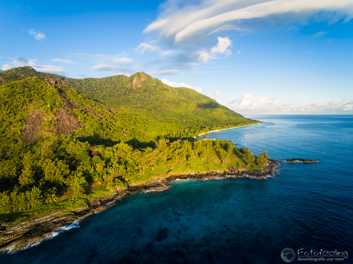 Mariannick hatte uns die einsamen Strände rechts vom Hotel empfohlen und so schulterten wir später am Nachmittag die Kamera und den Kopter und gingen los. Es ging leicht bergauf, vorbei an einem kleinen vom Meer gespeisten See, in dem ein Reiher stand. Krabben liefen vor uns davon und raschelten im Laub. An einer Betonbrücke zweigte nach links ein kleiner Weg ab, der uns bergauf durch den Wald auf einen Hügel führte. Rechts von uns lag ein kleiner alter Friedhof. Die Farbe war von einigen Steinen im Laufe der Zeit durch Regen abgewaschen, die Steine zum Teil leicht verwittert und verschoben, aber noch immer standen bunte Plastikblumen zur Erinnerung an den Grabstellen. Die Gräber lagen auf einer Wiese von Sträuchern umgeben und Palmen ragten im Hintergrund auf. Zwischen den Gräbern wuchs aus jungen Kokosnüssen neues Leben. Ein friedlicher Ort. Doch unser Ziel war der Pointe Ramasse Tout mit einem Kreuz und einer kleine Kapelle, die hoch oben auf der wilden Steilküste über dem Meer thronte. Hier hatten wir einen guten Blick auf den Anse Cimetiere, der von dieser wilden Landspitze begrenzt wird und weiter auf den Anse Lascars und den Anse Patates am Ende der Insel. Ca. 20 Kilometer entfernt ließen sich die Umrisse der Insel Mahé erkennen.