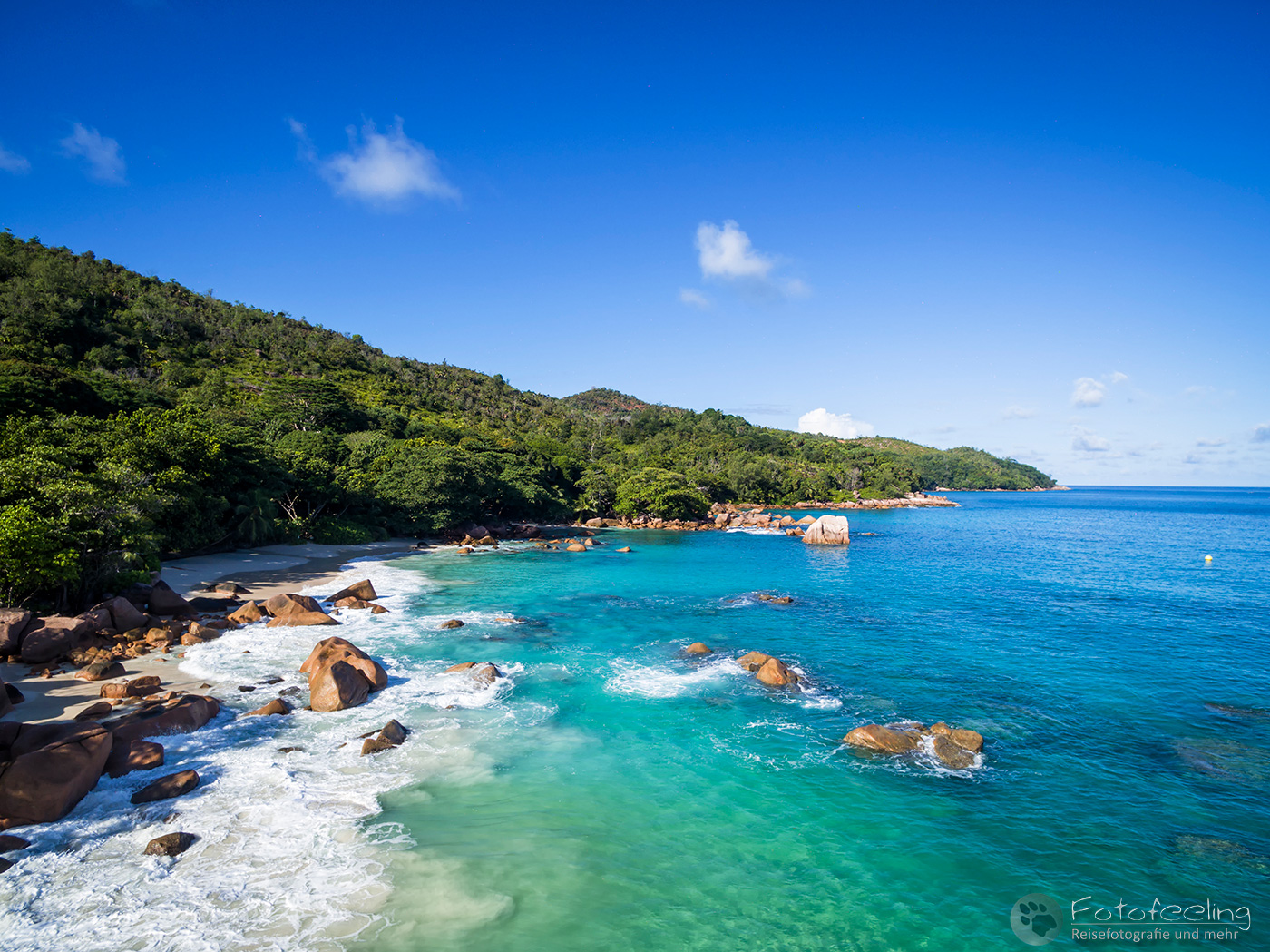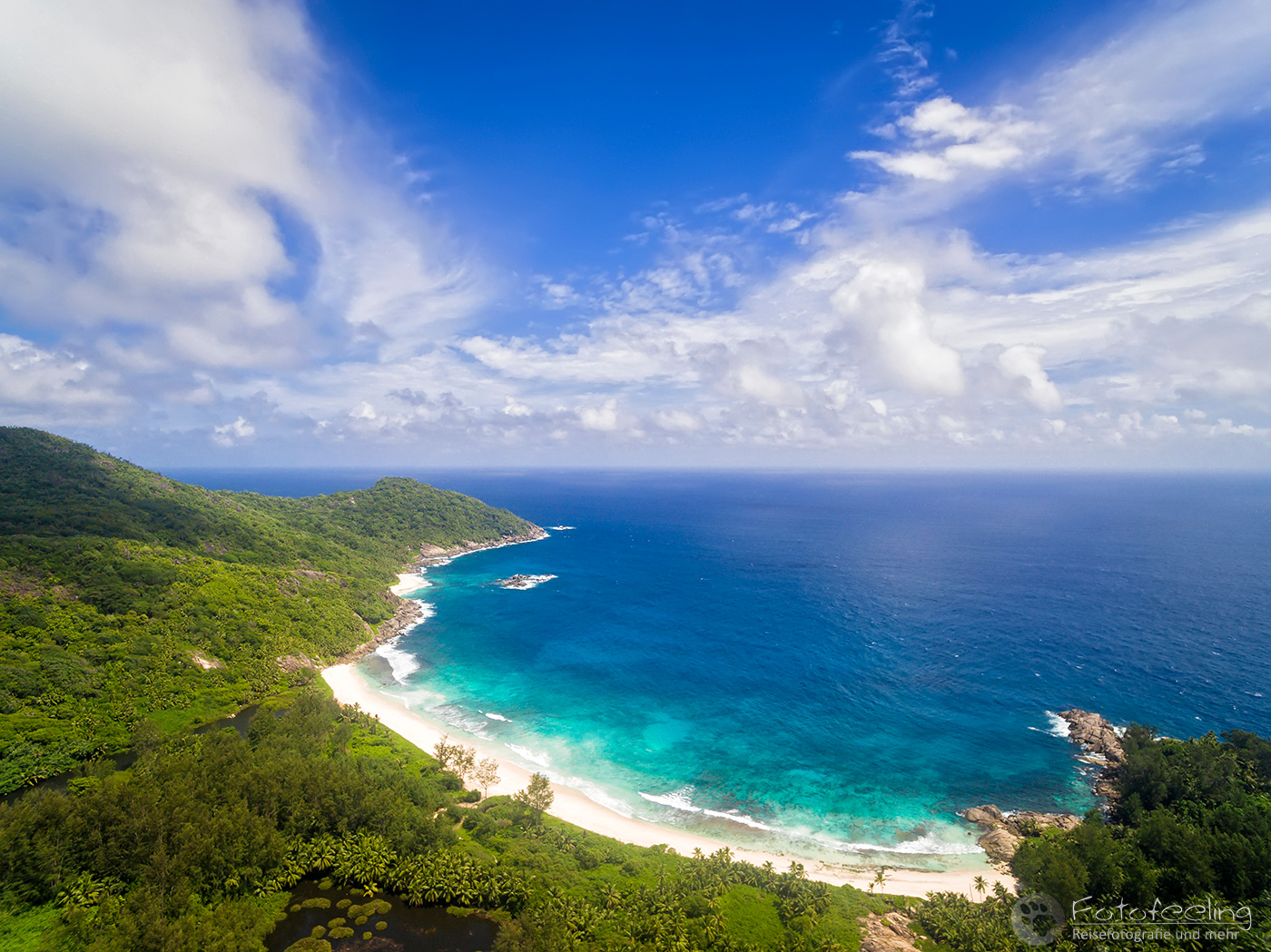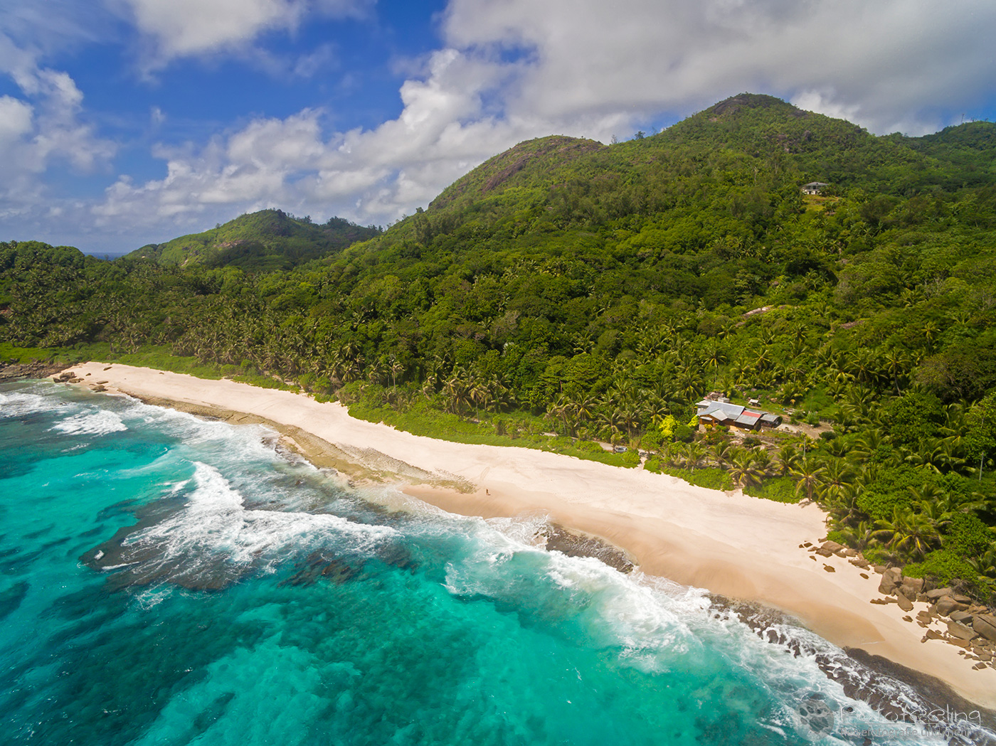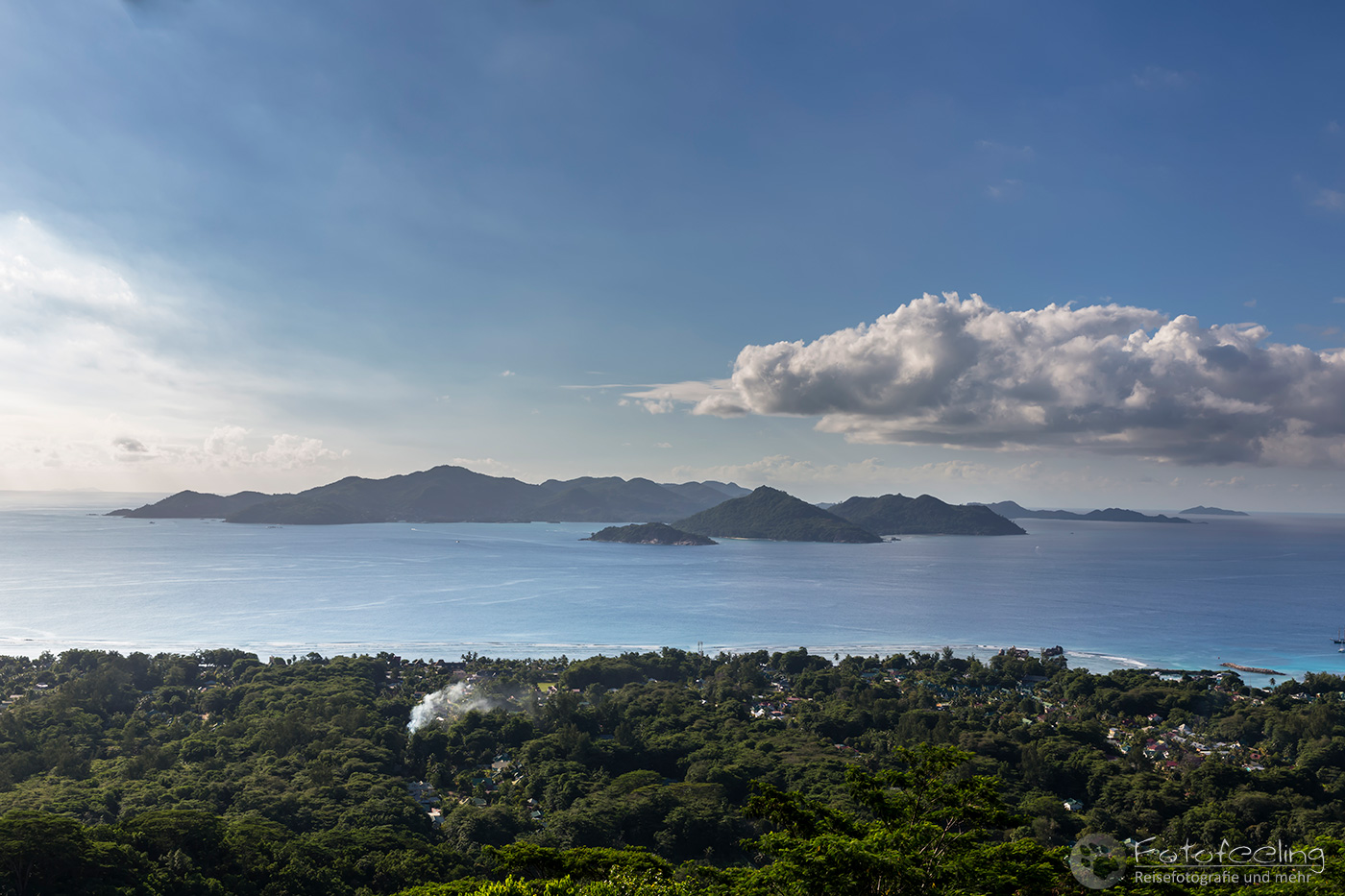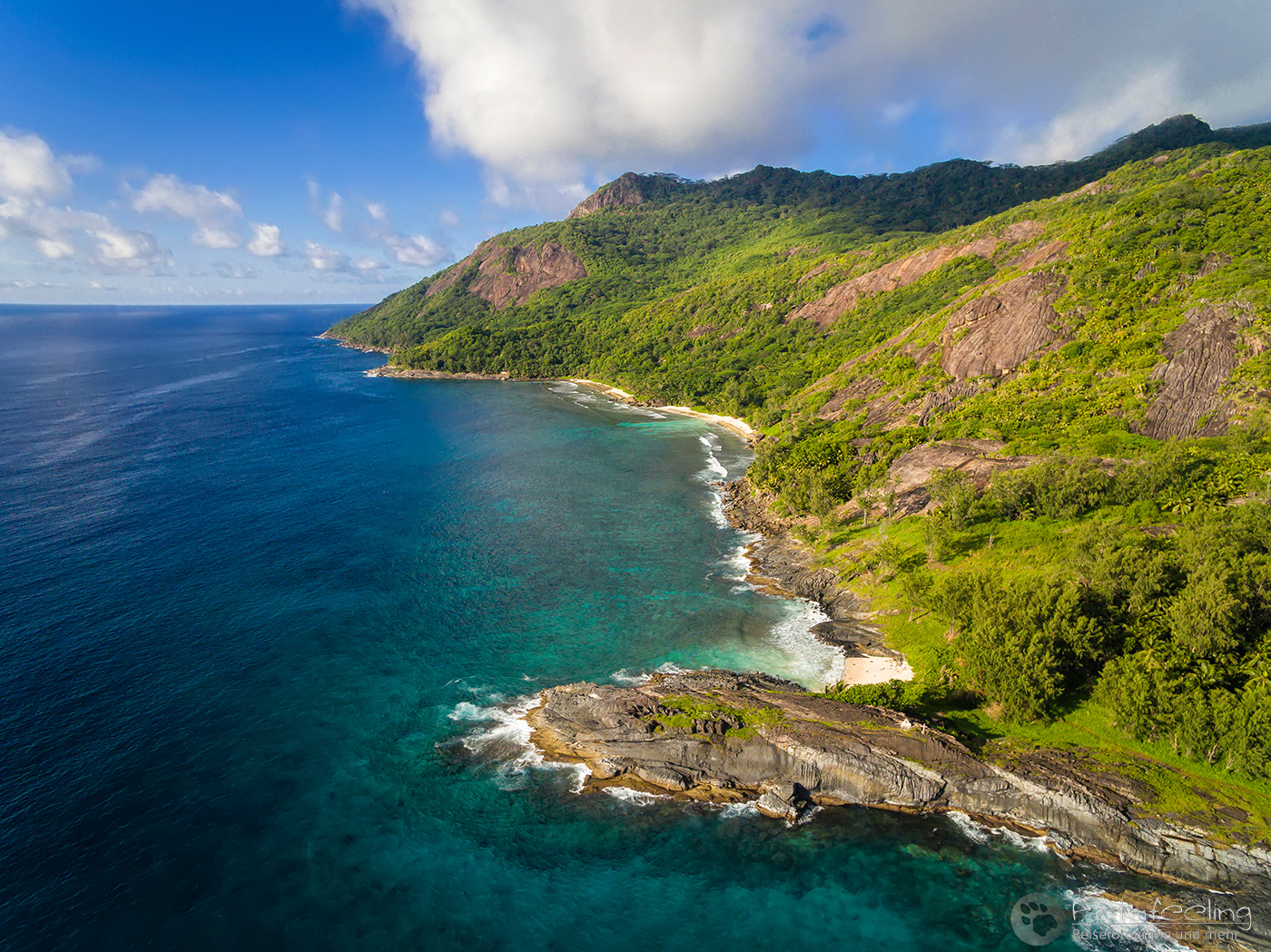 Mariannick hatte uns die einsamen Strände rechts vom Hotel empfohlen und so schulterten wir später am Nachmittag die Kamera und den Kopter und gingen los. Es ging leicht bergauf, vorbei an einem kleinen vom Meer gespeisten See, in dem ein Reiher stand. Krabben liefen vor uns davon und raschelten im Laub. An einer Betonbrücke zweigte nach links ein kleiner Weg ab, der uns bergauf durch den Wald auf einen Hügel führte. Rechts von uns lag ein kleiner alter Friedhof. Die Farbe war von einigen Steinen im Laufe der Zeit durch Regen abgewaschen, die Steine zum Teil leicht verwittert und verschoben, aber noch immer standen bunte Plastikblumen zur Erinnerung an den Grabstellen. Die Gräber lagen auf einer Wiese von Sträuchern umgeben und Palmen ragten im Hintergrund auf. Zwischen den Gräbern wuchs aus jungen Kokosnüssen neues Leben. Ein friedlicher Ort. Doch unser Ziel war der Pointe Ramasse Tout mit einem Kreuz und einer kleine Kapelle, die hoch oben auf der wilden Steilküste über dem Meer thronte. Hier hatten wir einen guten Blick auf den Anse Cimetiere, der von dieser wilden Landspitze begrenzt wird und weiter auf den Anse Lascars und den Anse Patates am Ende der Insel. Ca. 20 Kilometer entfernt ließen sich die Umrisse der Insel Mahé erkennen.