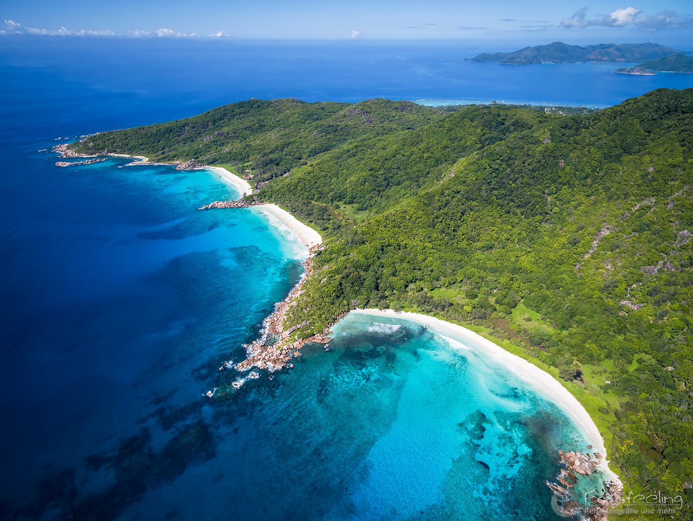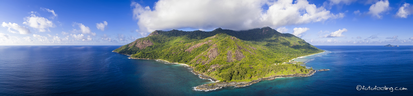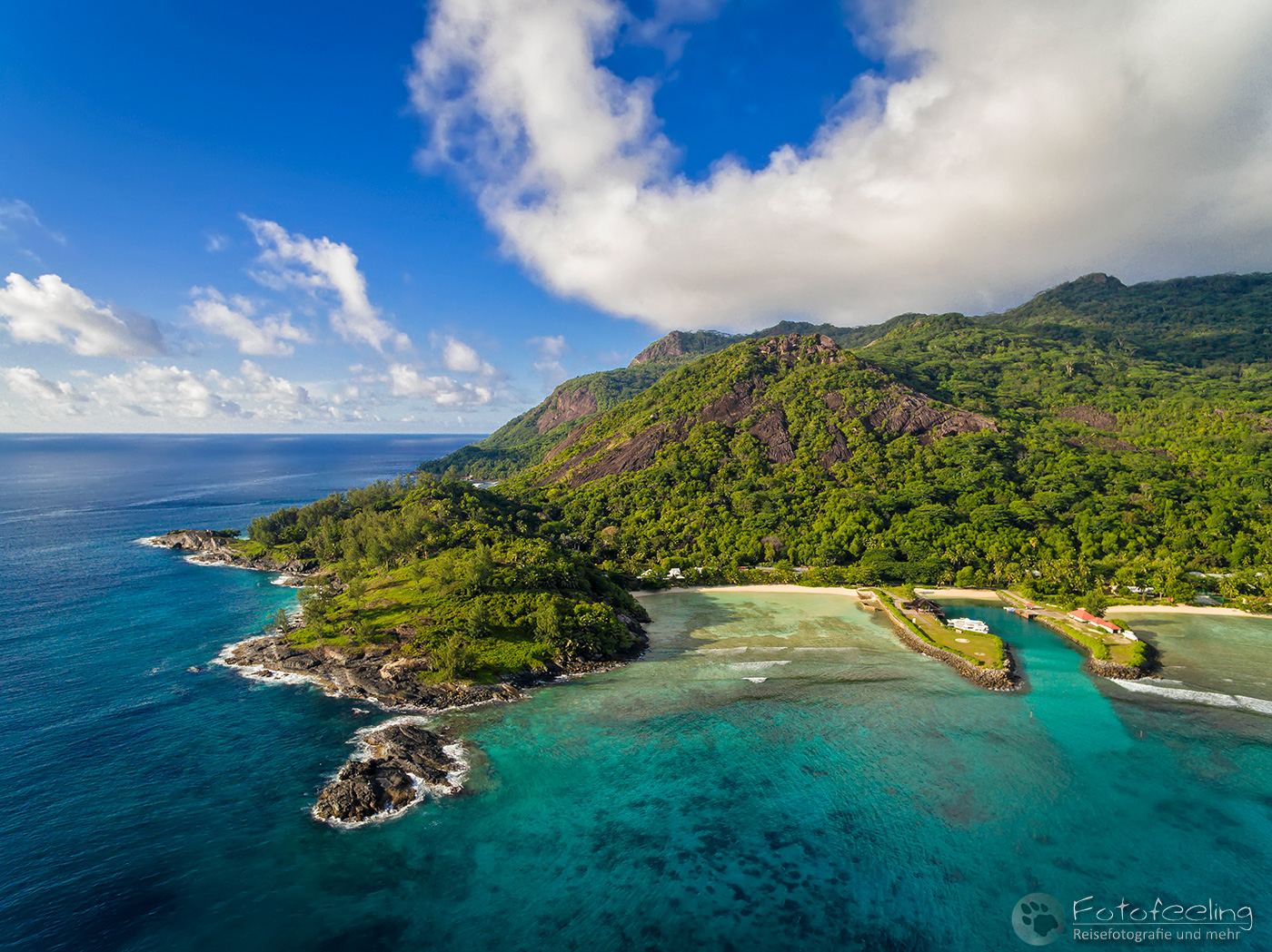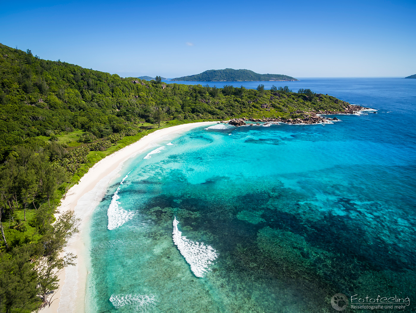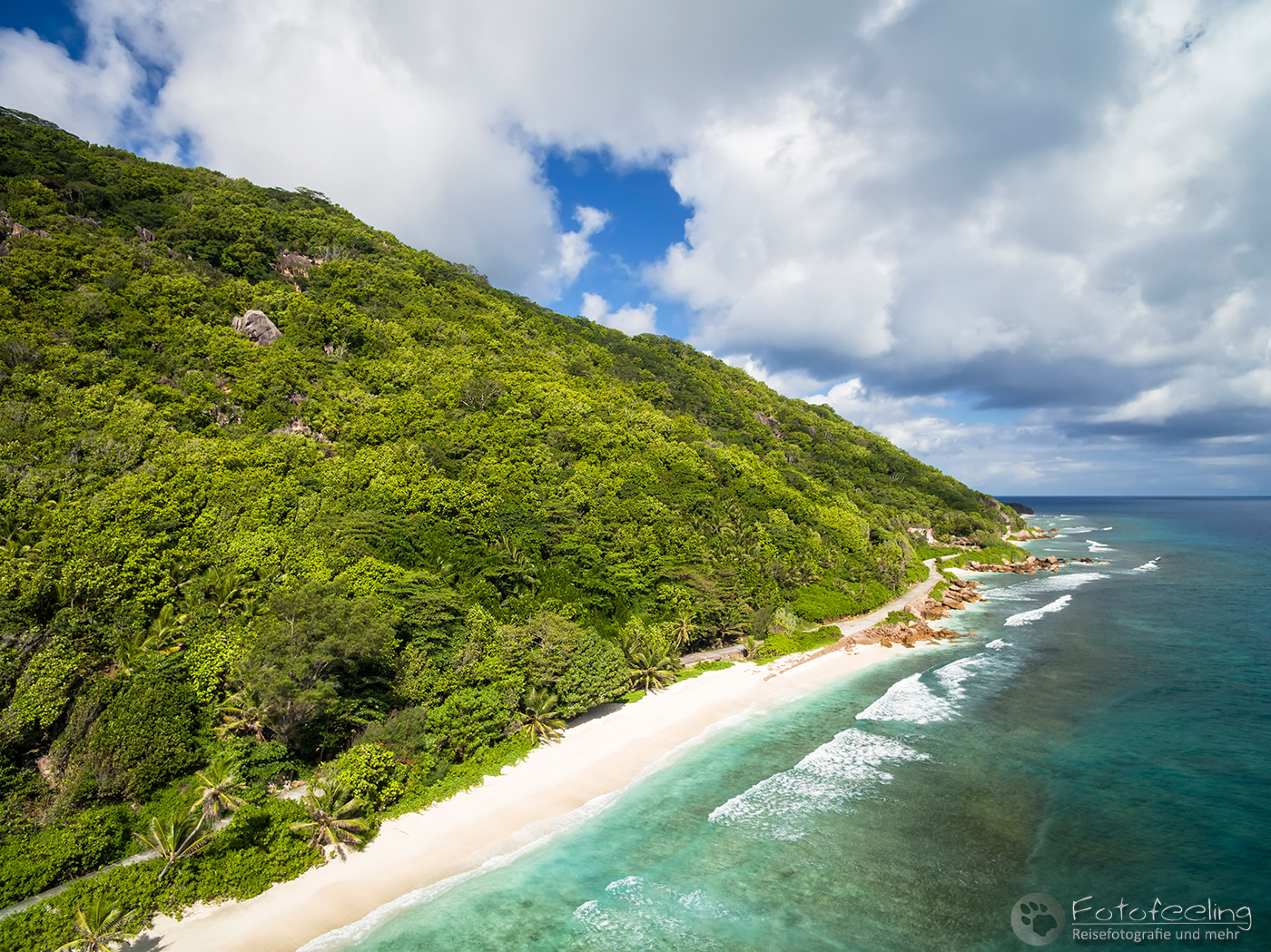 Mariannick hatte uns die einsamen Strände rechts vom Hotel empfohlen und so schulterten wir später am Nachmittag die Kamera und den Kopter und gingen los. Es ging leicht bergauf, vorbei an einem kleinen vom Meer gespeisten See, in dem ein Reiher stand. Krabben liefen vor uns davon und raschelten im Laub. An einer Betonbrücke zweigte nach links ein kleiner Weg ab, der uns bergauf durch den Wald auf einen Hügel führte. Rechts von uns lag ein kleiner alter Friedhof. Die Farbe war von einigen Steinen im Laufe der Zeit durch Regen abgewaschen, die Steine zum Teil leicht verwittert und verschoben, aber noch immer standen bunte Plastikblumen zur Erinnerung an den Grabstellen. Die Gräber lagen auf einer Wiese von Sträuchern umgeben und Palmen ragten im Hintergrund auf. Zwischen den Gräbern wuchs aus jungen Kokosnüssen neues Leben. Ein friedlicher Ort. Doch unser Ziel war der Pointe Ramasse Tout mit einem Kreuz und einer kleine Kapelle, die hoch oben auf der wilden Steilküste über dem Meer thronte. Hier hatten wir einen guten Blick auf den Anse Cimetiere, der von dieser wilden Landspitze begrenzt wird und weiter auf den Anse Lascars und den Anse Patates am Ende der Insel. Ca. 20 Kilometer entfernt ließen sich die Umrisse der Insel Mahé erkennen.