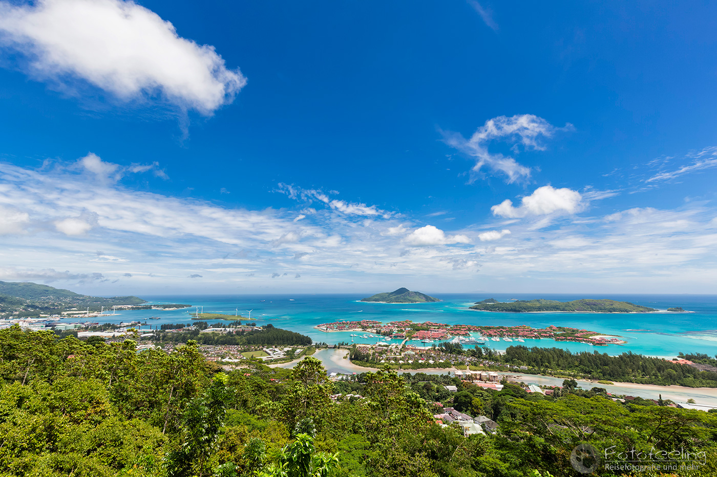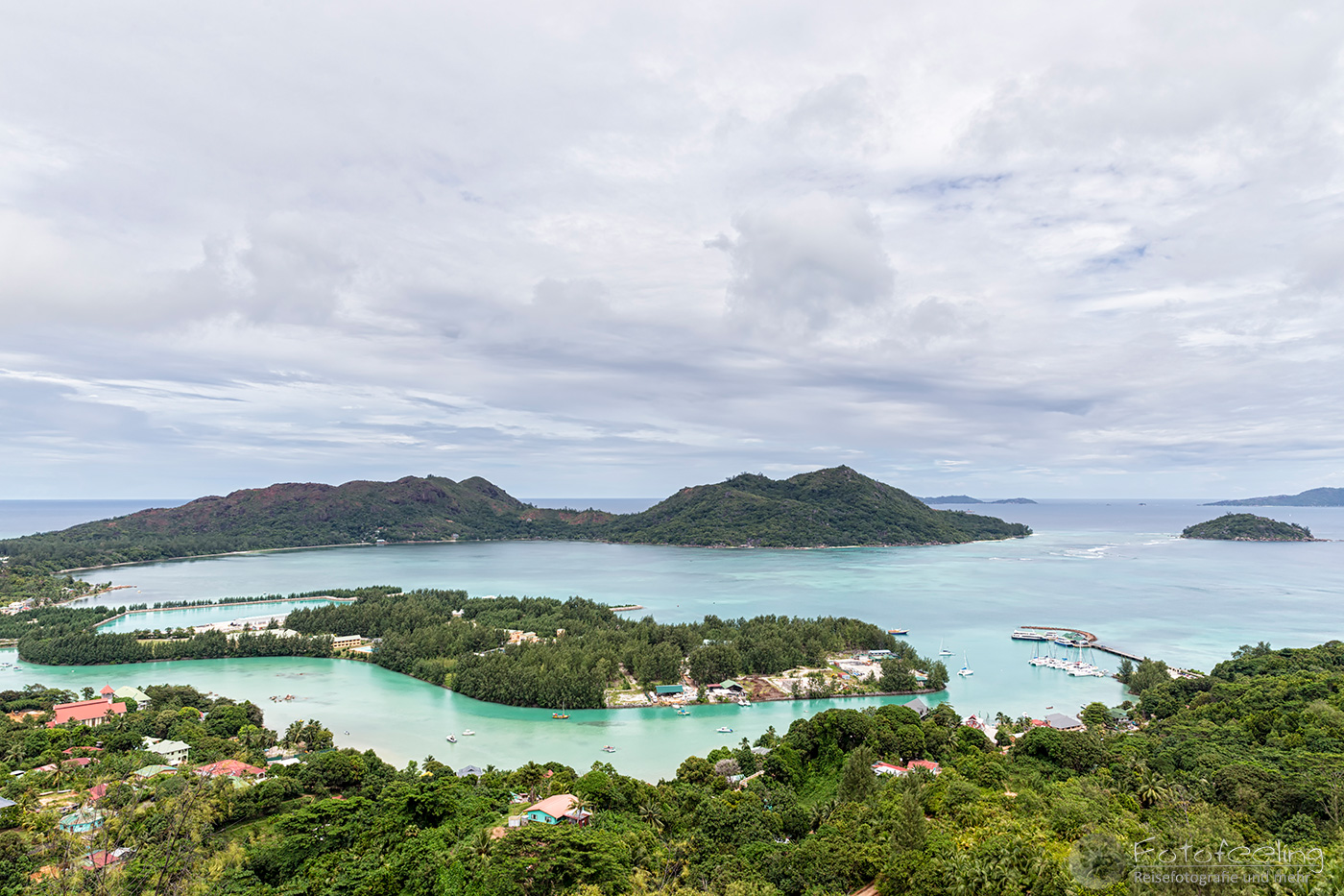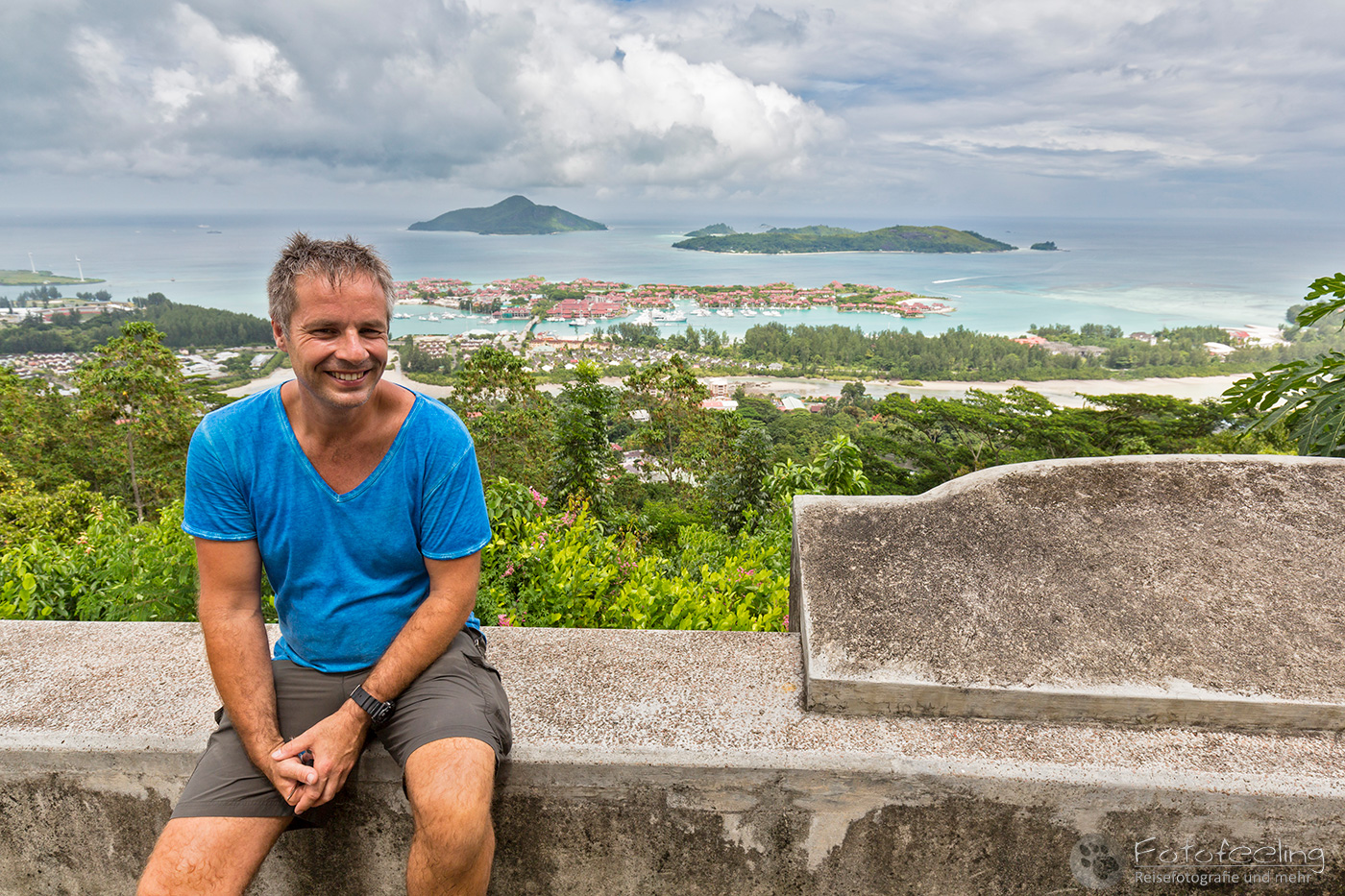 Gegen Mittag fuhren wir wieder nach Port Launay Süd zum Restaurant Del Place. Hier wollten wir noch einmal richtig gut zu Mittag essen. Diesmal war zwar kein Wind, dafür zog es zu und fing an zu regnen. Wieder mussten wir uns unter den überdachten Teil der Terrasse zurückziehen. Mit dem Sitzen auf der Terrasse hatten wir hier einfach kein Glück. dafür schmeckte das Essen wieder besonders gut. Chris aß Red Snapper mit Passionsfruchtsoße und ich Prawns im Wok mit gebratenem Reis. Das war wirklich fantastisch. Satt und zufrieden machten wir uns auf den Rückweg und fuhren diesmal die Panoramastraße Sans Souci Road, die durch üppig grüne Natur des Mome-Seychellois-Nationalparks mit verschiedenen endemischen Pflanzen führte. Dafür schraubte sich unser Auto in Serpentinen ganz schön hoch und wieder hinab an die Ostküste von Mahé in der Hauptstadt Victoria. Doch vorher hielten wir noch an einem Aussichtspunkt auf Victoria und Eden Island. Wir hatten sogar etwas Licht und machten ein paar Bilder.