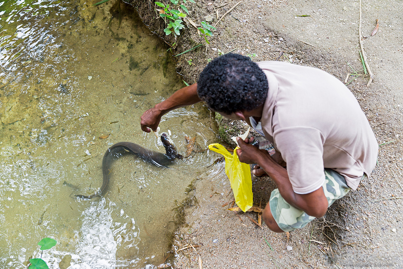 Als wir zurückgingen, machten wir noch eine Pause an einem kleinen Bach. In dem wartete schon ein Aal, der von unserem Führer gefüttert wurde und der dabei fast aus dem Wasser schoss, um etwas Brot zu ergattern. Auch etliche andere Fische und einige Shrimps hatten sich versammelt, um etwas von dem Festmahl abzubekommen. Der Ausflug hatte sich echt gelohnt. Wir waren ca. 1,5 Stunden unterwegs.