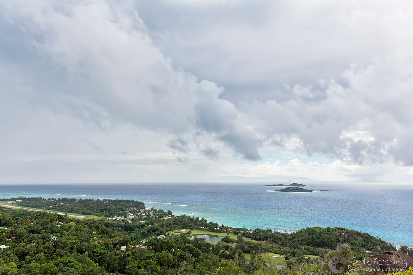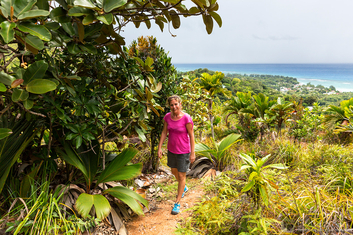 Da das Wetter immer noch sehr zugezogen war, beschlossen wir, auf den kleinen Aussichtsberg oberhalb des Anse Kerlan zu steigen. Wir fuhren am Golfplatz vorbei und parkten unser Auto am Umkehrpunkt der Busse. Gleich an der Einfahrt zweigte links ein kleiner schmalen Weg ab, der steil bergauf führte. Ein unscheinbarer Wegweiser bestätigte uns, dass wir richtig waren. Es ging über matschigen Boden, rutschige Steine und sehr steil hinauf. Natürlich waren wir innerhalb kurzer Zeit wieder pitschnass und außer Atem. Doch wir kämpften uns stetig aufwärts. Von oben hatten wir einen guten Blick auf unseren Strand und den kleinen Ort, den Flughafen und in die andere Richtung konnten wir etwas von der wunderschönen Bucht des Anse Georgette erahnen.