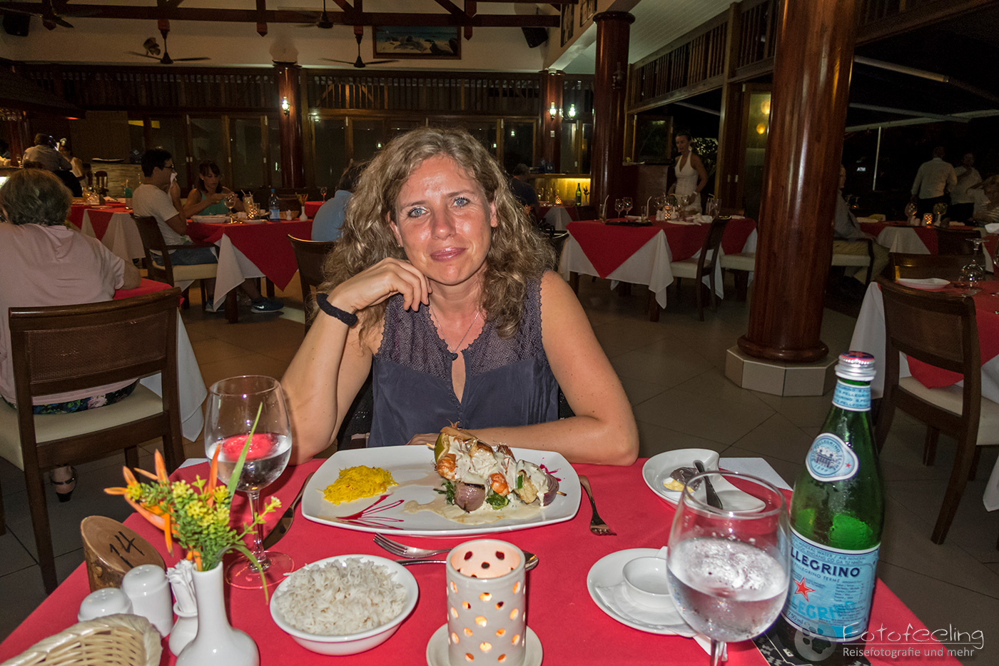 Für den Abend hatte Chris eigentlich im Le Duc reserviert, das an diesem Abend Seafoodbuffet haben sollte. Kein billiger Spaß übrigens, aber für das Buffet wollten wir den Preis zahlen. Als wir jedoch ankamen - Chris hatte extra eine geforderte lange Hose an und das bei 30 Grad - gab es auf Grund von Gästemangel doch nur á la Carte und das für den gleichen Preis. Das ärgerte uns schon sehr, denn das hätte man uns gestern auch schon mitteilen können. Gut, dass es Frauen da einfacher haben und so fühlte ich mich mit meinem Kleidchen nicht zu warm angezogen, während Chris ein wenig der Schweiß auf der Stirn stand. Da das Laurier auch zu hatte, wanderten wir weiter vor zum Restaurant Pirogue und hatten Glück, denn wir bekamen einen schönen Tisch. Das Essen war wieder Weltklasse. Ich nahm den Tagesfang mit kreolischer Soße und Chris die Krabben in Kokosingwer Soße. Eigentlich hätte er es besser wissen müssen, denn es ist jedes Mal ein anstrengender Job, das Fleisch aus den Scheren zu bekommen, so mühte der Arme sich reichlich, auch wenn es geschmacklich klasse war.