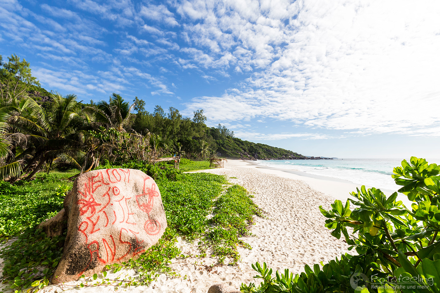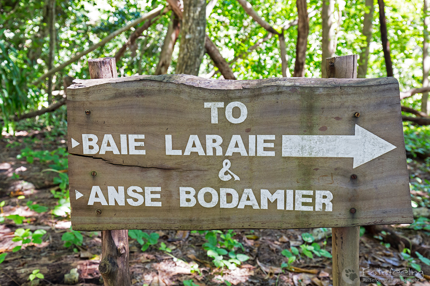 Am Grand Anse gibt es eine Bar. Der Strand ist weiß und die Bucht weitläufig. In allen Blautönen schimmerte das Wasser und große Wellen rauschten an den Strand. Hier wurde vor gefährlichen Strömungen gewarnt und man sollte nicht zu weit ins Wasser gehen. Am Strand aalten sich einige Leute und zwei winzig kleine Hundewelpen lagen im Halbschatten und spielten miteinander. Das Wasser lud nach der anstrengenden Radpartie zum Baden ein. Aber zum Baden war natürlich keine Zeit, denn Chris wollte weiter zum Anse Petite, der nächsten Bucht. Mit Schweißperlen auf der Stirn und heraushängender Zunge, suchten wir den Weg und begaben uns ins Landesinnere. Ein schmaler Pfad führte uns über ein Flüsschen. An einer morastigen Fläche balancierte Chris geschickt über die Holzbalken, während ich etwas weniger geschickt und undamenhaft mit dem Fuß in den Schlamm platschte und das Gesicht verzog, als der Schlamm zwischen meinen Zehen hervorquoll. Doch es war keine Zeit zum Jammern, weiter ging es bergauf über Steine und dann wieder bergab, bis wir die Bucht Anse Petite erreichten. Ein witzig bemalter Stein begrüßte uns. Hier war deutlich weniger los. Am Strand stand ein Schirm, den man wohl als Schattenspender mieten konnte. Die Bucht war kleiner und dadurch noch etwas netter. Schatten suchte man hier aber auch vergeblich. Wir gingen am Strand entlang bis wir den Weg zum nächsten Strand entdeckten. Wieder führte der Weg durch das Landesinnere, über Felsen ging es zuerst bergauf und das ziemlich stramm. Danach mussten wir alles wieder hinunter. Der Weg war ganz schön matschig und rutschig und eigentlich nichts für Flipflops. Doch irgendwie ging es, auch wenn wir uns unsere Travelersandalen an die Füße wünschten.