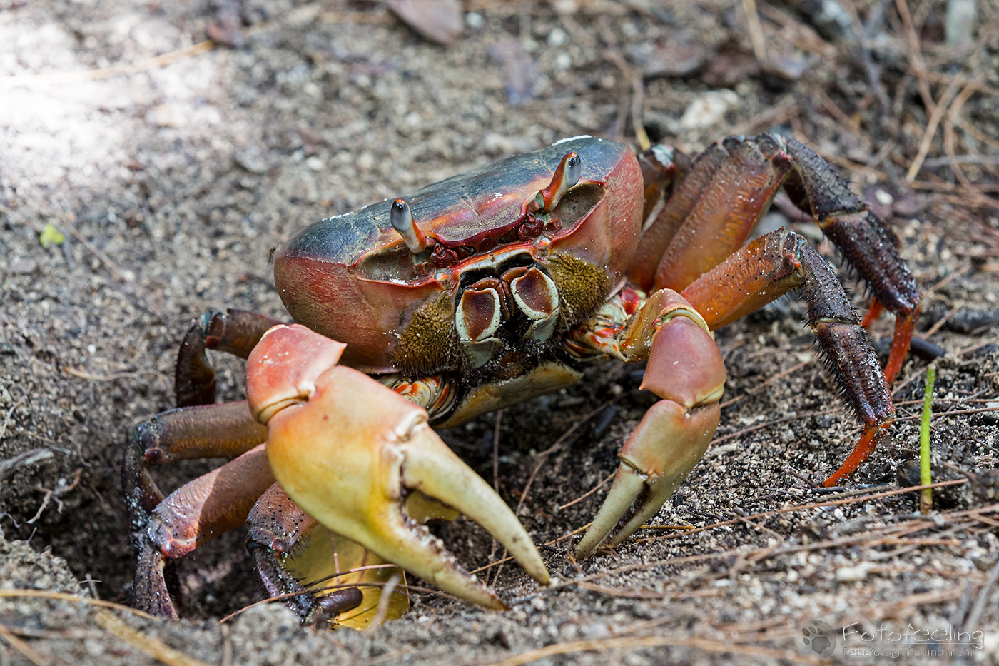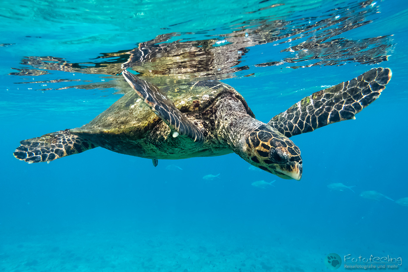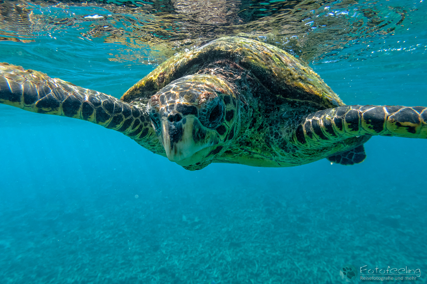 Wir badeten kurz und wanderten über die Insel durch zahlreiche Mangroven. Der Weg an sich war kurz, aber die Mücken sehr lästig. Unterwegs sahen wir viele Krabben und auf einmal stand uns eine Riesenschildkröte gegenüber. Diese Urzeitgiganten in Freiheit zu sehen, ist schon etwas Besonderes. Sie beäugte uns und nahm Kurs auf eine junge Kokospalme, deren frische Blätter sie genüsslich fraß. Dann streckte sie uns den Hals entgegen. Das war wohl eine Kraulaufforderung, der wir gerne nachkamen.