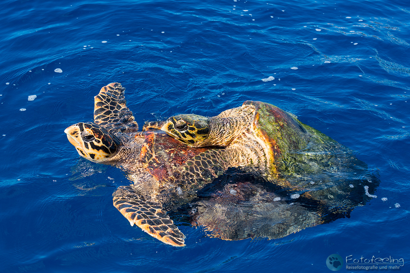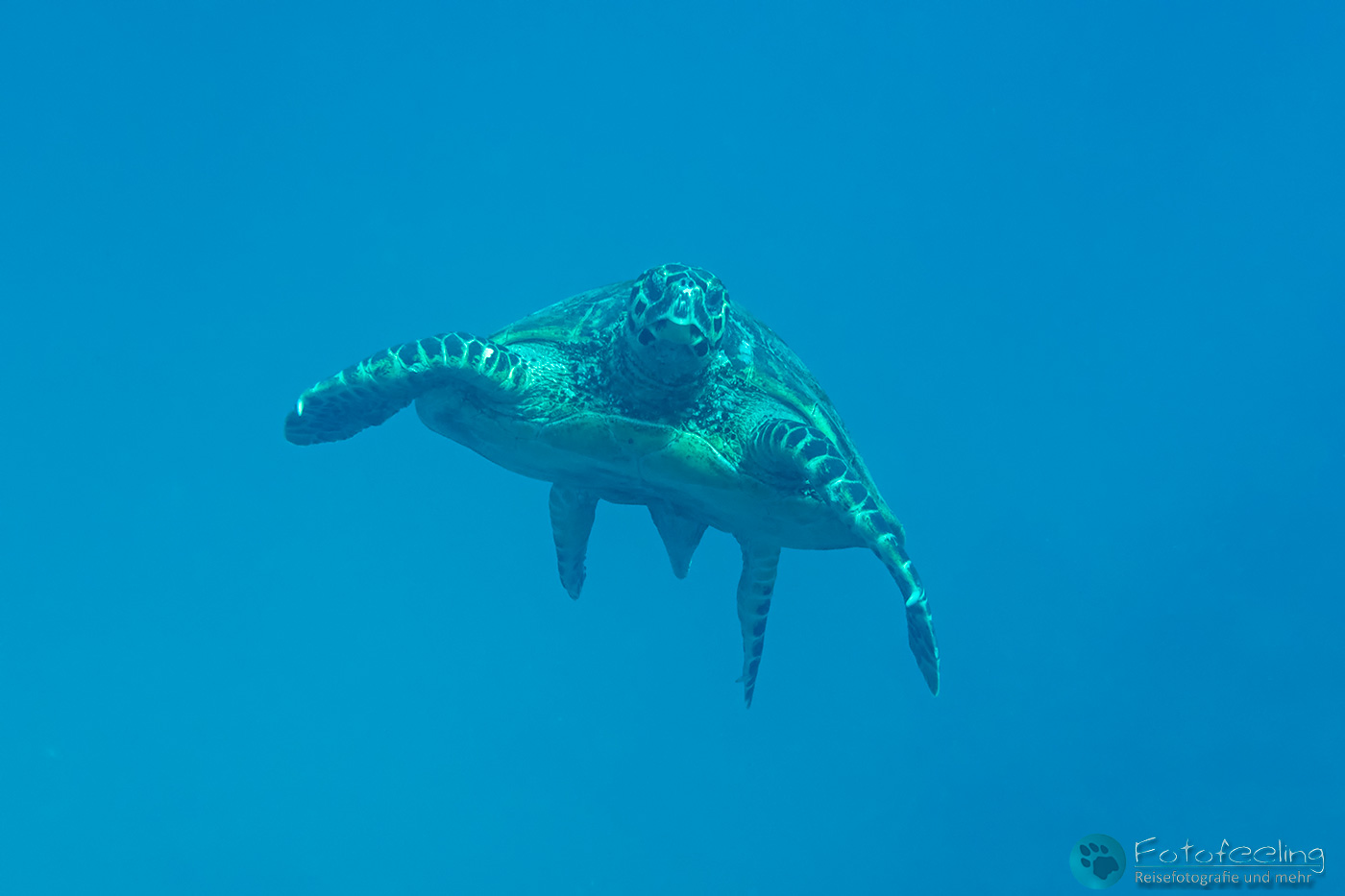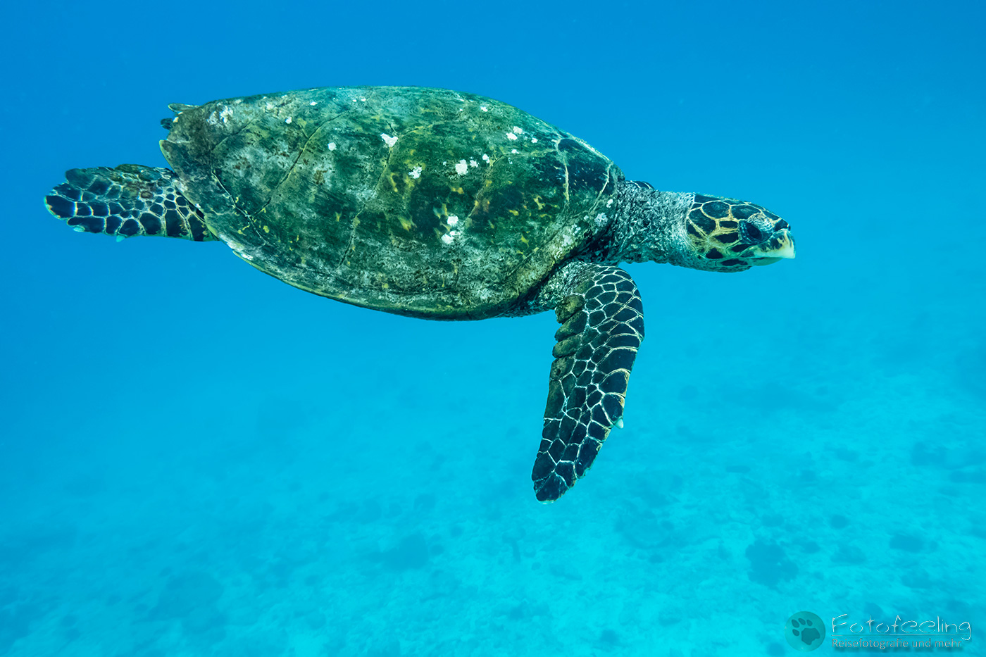Wir badeten kurz und wanderten über die Insel durch zahlreiche Mangroven. Der Weg an sich war kurz, aber die Mücken sehr lästig. Unterwegs sahen wir viele Krabben und auf einmal stand uns eine Riesenschildkröte gegenüber. Diese Urzeitgiganten in Freiheit zu sehen, ist schon etwas Besonderes. Sie beäugte uns und nahm Kurs auf eine junge Kokospalme, deren frische Blätter sie genüsslich fraß. Dann streckte sie uns den Hals entgegen. Das war wohl eine Kraulaufforderung, der wir gerne nachkamen.