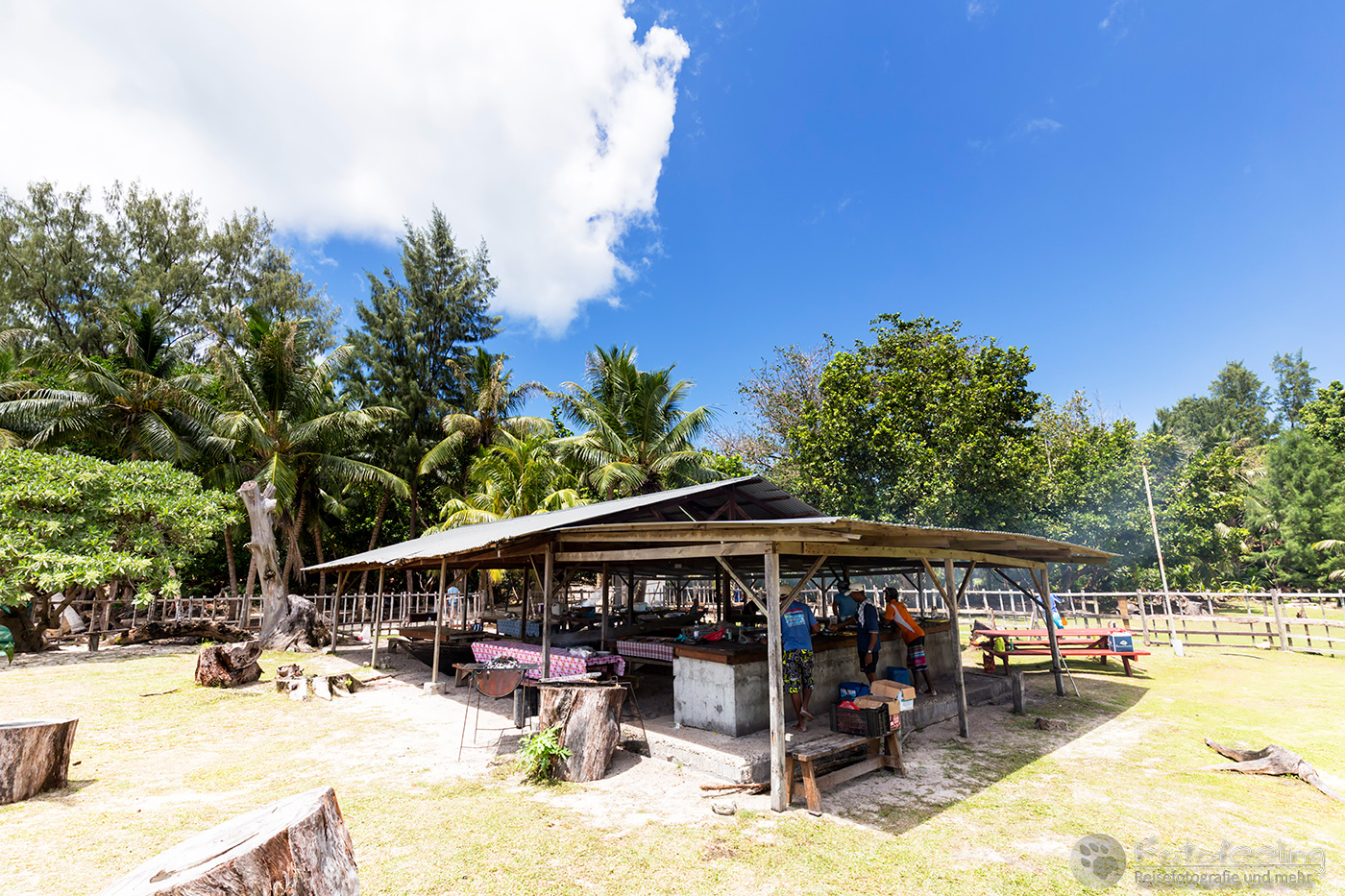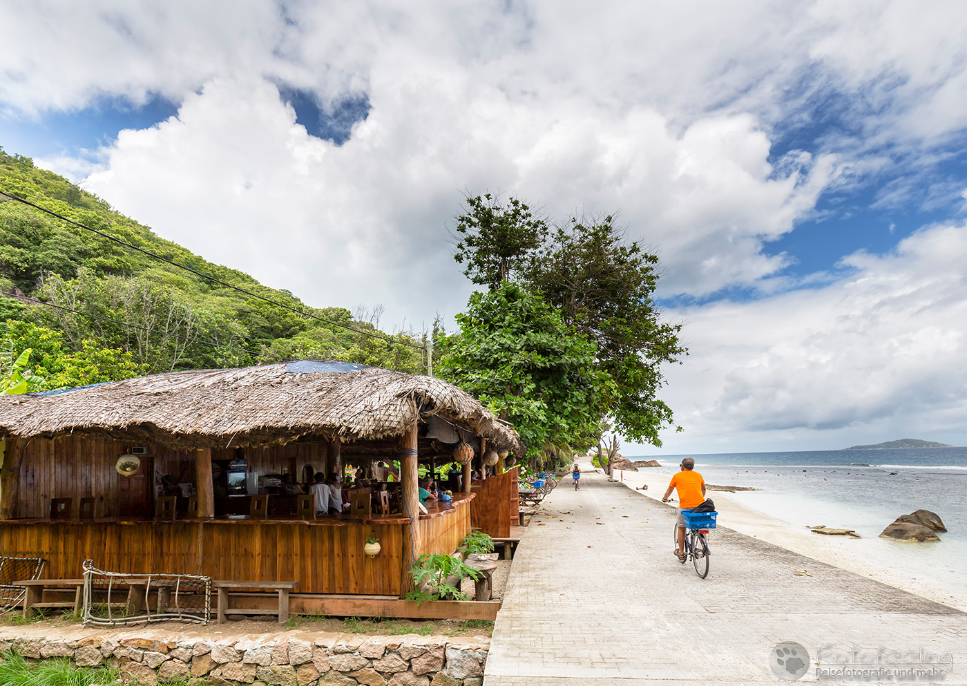 Weiter ging es zum Anse Lazio. Auf einem kleinen Parkplatz stellten wir unser Auto ab. Ein holpriger Weg führte uns zu einem weiteren Parkplatz und dem Restaurant Le Chevalier. Etwas weiter links war ein zweites Restaurant, das Bonbon Plume, das uns Natalie wegen der guten Mittagsküche sehr empfohlen hatten, aber welches wir leider während unseres Aufenthalts auf Praslin nicht besuchten.