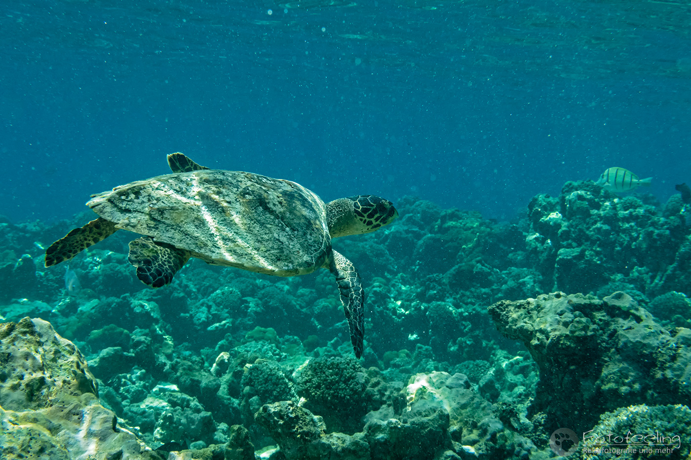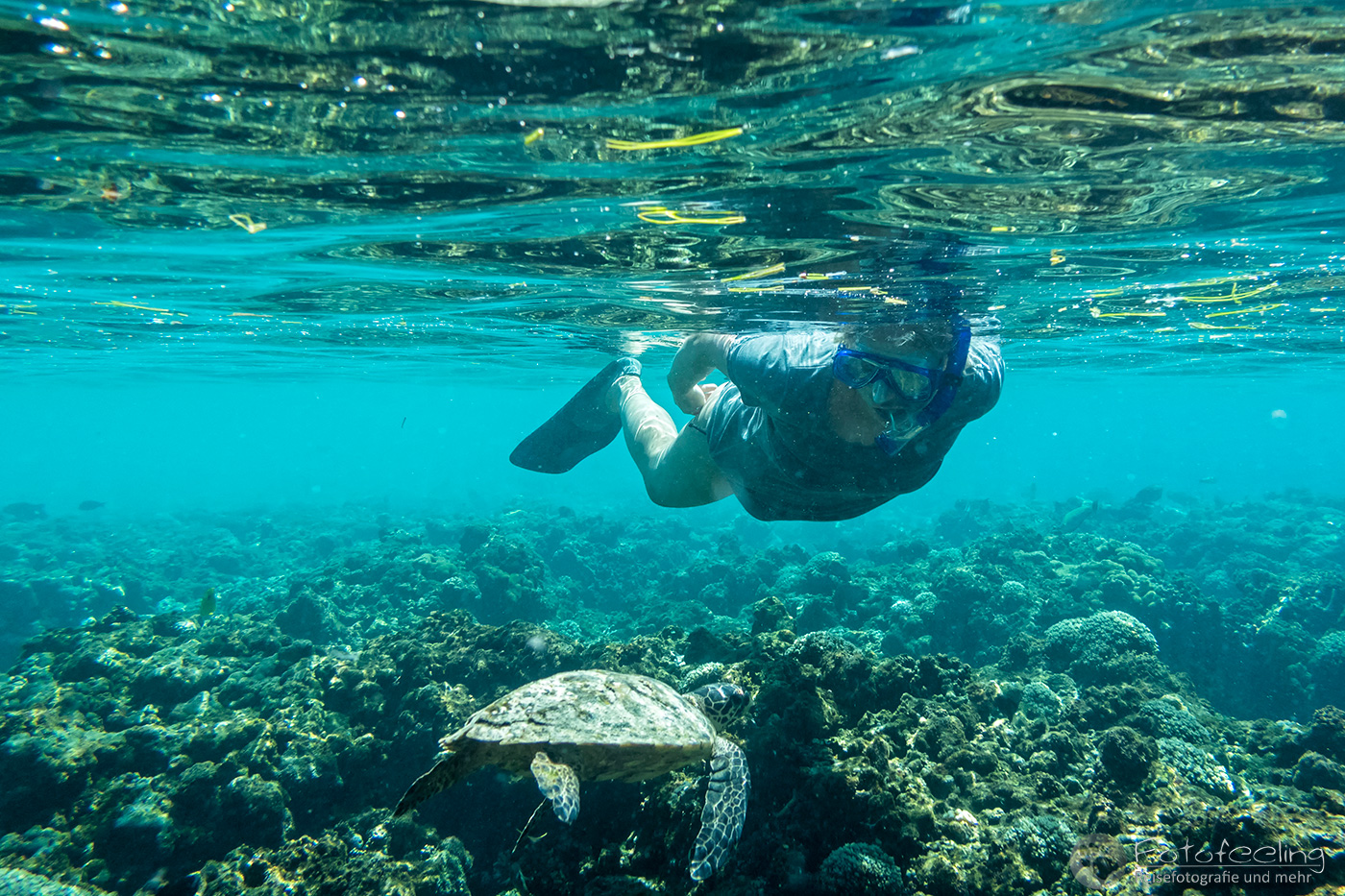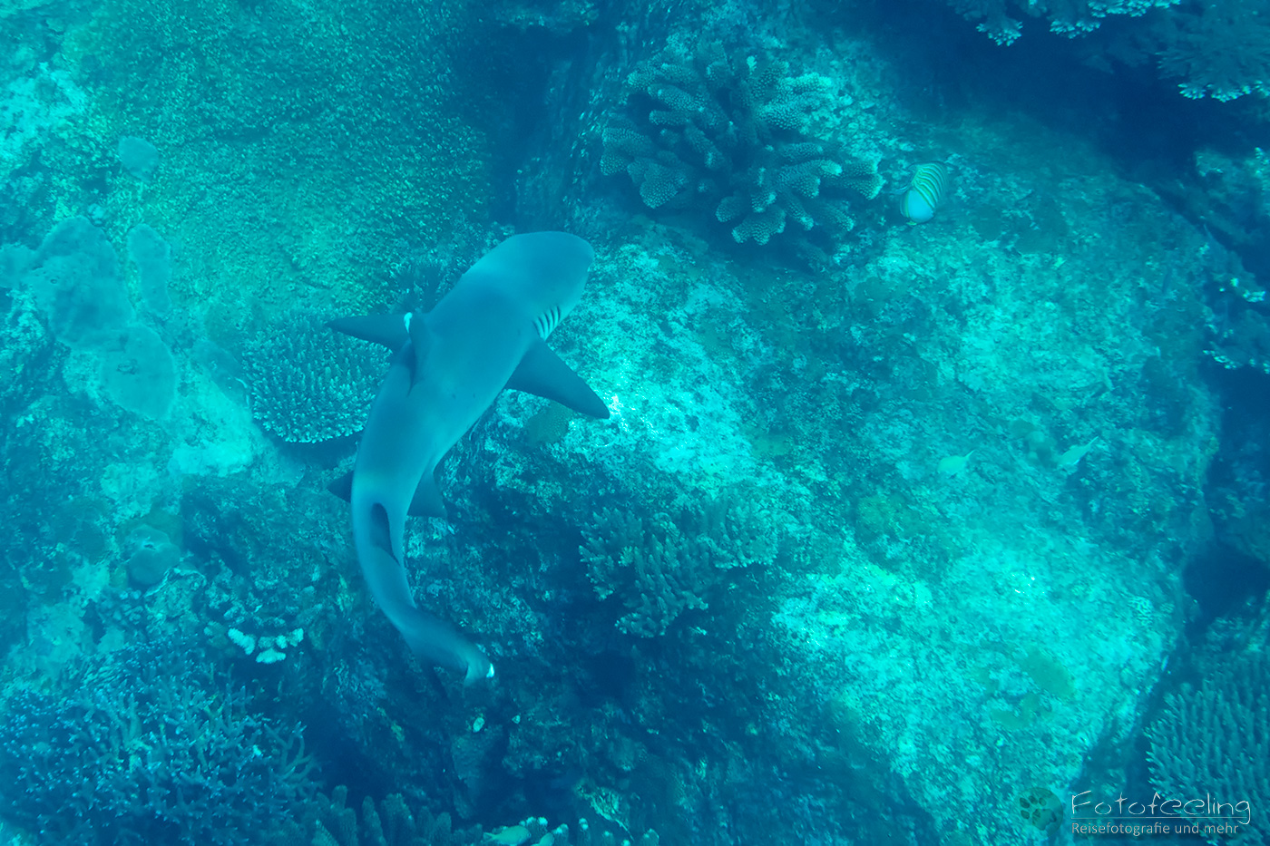 Nach dem Frühstück buchte Chris einen Schnorchel-Ausflug für den Nachmittag. Wir blieben am Hausstrand und vertrieben uns die Zeit mit baden und lesen. Zum Mittag gab es frische Kokosnuss. Es ging uns wirklich nicht schlecht und erstaunlicherweise kamen wir mit dem Nichtstun sehr gut zurecht. Aber ganz so langweilig war es ja nicht, denn um 14 Uhr gingen wir zur Jetty vor, wo das Tauchboot ankerte. Mit uns waren noch ein Paar zum Schnorcheln an Bord und ein Taucher. Wir bekamen Westen an und schnorchelten an einem Steilriff vor der Küste entlang. Leider lag die Unterwasserwelt meist relativ weit unter uns, aber wir sahen einen Weißspitzenriffhai, zwei Schwarzspitzenriffhaie, einen Adlerrochen, zwei Schildkröten und viele bunte Fische. Das Riff war sehr verspielt und interessant, so gab es Bögen und Höhlen und viele bunte Korallen. Das Meer war etwas aufgewühlt und die Wellen dadurch höher, aber davon bekam man vor lauter Faszination unter Wasser wenig mit.