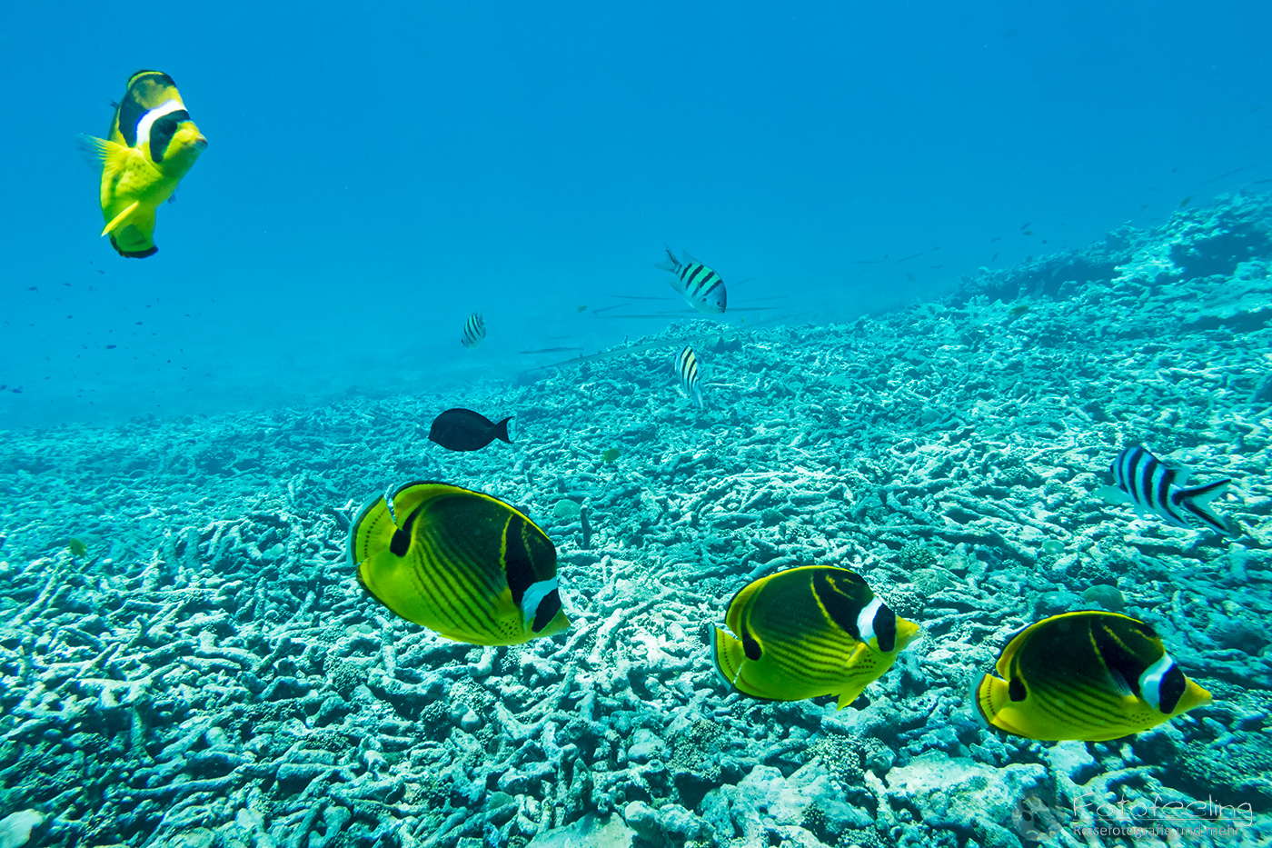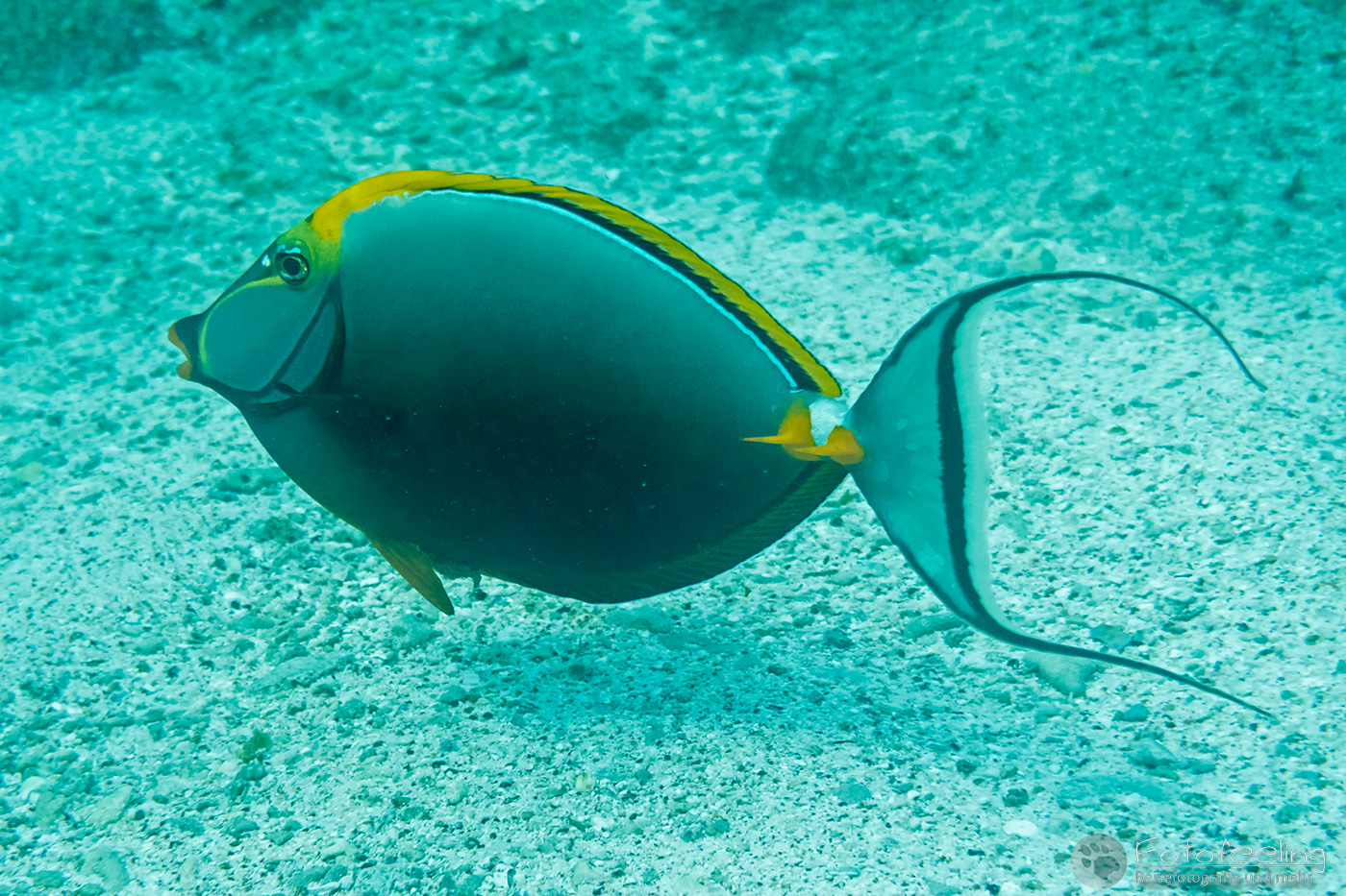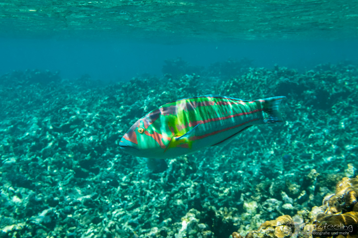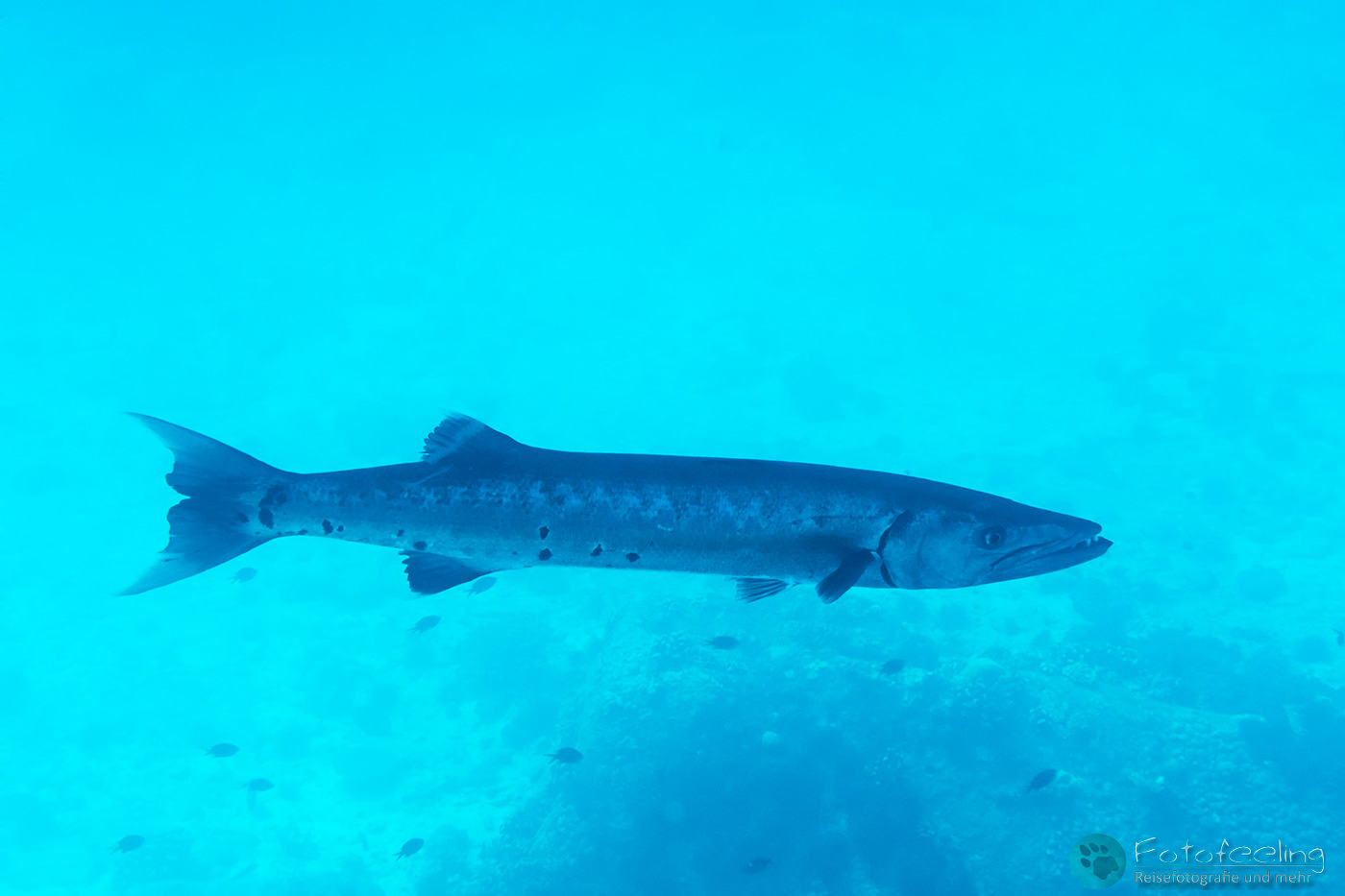Nach dem Frühstück buchte Chris einen Schnorchel-Ausflug für den Nachmittag. Wir blieben am Hausstrand und vertrieben uns die Zeit mit baden und lesen. Zum Mittag gab es frische Kokosnuss. Es ging uns wirklich nicht schlecht und erstaunlicherweise kamen wir mit dem Nichtstun sehr gut zurecht. Aber ganz so langweilig war es ja nicht, denn um 14 Uhr gingen wir zur Jetty vor, wo das Tauchboot ankerte. Mit uns waren noch ein Paar zum Schnorcheln an Bord und ein Taucher. Wir bekamen Westen an und schnorchelten an einem Steilriff vor der Küste entlang. Leider lag die Unterwasserwelt meist relativ weit unter uns, aber wir sahen einen Weißspitzenriffhai, zwei Schwarzspitzenriffhaie, einen Adlerrochen, zwei Schildkröten und viele bunte Fische. Das Riff war sehr verspielt und interessant, so gab es Bögen und Höhlen und viele bunte Korallen. Das Meer war etwas aufgewühlt und die Wellen dadurch höher, aber davon bekam man vor lauter Faszination unter Wasser wenig mit.