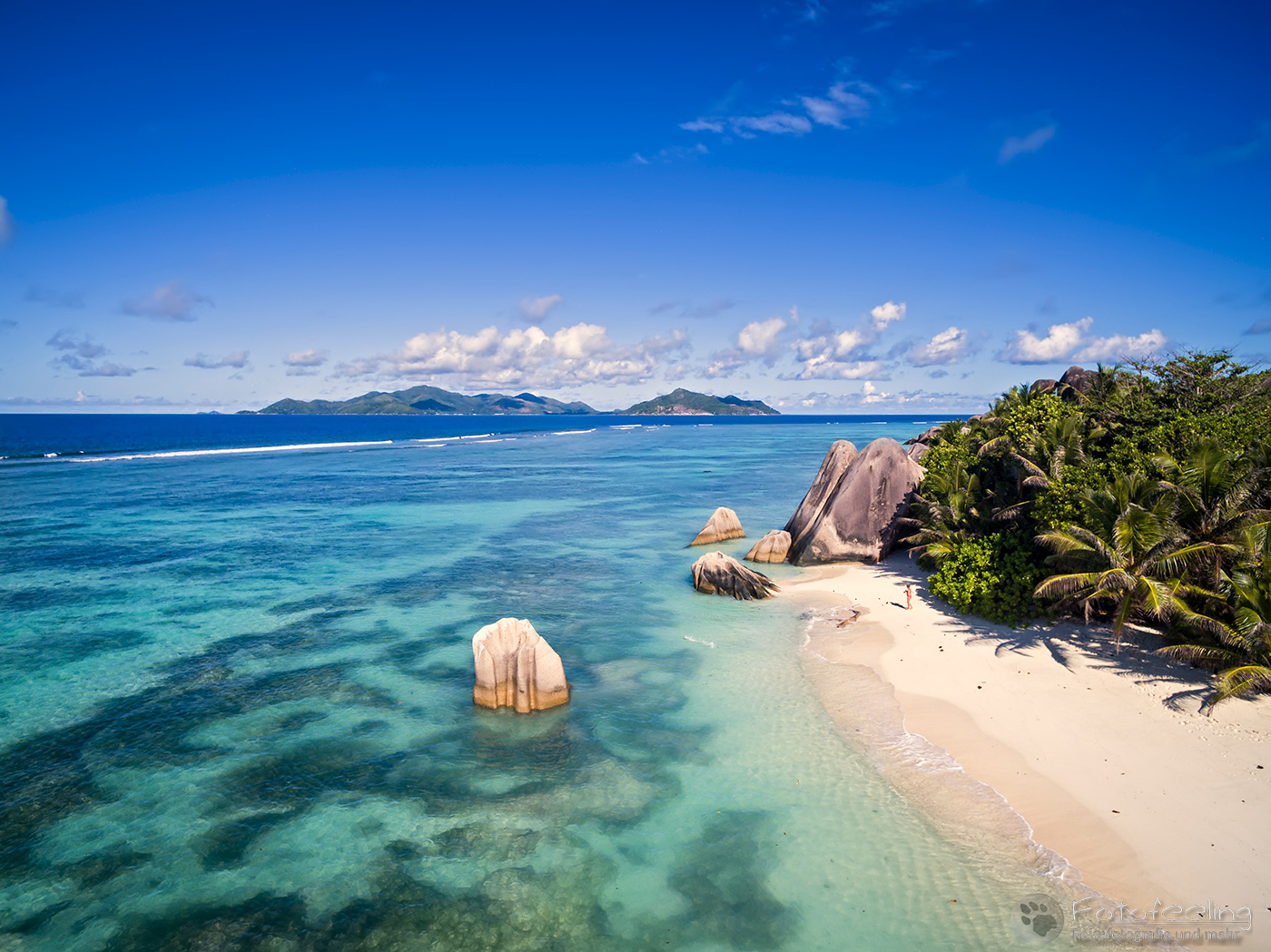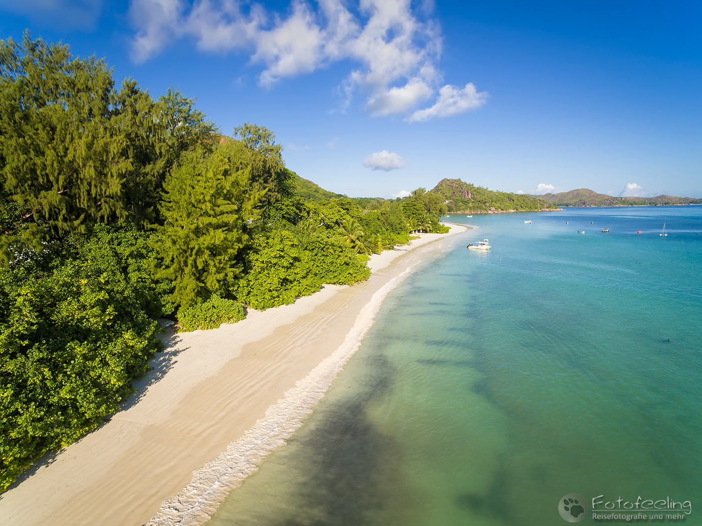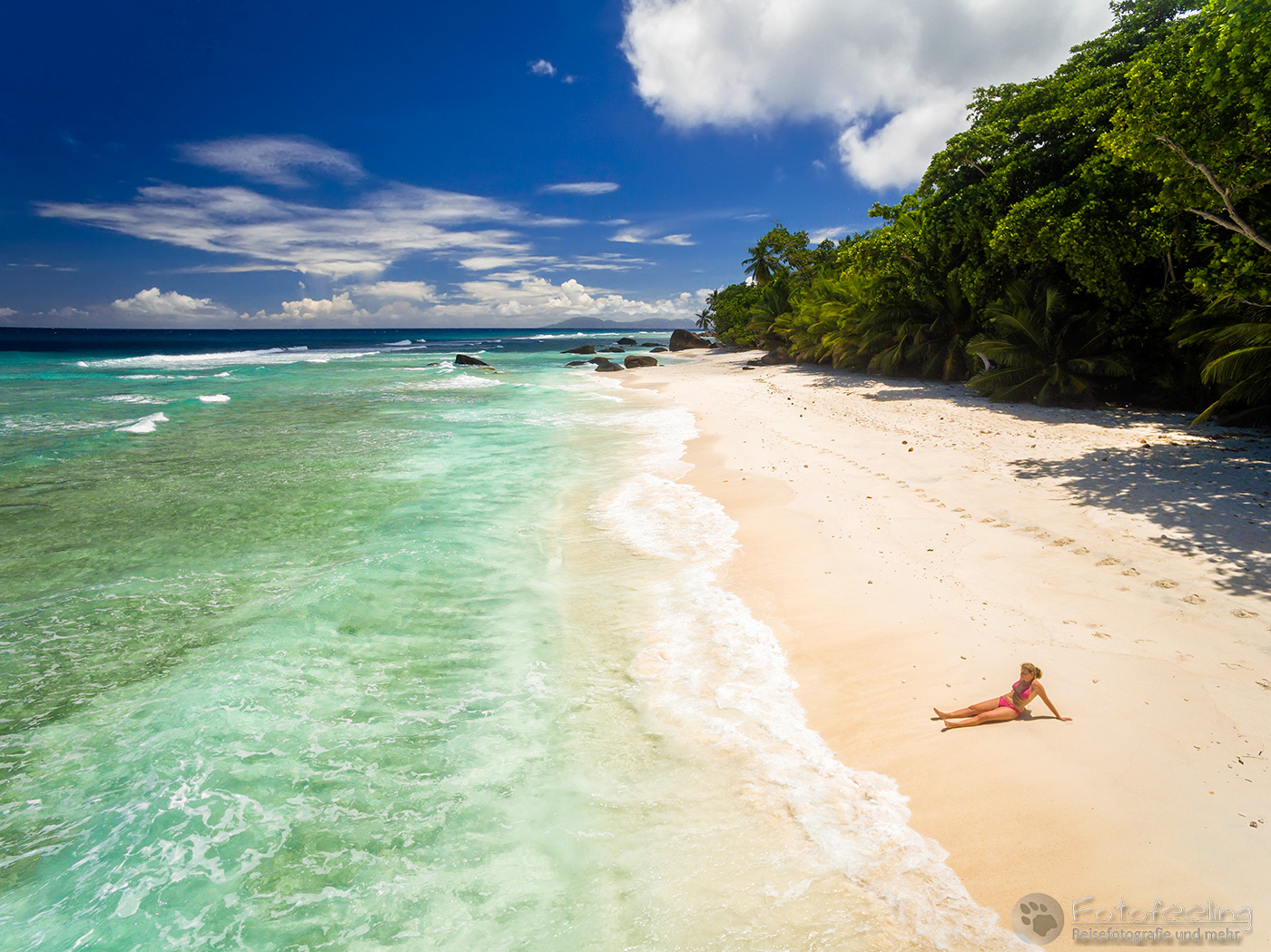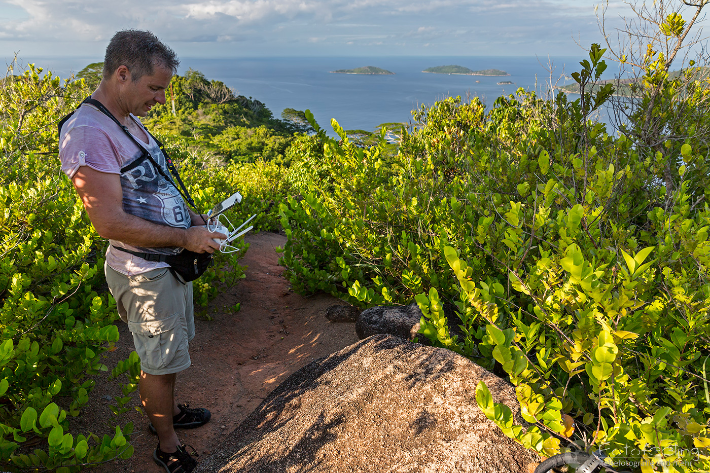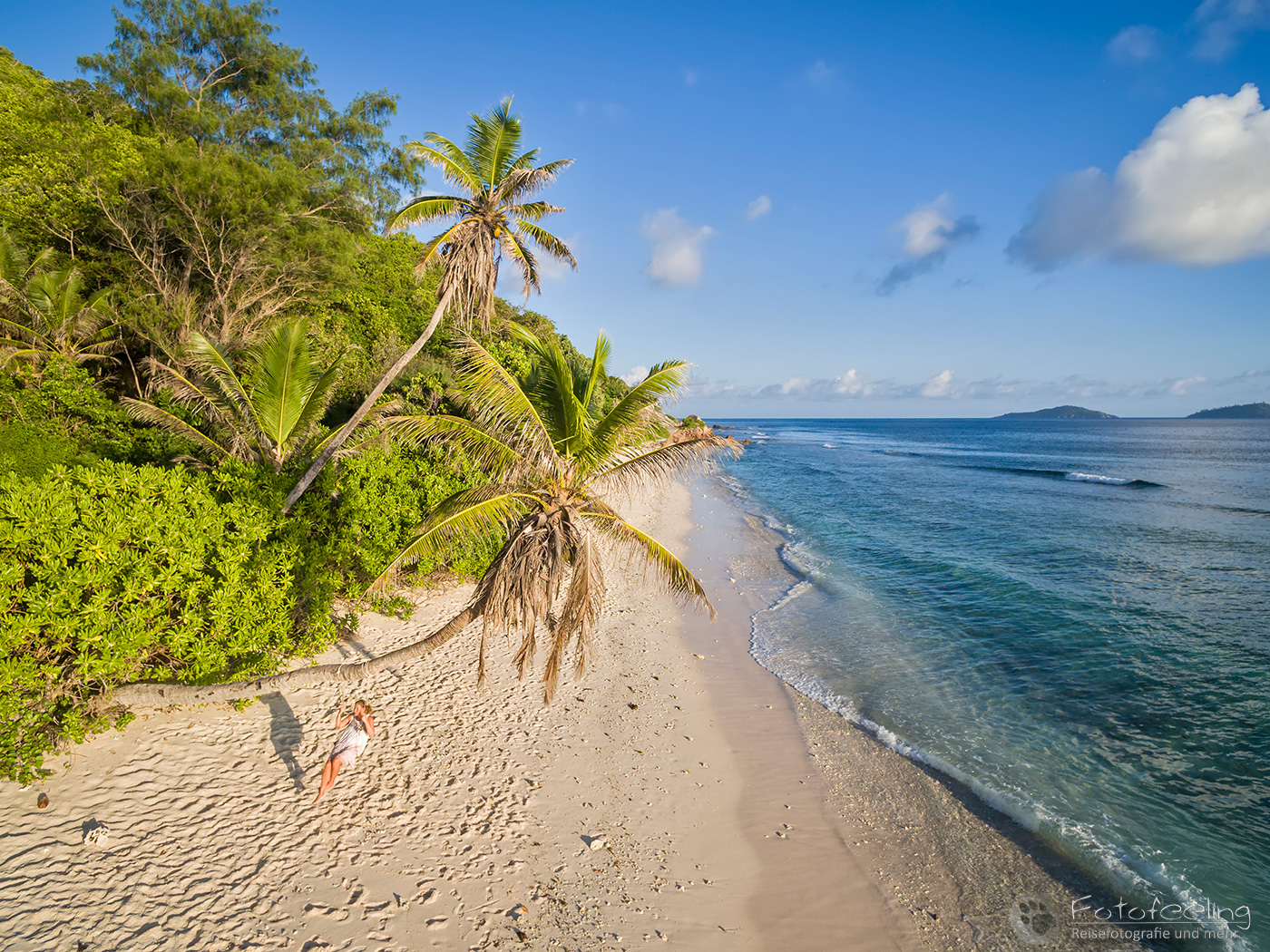Auch am Anse Lazio war noch niemand. Nur ein paar Jungs fegten den Strand für eine Hochzeit. Die Sonne stand noch tief am Himmel und zauberte ein warmes Licht. Auch heute würde es wieder sehr heiß werden, denn es war kein Wölkchen am Himmel. Auch hier flog der Kopter seine Runden am Strand entlang, während ich wieder ein paar Fotos machte. Es war richtig idyllisch an diesem Morgen. Wir lasen und badeten. So nach und nach füllte sich der Strand und Chris bekam auch das Brautpaar zu sehen, die auf einem Stein für ein paar Probeaufnahmen posten.