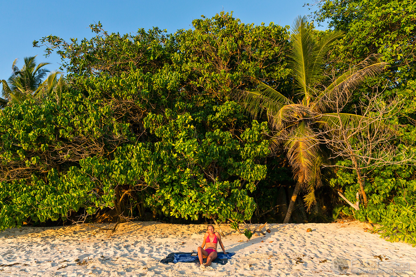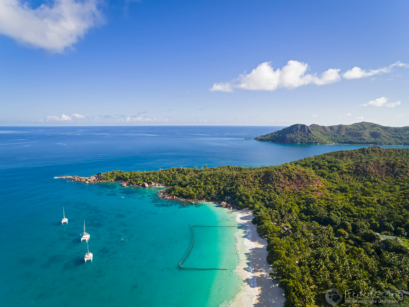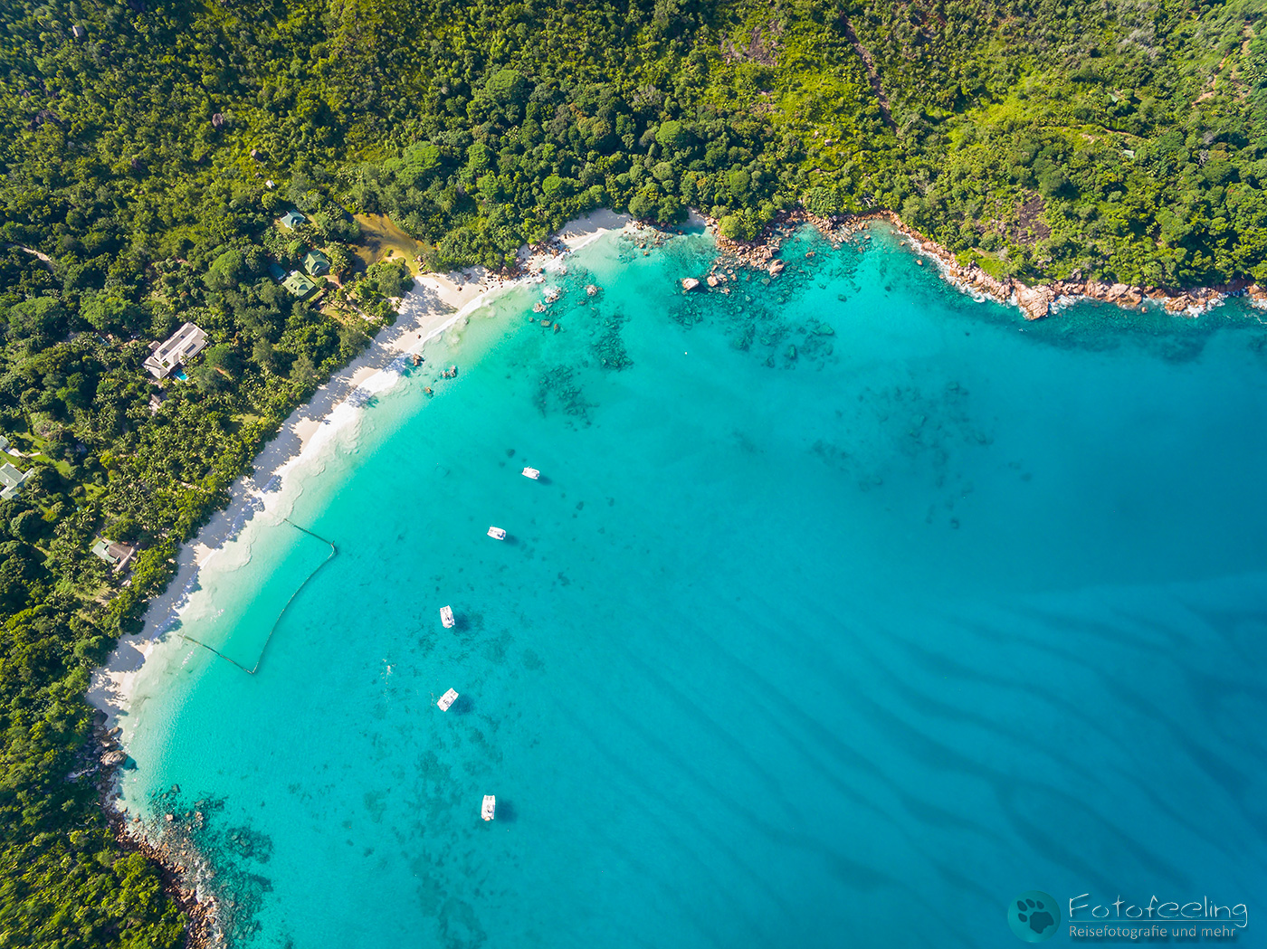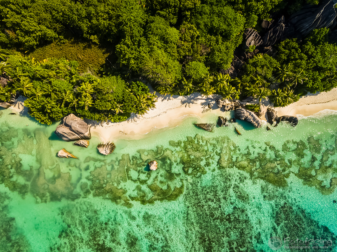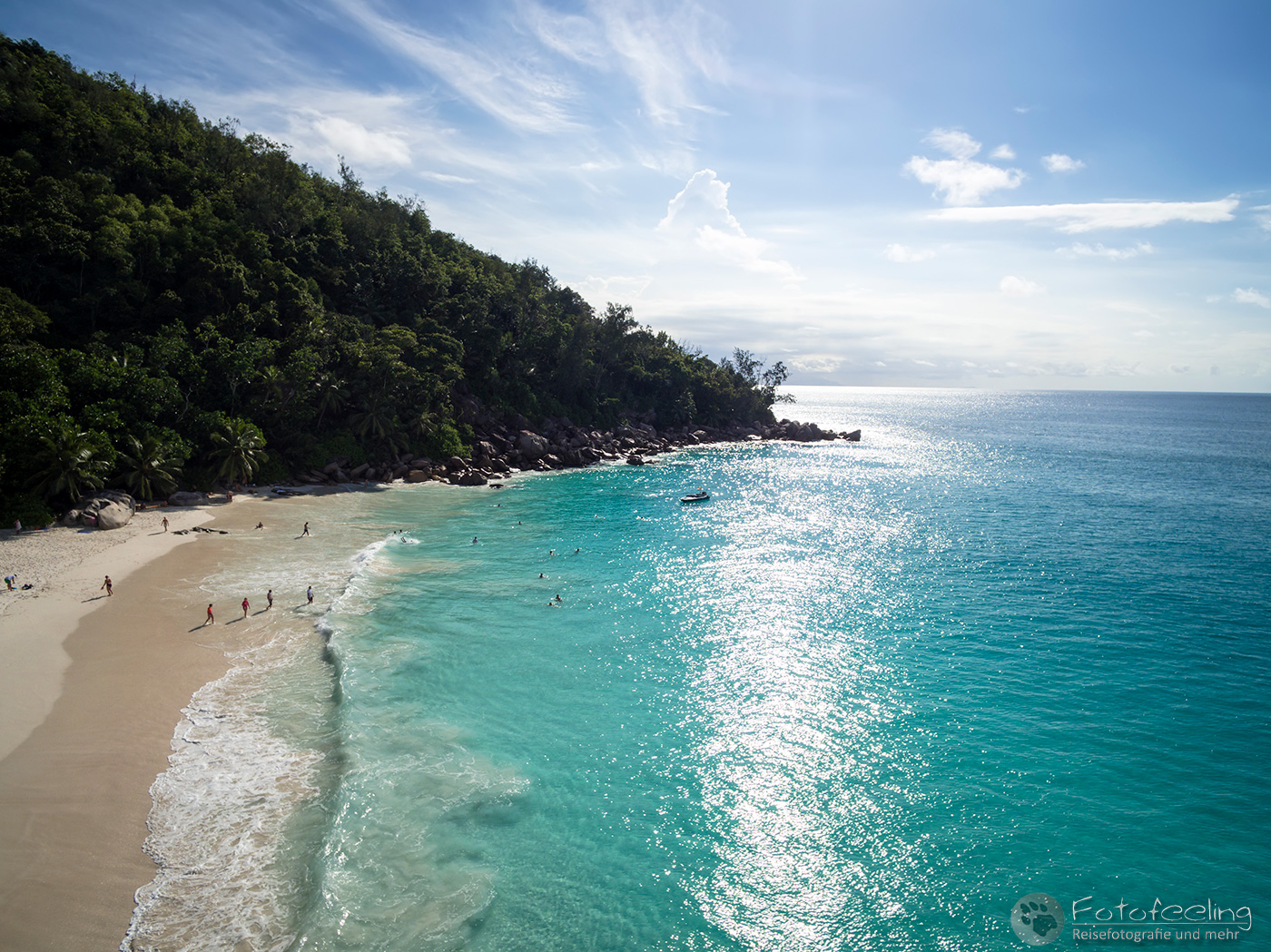 Auch am Anse Lazio war noch niemand. Nur ein paar Jungs fegten den Strand für eine Hochzeit. Die Sonne stand noch tief am Himmel und zauberte ein warmes Licht. Auch heute würde es wieder sehr heiß werden, denn es war kein Wölkchen am Himmel. Auch hier flog der Kopter seine Runden am Strand entlang, während ich wieder ein paar Fotos machte. Es war richtig idyllisch an diesem Morgen. Wir lasen und badeten. So nach und nach füllte sich der Strand und Chris bekam auch das Brautpaar zu sehen, die auf einem Stein für ein paar Probeaufnahmen posten.
