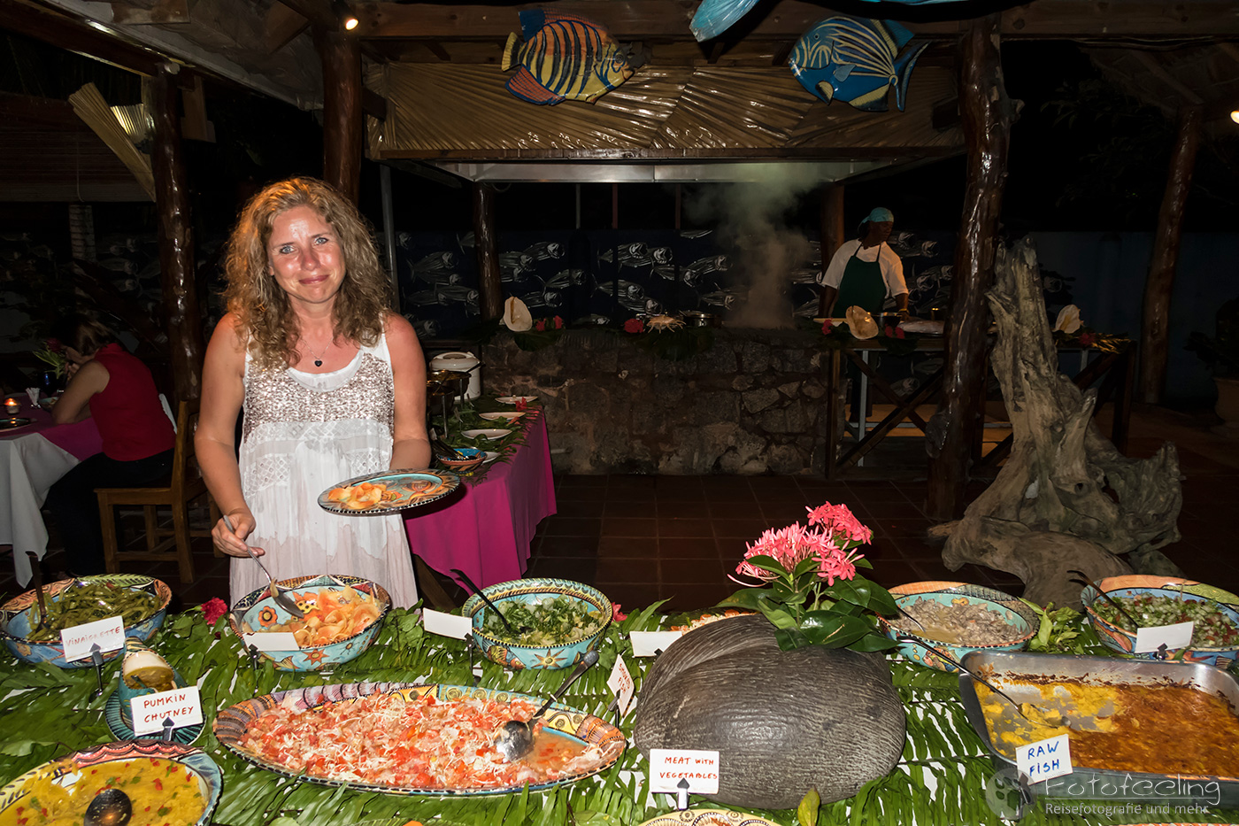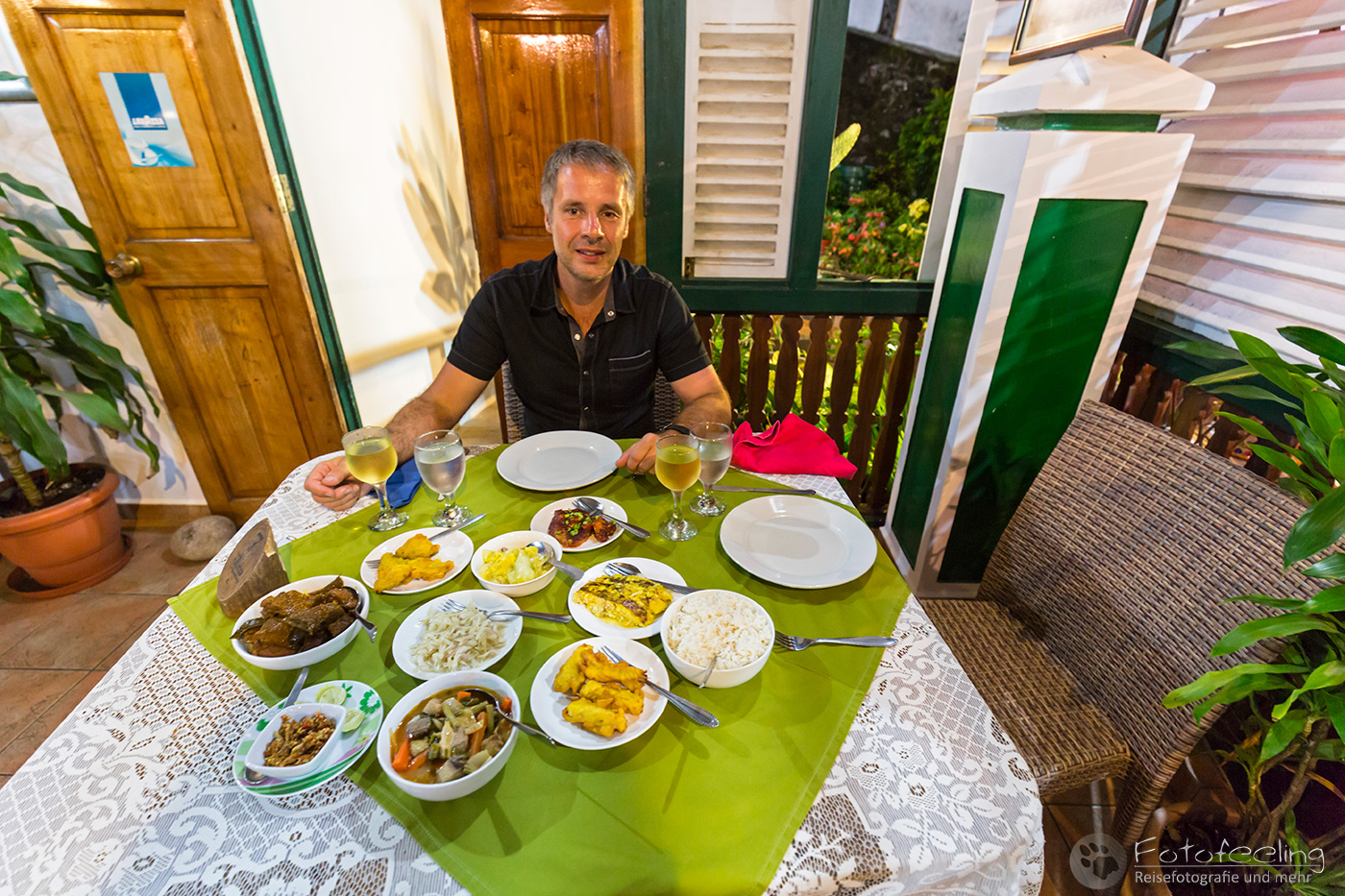 Am Abend fuhren wir noch auf die andere Seite der Insel nach Cote d´Or zum Restaurant Laurier, wo wir am Nachmittag reserviert hatten und das für sein gutes kreolisches Buffet bekannt ist. Das Buffet war super. Es gab viele interessante Salate, durch die wir uns kosteten. Am besten schmeckte uns der herzhafte Papaya- und Mangosalat, aber auch der überbackene Kürbis und die vielen anderen Salate schmeckten hervorragend. Der Fisch und das Fleisch wurden frisch gegrillt. Doch leider war es einfach viel zu viel, um alles zu probieren. Trotzdem musste noch eine Kugel Eis dran glauben, aber dann war es wirklich genug. Der Restaurant-Tipp war echt goldwert.