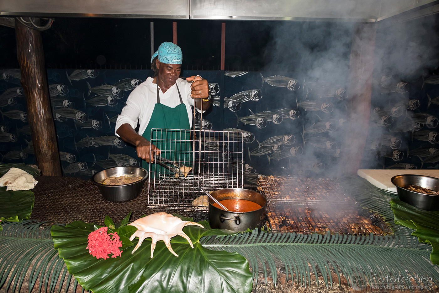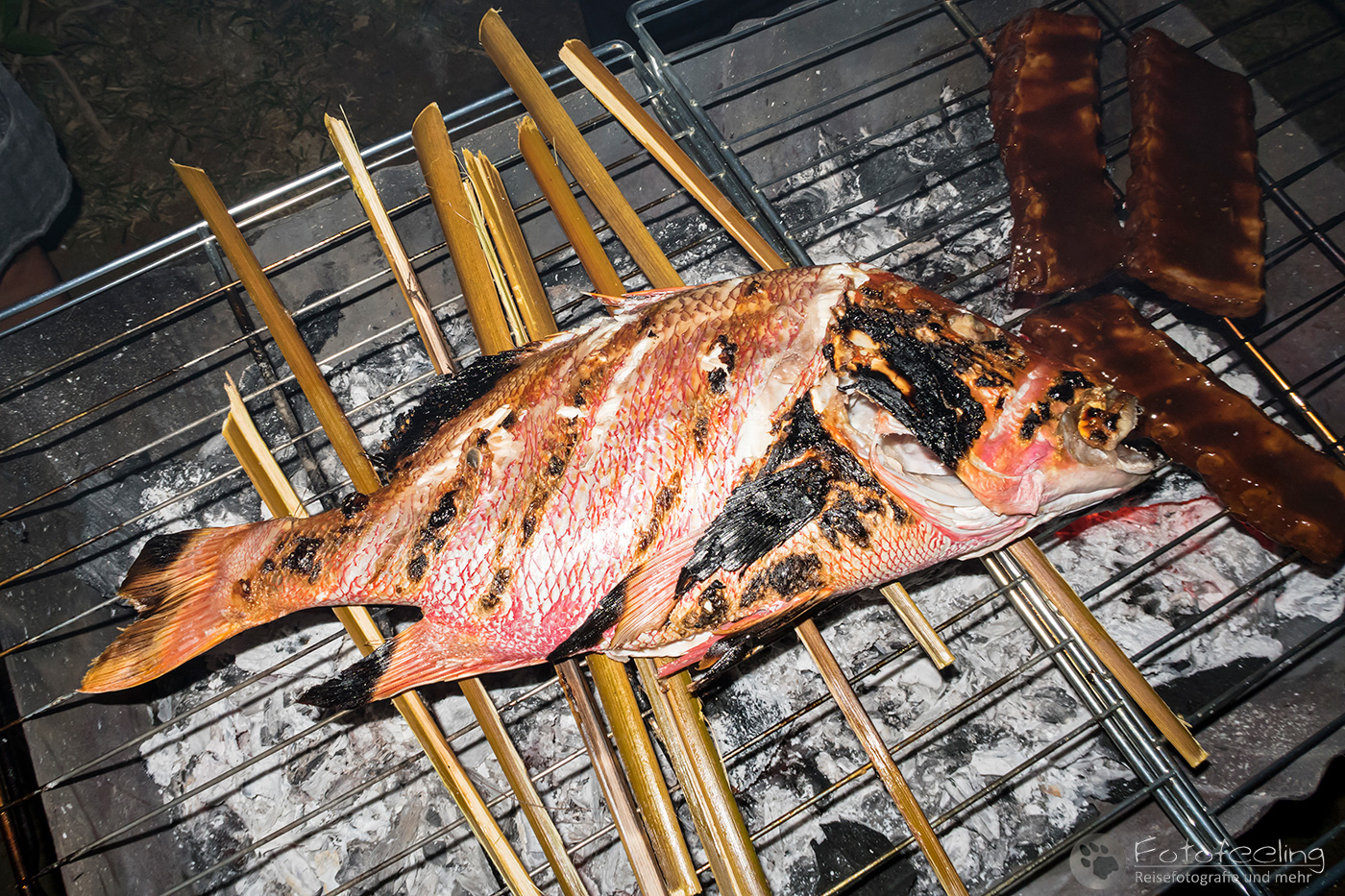 Seit 15.30 Uhr loderte am Haus der Grill. Emmanuel grillte Red Snapper und Pork Ribs. Er verriet uns, dass er so langsam keinen Fisch mehr sehen kann und mal ein anständiges Stück Fleisch möchte. Wir dagegen freuten uns mächtig auf den leckeren Fisch, denn schon beim Anblick lief uns das Wasser im Munde zusammen.