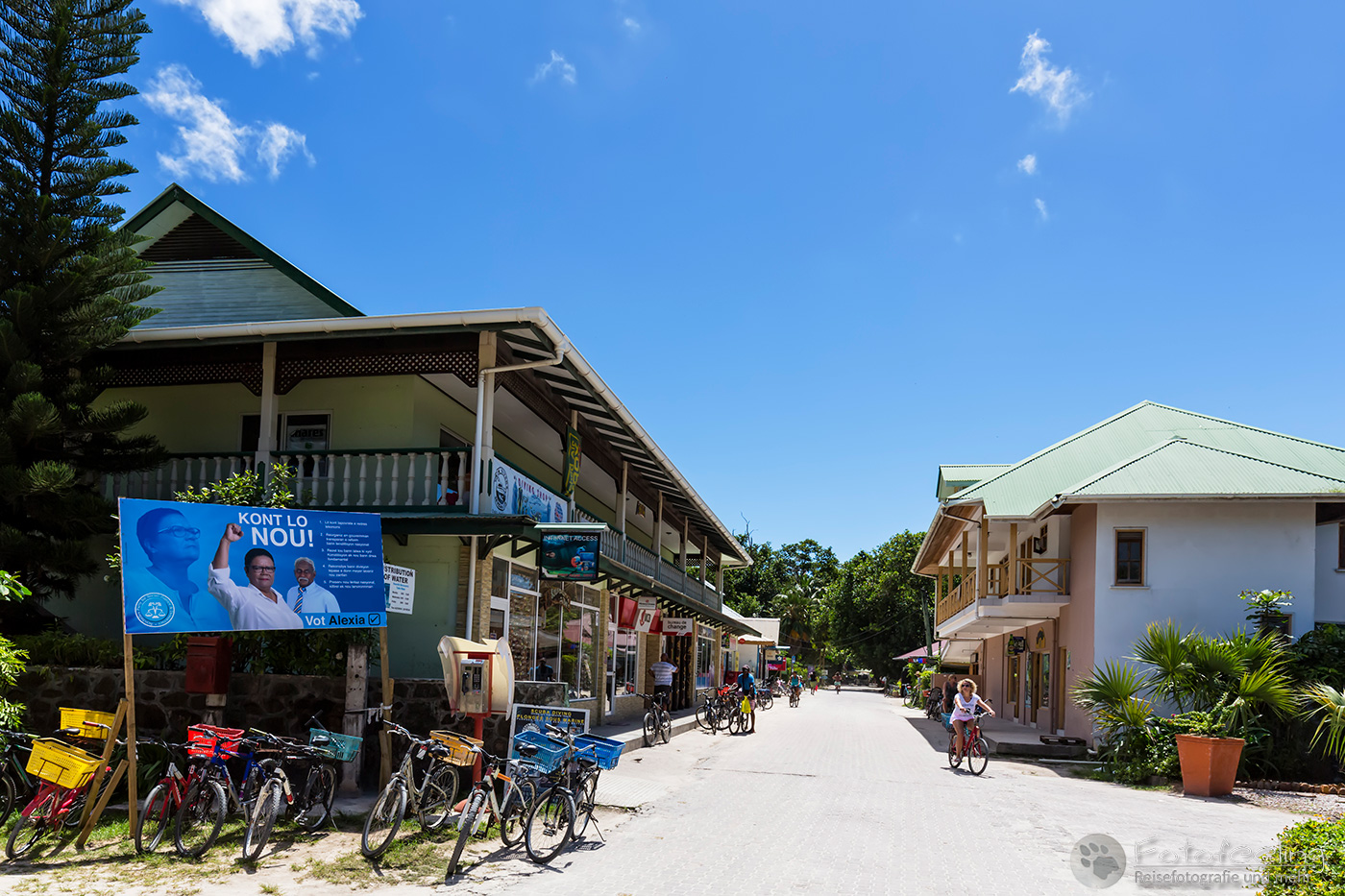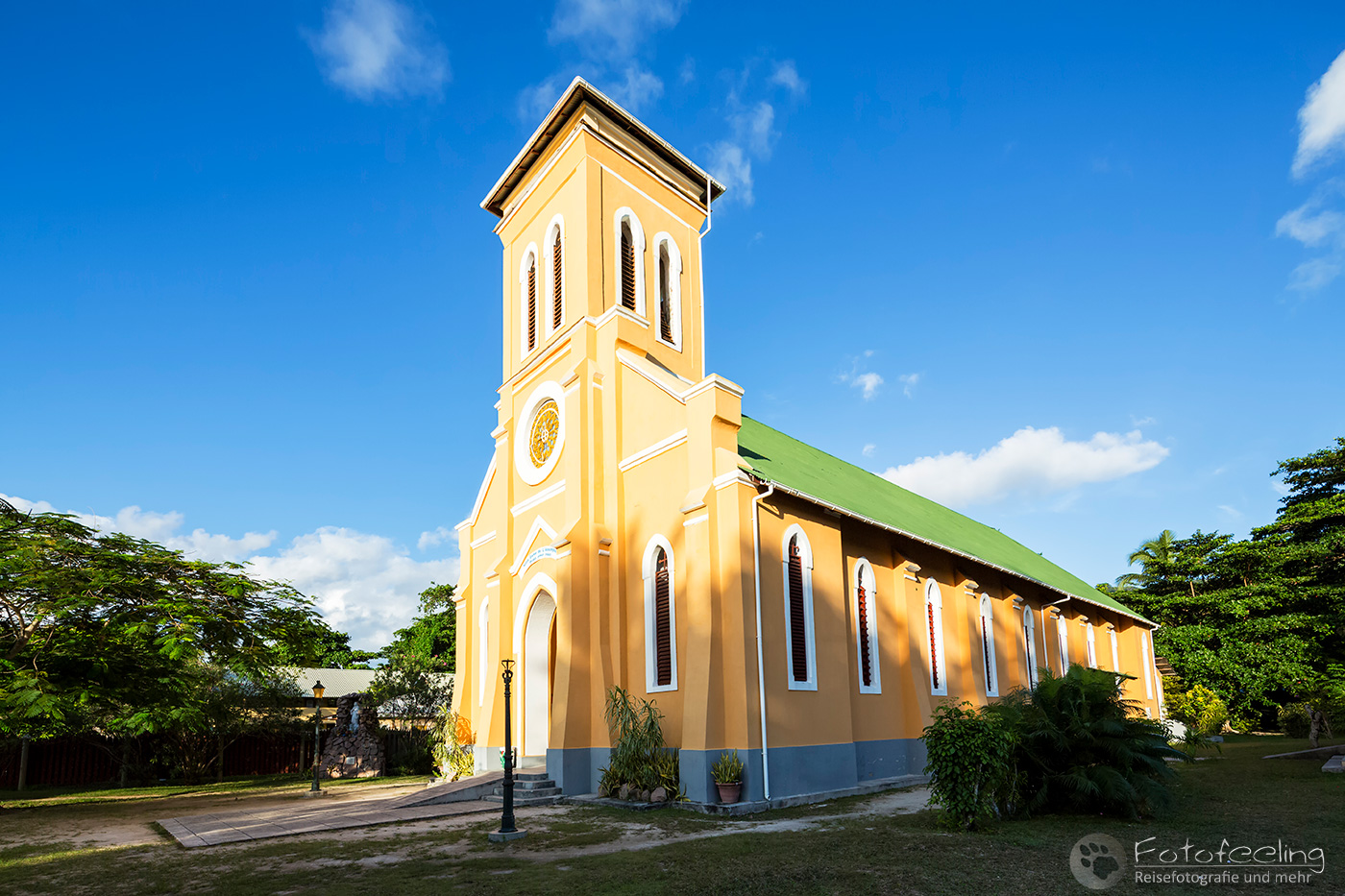 Um 6 Uhr sprangen wir aus unseren Betten und radelten nach einem gemütlichen Frühstück auf der Terrasse durch den Ort. Es ging am Supermarkt und riesigen Kokospalmen mitten im Ort vorbei, bis wir zur einzigen Kirche kamen. Dort hielten wir kurz und bestaunten die schlichte Schönheit. Doch magisch zog es uns an diesem Morgen weiter zum weltberühmten Strand Anse Source d’Argent.