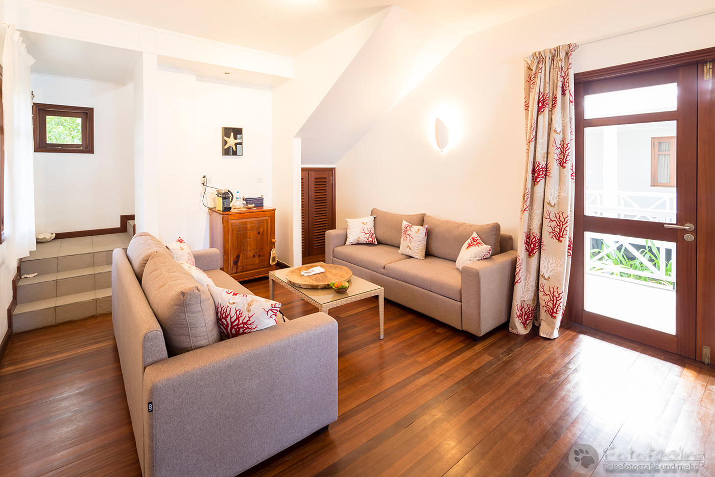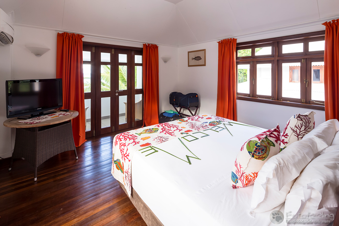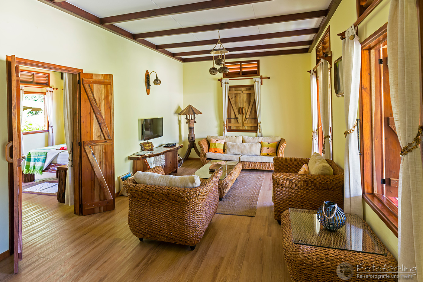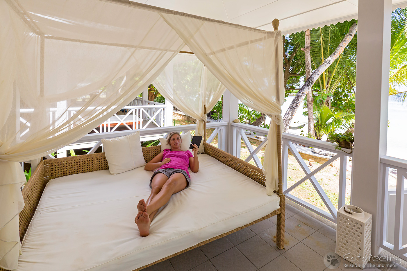 Mariannick erwartete uns schon mit einem Golf Caddy, mit dem sie uns zur Lodge brachte. Die Lodge liegt fast neben dem Bootsanleger in der Bucht nahe dem Pointe Varreur, zu der wir auch ohne weiteres zu Fuß gehen könnten. Unser Gepäck wurde direkt auf das Zimmer gebracht und so konnten wir uns erst einmal einen kleinen Überblick verschaffen. Der Empfangs- und Essensraum war schön groß und offen. Hier gibt es eine Bar und viele Bücher. Daneben befinden sich die weißen Häuschen im kreolischen Stil mit einer großen zum Meer hin offenen Veranda. Mariannick erklärte uns alles und zeigte uns dann unsere kleine Villa. Ein total süßes Haus, das mich irgendwie an eine Südstaatenvilla erinnerte. Einziger Wermutstropfen war der geringe Abstand zum Nachbarhaus und der nicht vorhandene Sichtschutz, den wir uns für etwas mehr Privatsphäre gewünscht hätten. Dafür überzeugte mich die schnucklig kleine Zweietagenvilla gleich auf den ersten Blick. Chris war noch etwas skeptisch, aber ich war sofort verliebt. Auch das gemütliche Himmelbett auf der Veranda trug seinen Teil dazu bei. Hier war es einfach schön. Der Strand begann gleich vor dem Haus und davor lag ein Korallenriff, an dem sich die Wellen brachen.