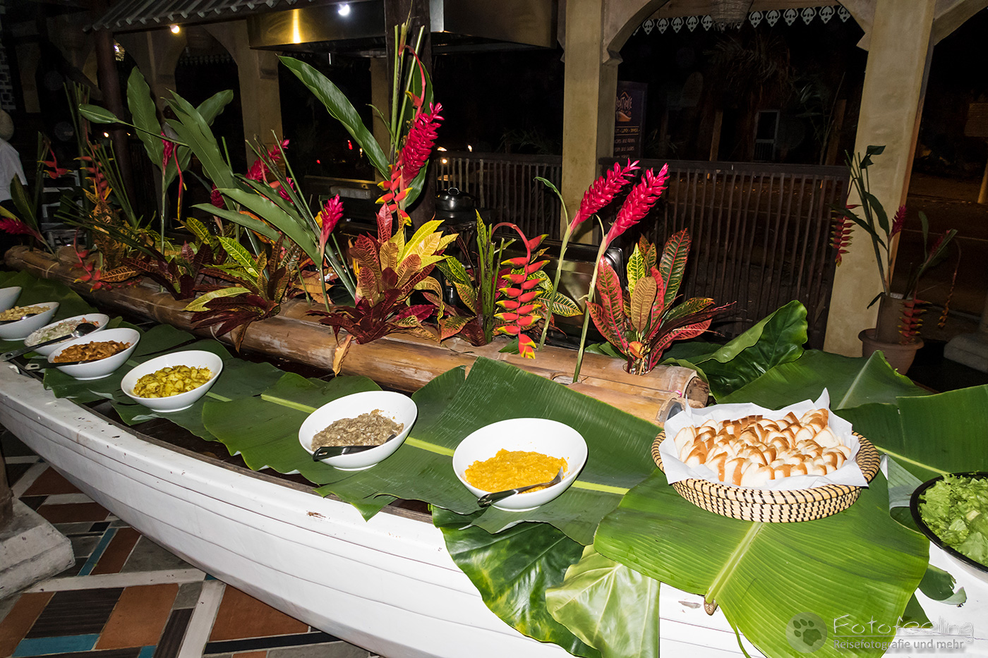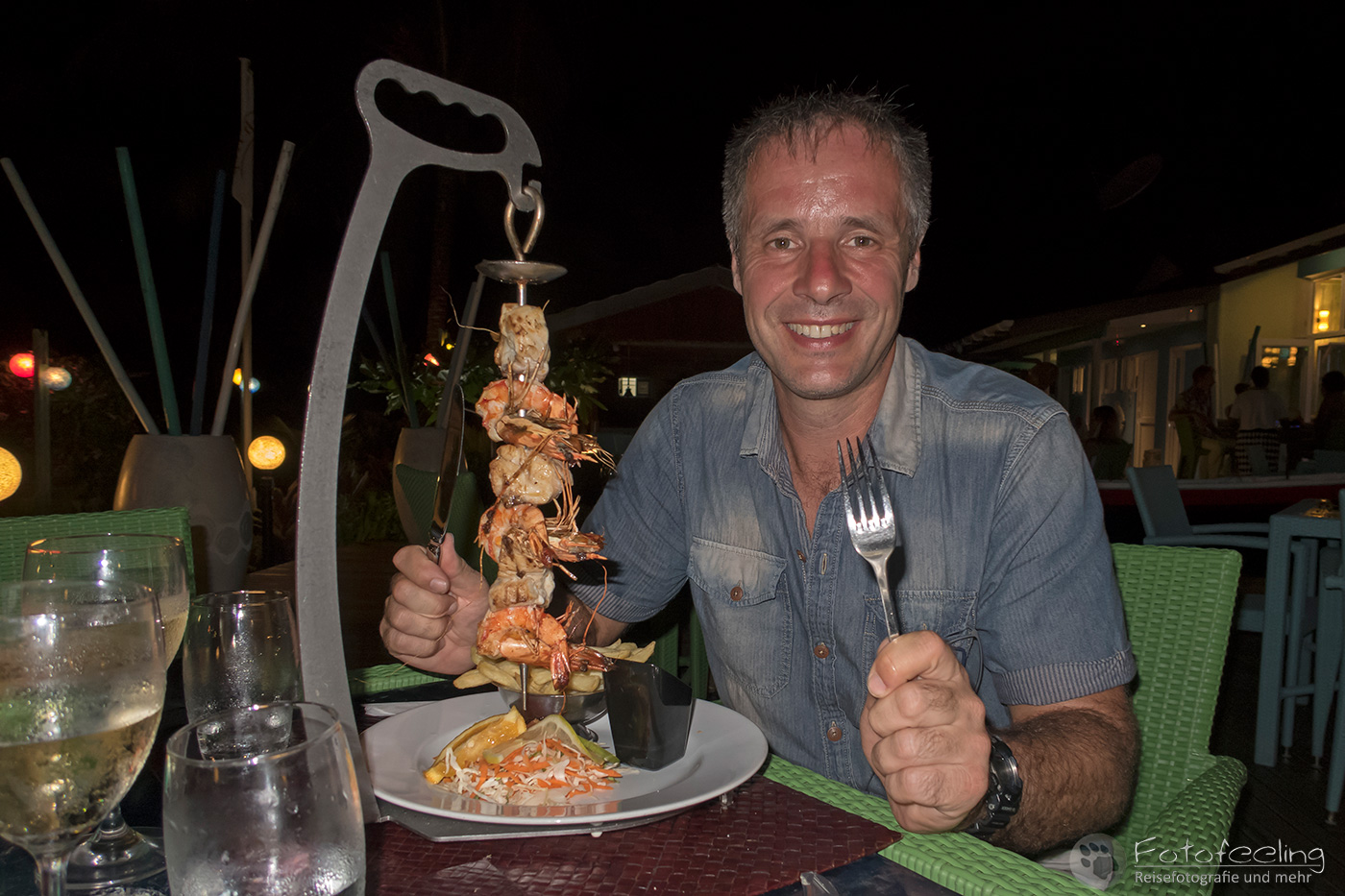 Dafür war das Essen an diesem Abend klasse. Wir gingen ins Restaurant Pirogue, doch dummerweise ohne vorbestellt zu haben. Hier war es absolut voll. Erst wollte uns eine Kellnerin wegschicken, aber eine zweite Bedienung holte uns zurück und machte uns einen netten Tisch fertig. Das Essen war vorzüglich. So aß ich einen Prawnspieß und Chris Chicken Tandori. Sehr lecker und absolut liebevoll angerichtet. Hier konnte das Auge wirklich noch mitessen und die Zunge war von den exotischen Gewürzen begeistert.