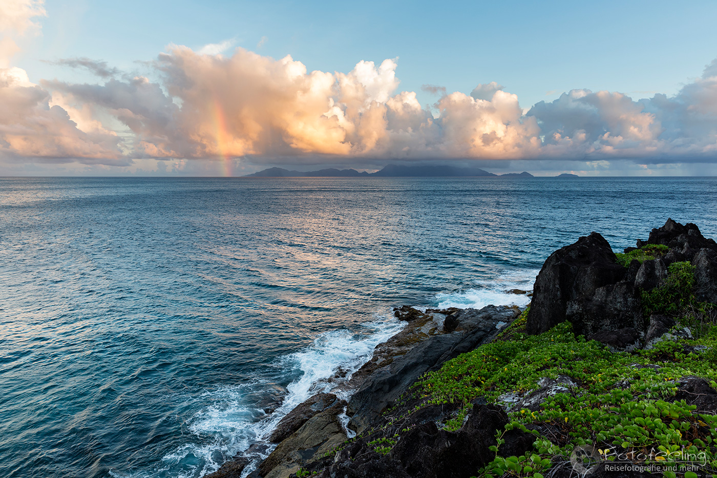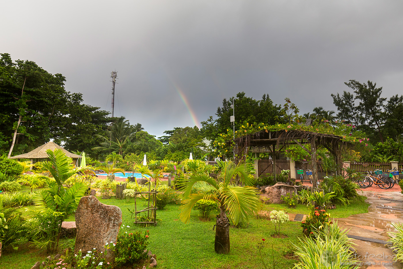 Wir wanderten noch zum Pointe Ramasse Tout mit dem Kreuz und seiner kleinen Kapelle, welcher in der kurzen Zeit zu unserem Lieblingsplatz geworden war. Dort leuchtete jetzt über Mahé der Regenbogen. Wir verabschiedeten uns von diesem wunderbaren Ort, denn das war leider unser letzter voller Tag hier. So gingen wir etwas wehmütig zurück, denn diese Insel war uns auf den zweiten Blick absolut ans Herz gewachsen mit ihrer wilden Schönheit, dem rauen Meer, der wunderbaren Unterkunft und unserer kleinen Villa.