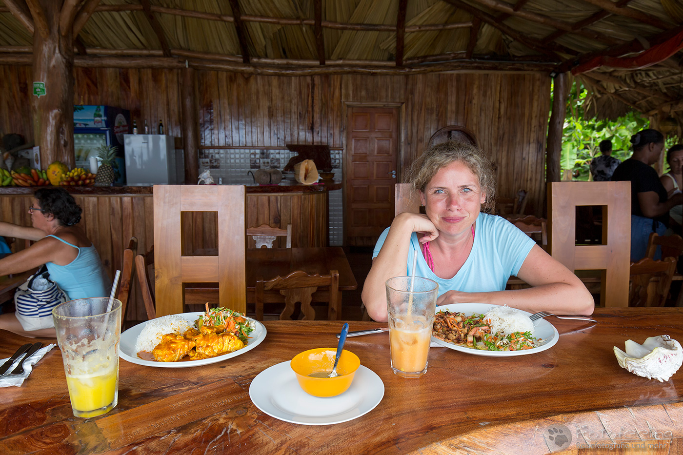 Als ein paar Wolken die Sonne verdunkelten, fuhren wir langsam zurück und hielten unterwegs an dem kleinen Restaurant "Chez Jules" am Anse Banane an. Eine Riesenschildkröte kam gemütlich des Weges und war natürlich die Hauptattraktion. Wieder gab es einen kurzen, aber heftigen Regen. Nach einem sehr leckeren, frischen Fruchtsaft gönnten wir uns noch ein Mittagessen. Chris verspeiste frischen Fisch mit kreolischer Soße und ich gönne mir eine Meeresfrüchtepfanne. Das war vielleicht lecker und für Seychellenverhältnisse sogar preisgünstig!