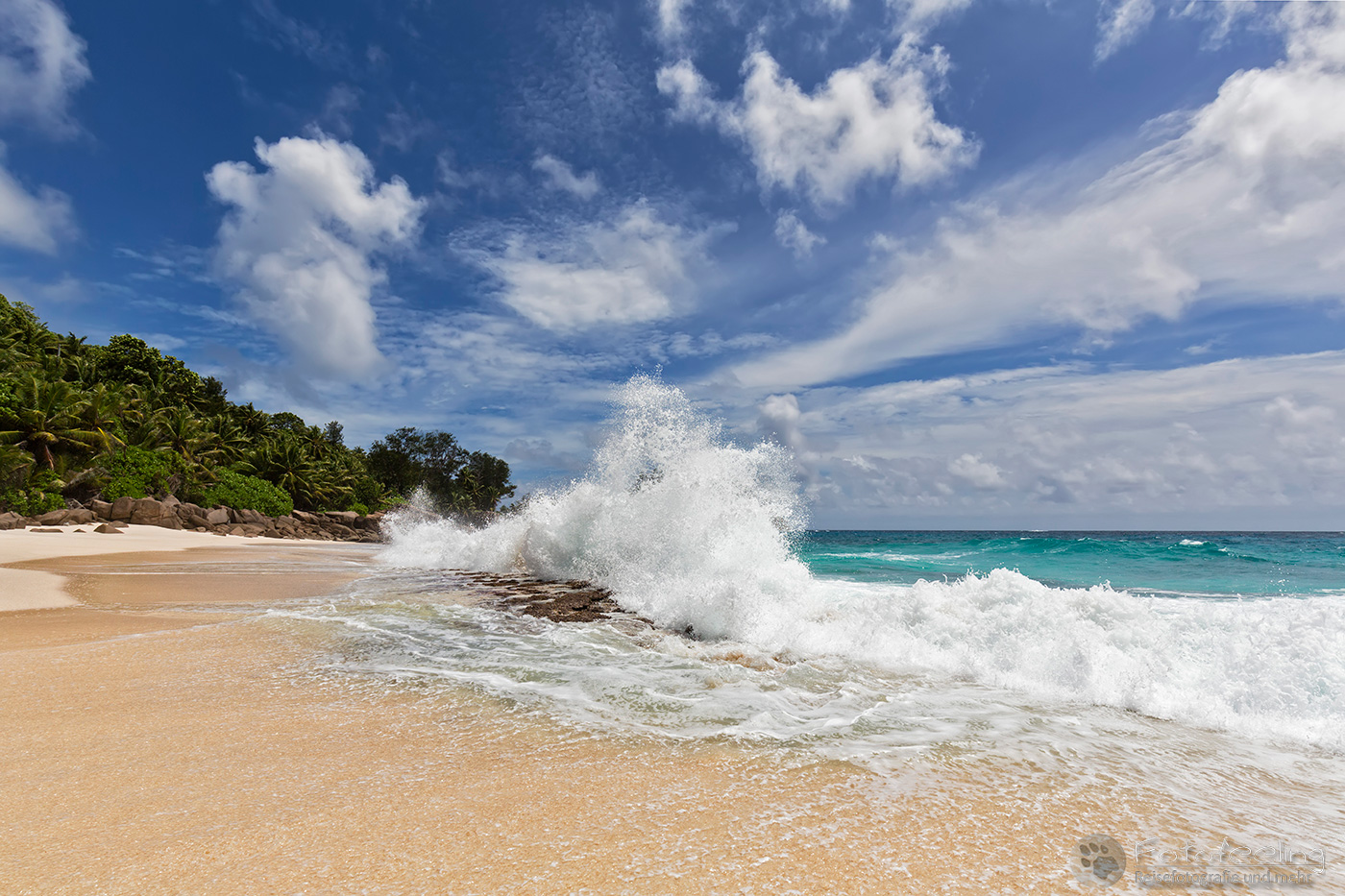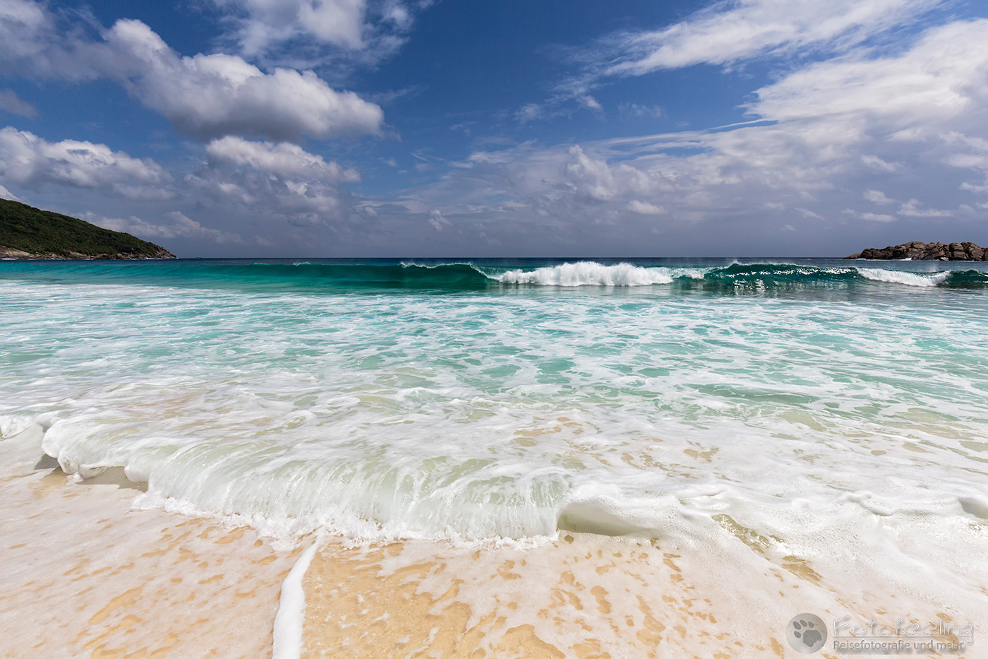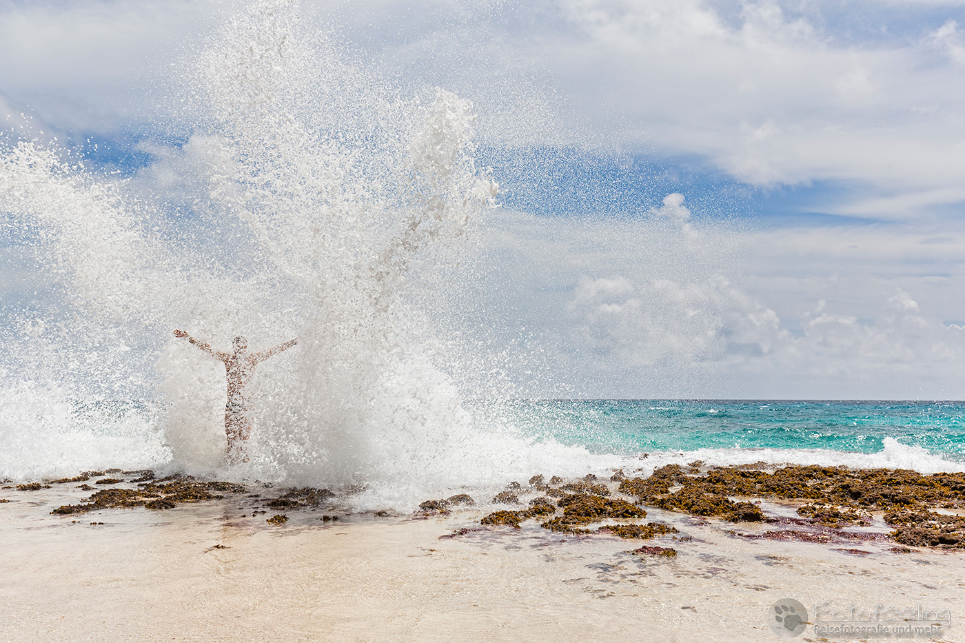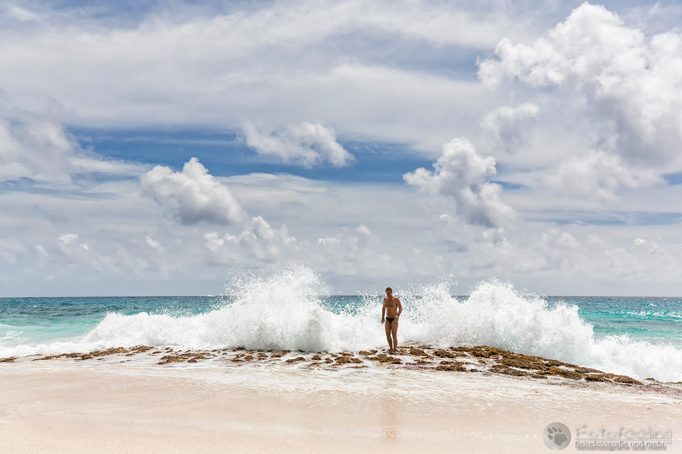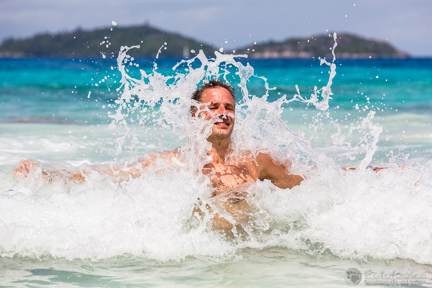 Endlich konnte Chris auch mal den Kopter am Anse Bazarca fliegen lassen. Danach gönnte er sich noch eine Gischtdusche am Strand, denn an einem kleinen Riff krachten die Wellen an den Strand und schäumten dabei meterhoch. Das sah vielleicht toll aus. Chris hatte viel Spaß und wurde wirklich voll geduscht. Stellenweise sah ich ihn vor lauter Wasser nicht mehr. Die Wellen hatten noch immer so viel Kraft, dass sie ihn sogar umwarfen. Aber der Untergrund war weich, so dass ihm nichts passierte. Ich hätte mich nie in die Wucht der Wellen gestellt, dafür hab ich viel zu viel Respekt vor der Kraft der Natur. So machte ich lieber Bilder und hatte meinen Spaß vom Strand aus.