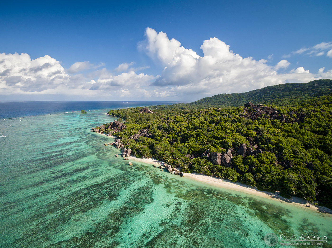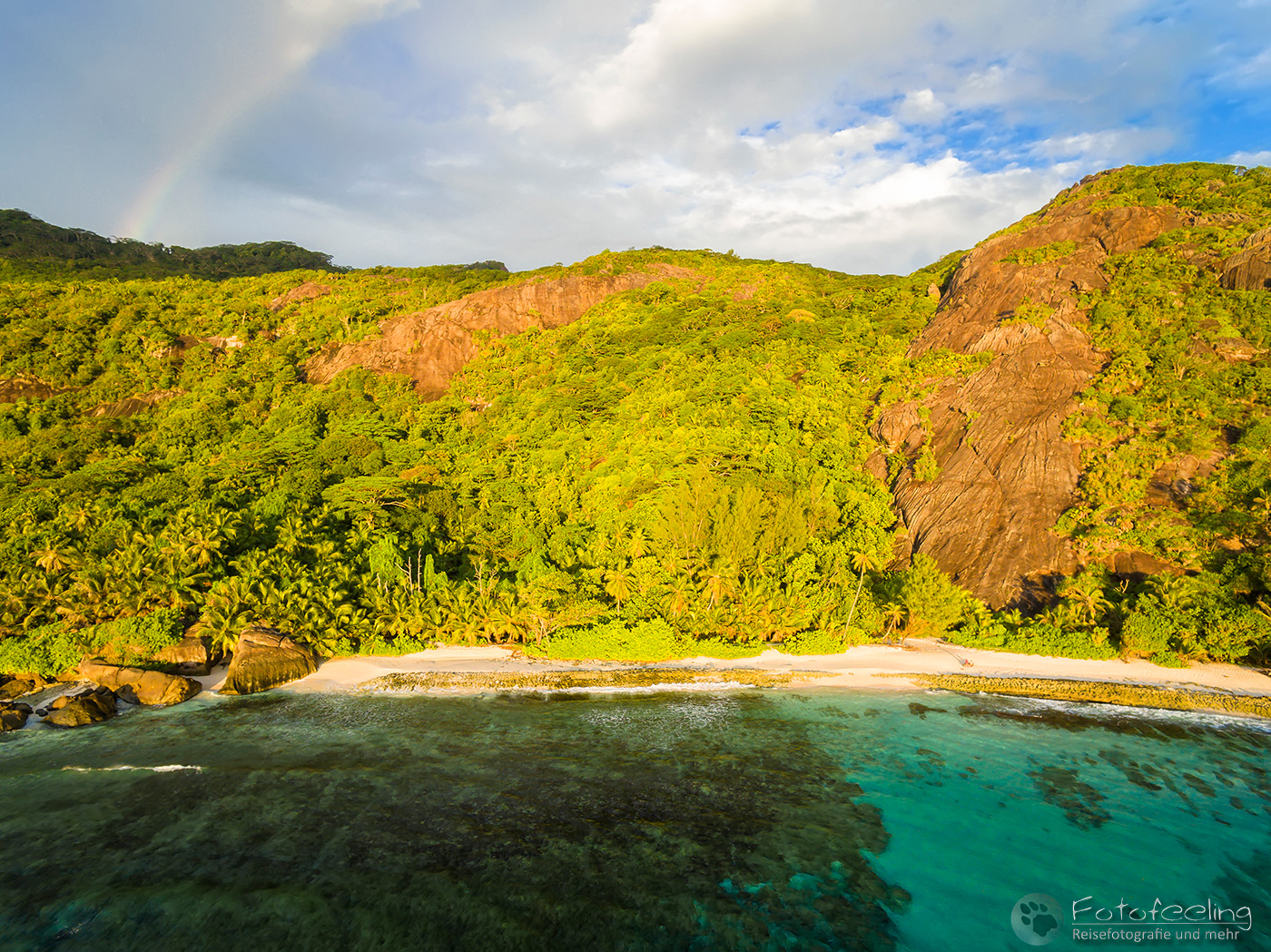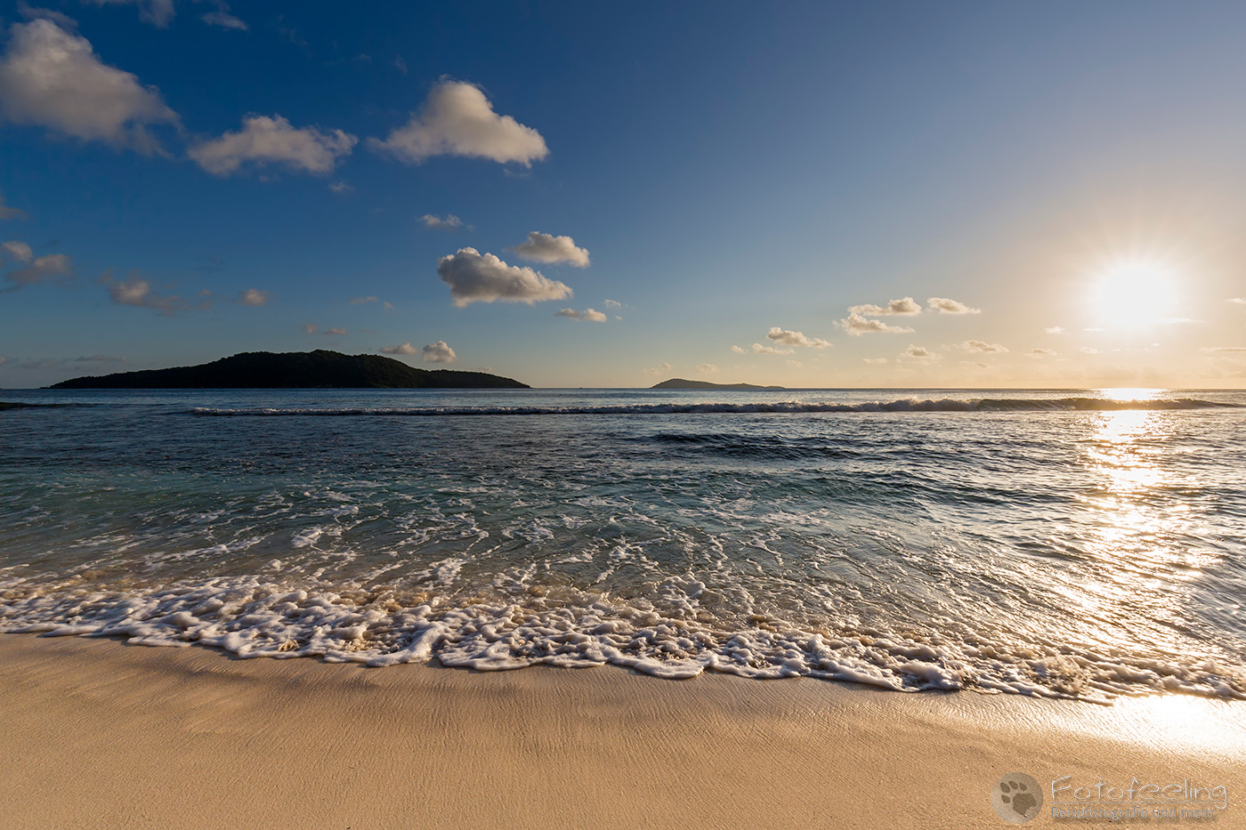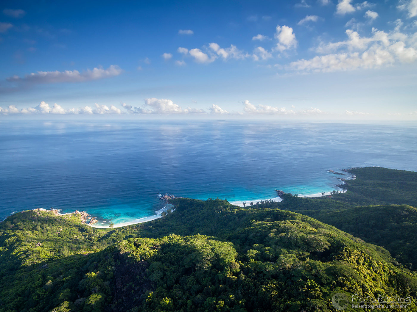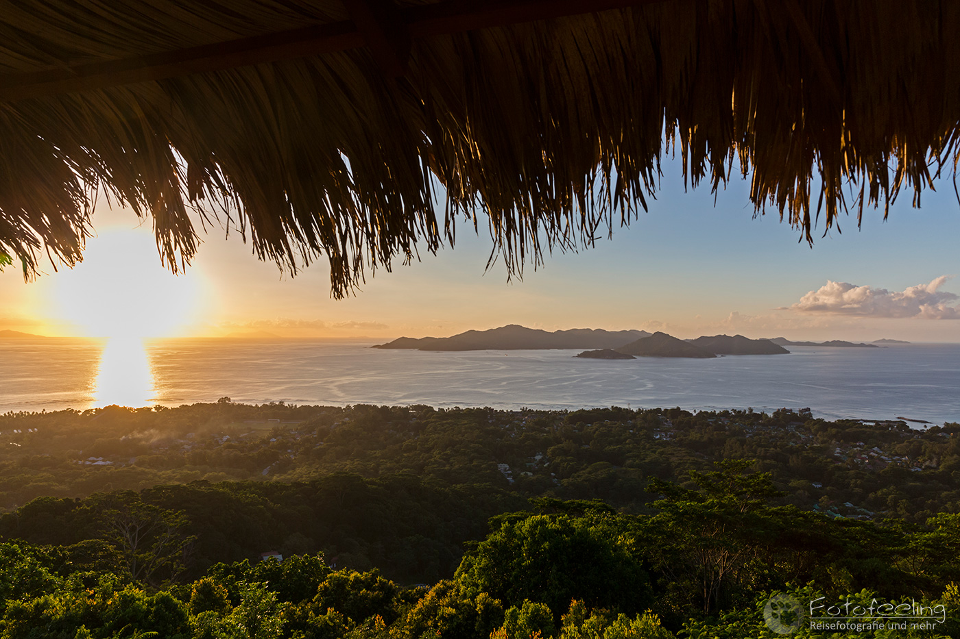 Die Sonne ging als großer gelber Ball auf, der schnell an Kraft gewann und gleißend wurde. Chris ließ ein letztes Mal den Kopter über La Digue fliegen und ich machte ein paar Bilder.