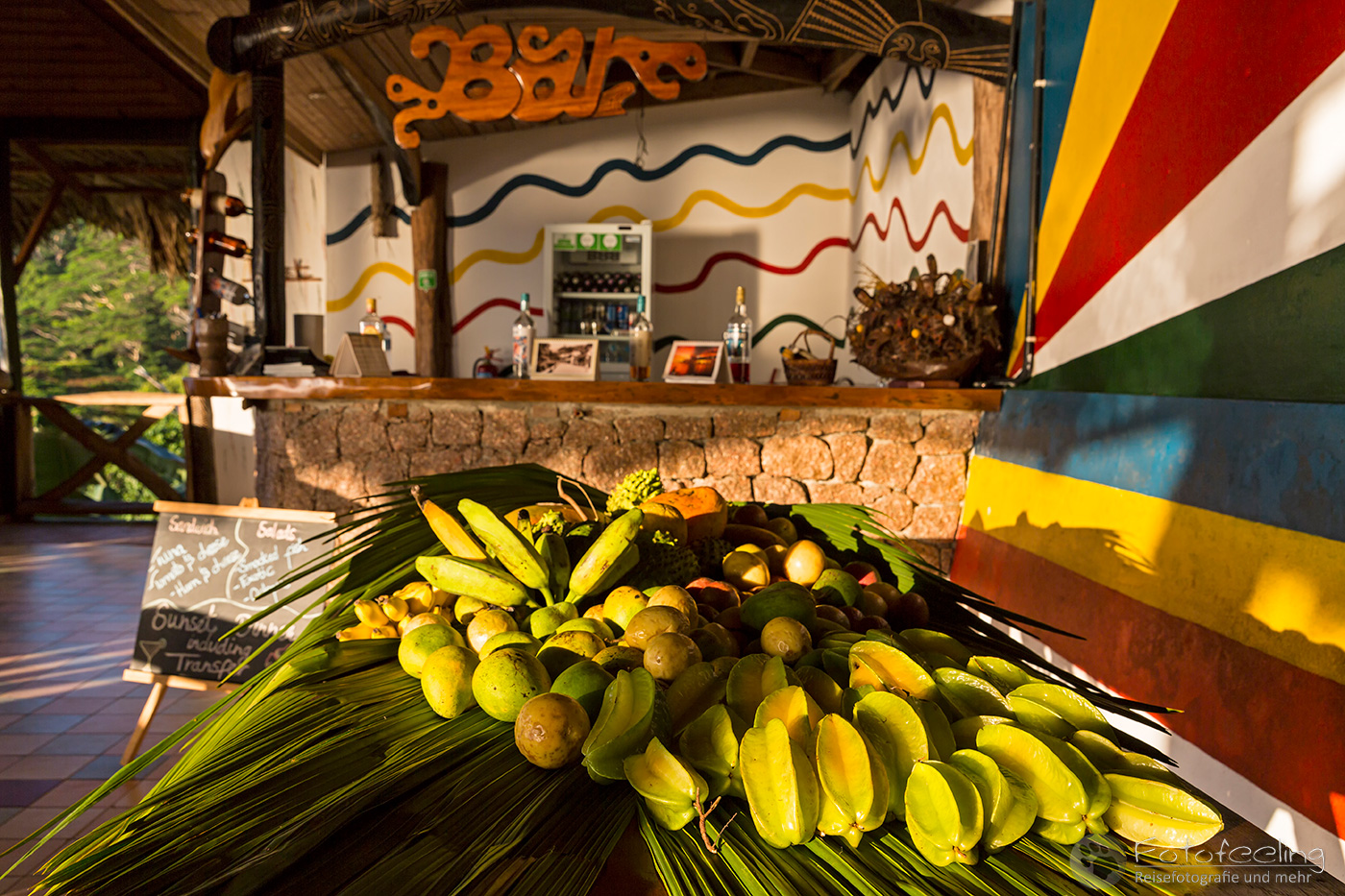 Irgendwie freuten wir uns zwar auf den nächsten Teil unserer Reise, aber wir hätten nicht gedacht, dass uns schon von der ersten Insel der Abschied so schwer fallen würde. So standen wir sehr früh auf, denn wir wollten den Vormittag noch einmal in Ruhe genießen. In aller Früh packten wir zusammen, genossen noch einmal unser Frühstück mit der wunderschönen Aussicht auf den Garten, die Tiere und das Meer, das durch die Palmen zu uns hinaufglitzerte.