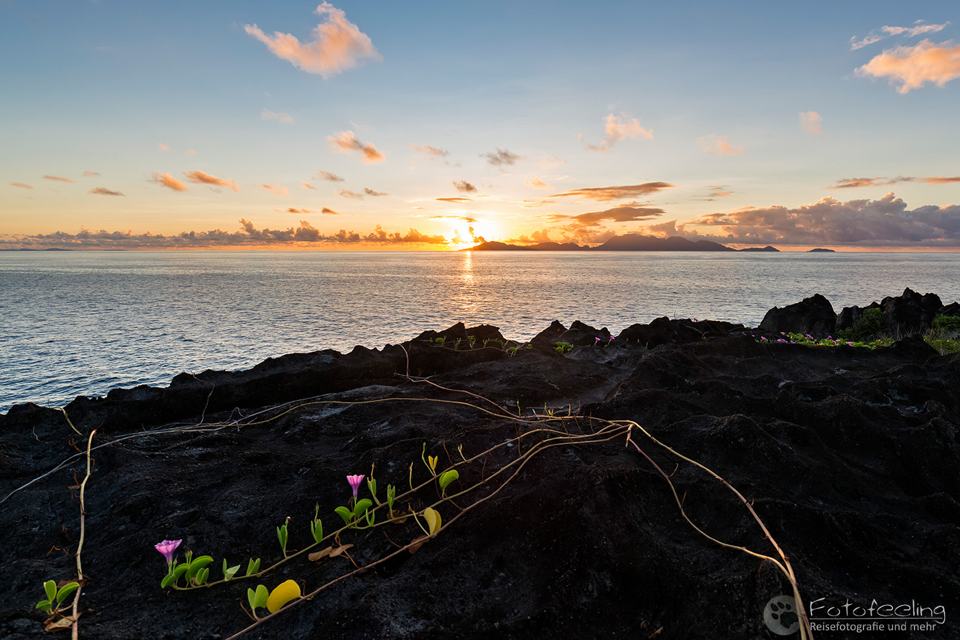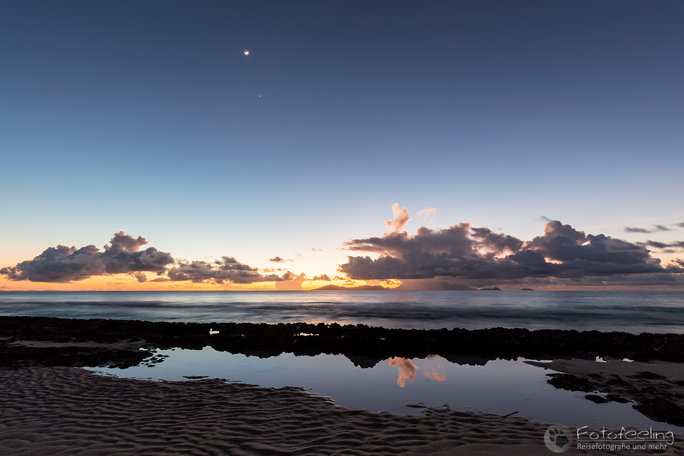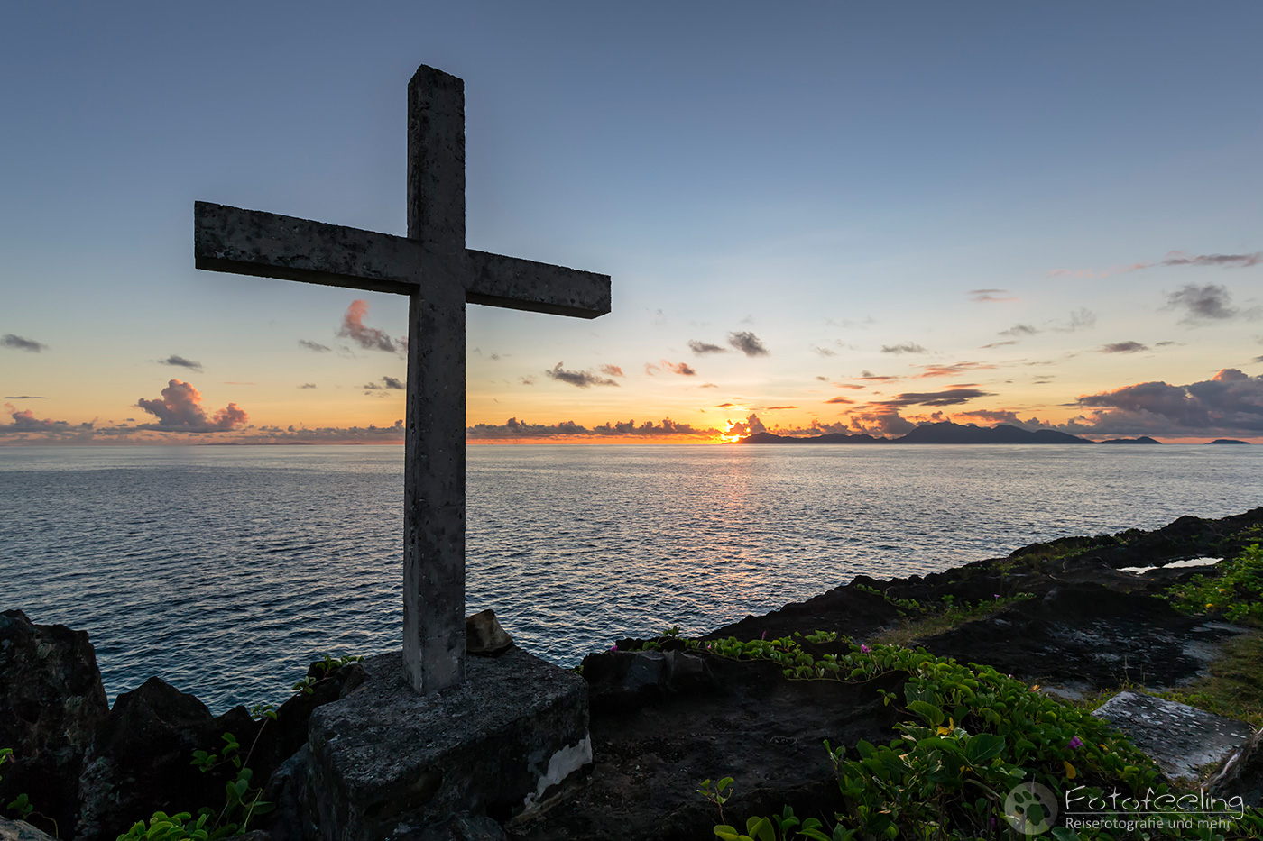 Noch im Dunkeln klingelte unser Wecker und noch sehr verschlafen quälte ich mich aus dem Bett. Wir wollten den Sonnenaufgang am Pointe Ramasse Tout genießen und mussten darum zeitig los. Es war noch sehr still auf der Insel, nur die Krabben wuselten schon umher. Dank unserer Stirnlampen konnten wir den Weg gut erkennen und erklommen den kleinen Hügel. Kurz darauf saßen wir am Kreuz und schauten über das Meer. Die Sonne würde in der Nähe von Mahé aufgehen und ein oranges Glühen lag über der Insel, während sich der Himmel tiefblau abzeichnete.
