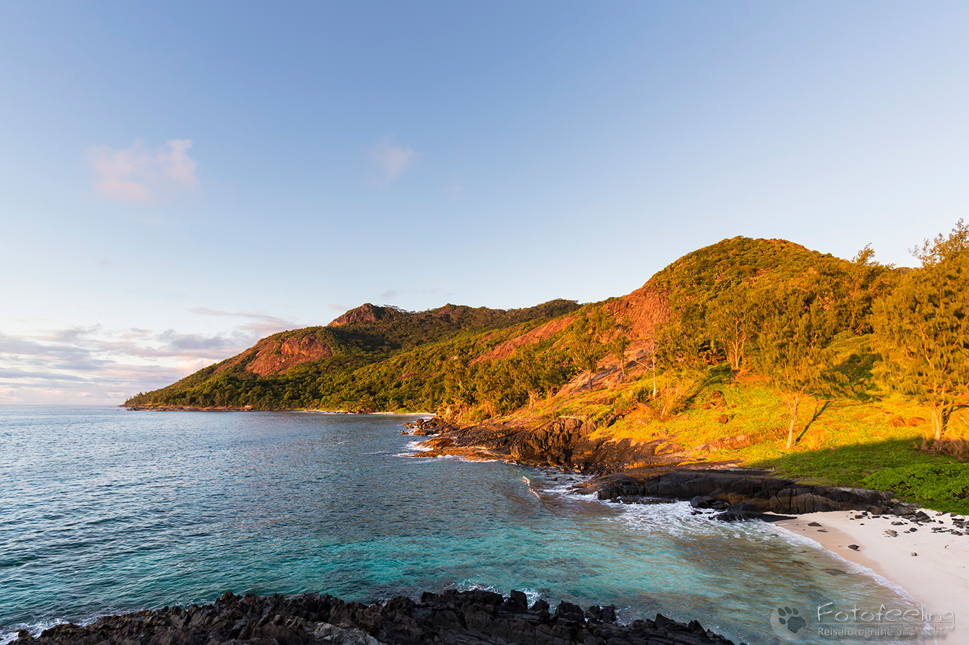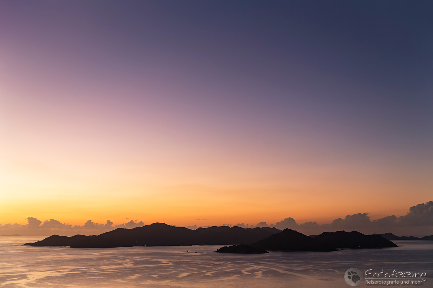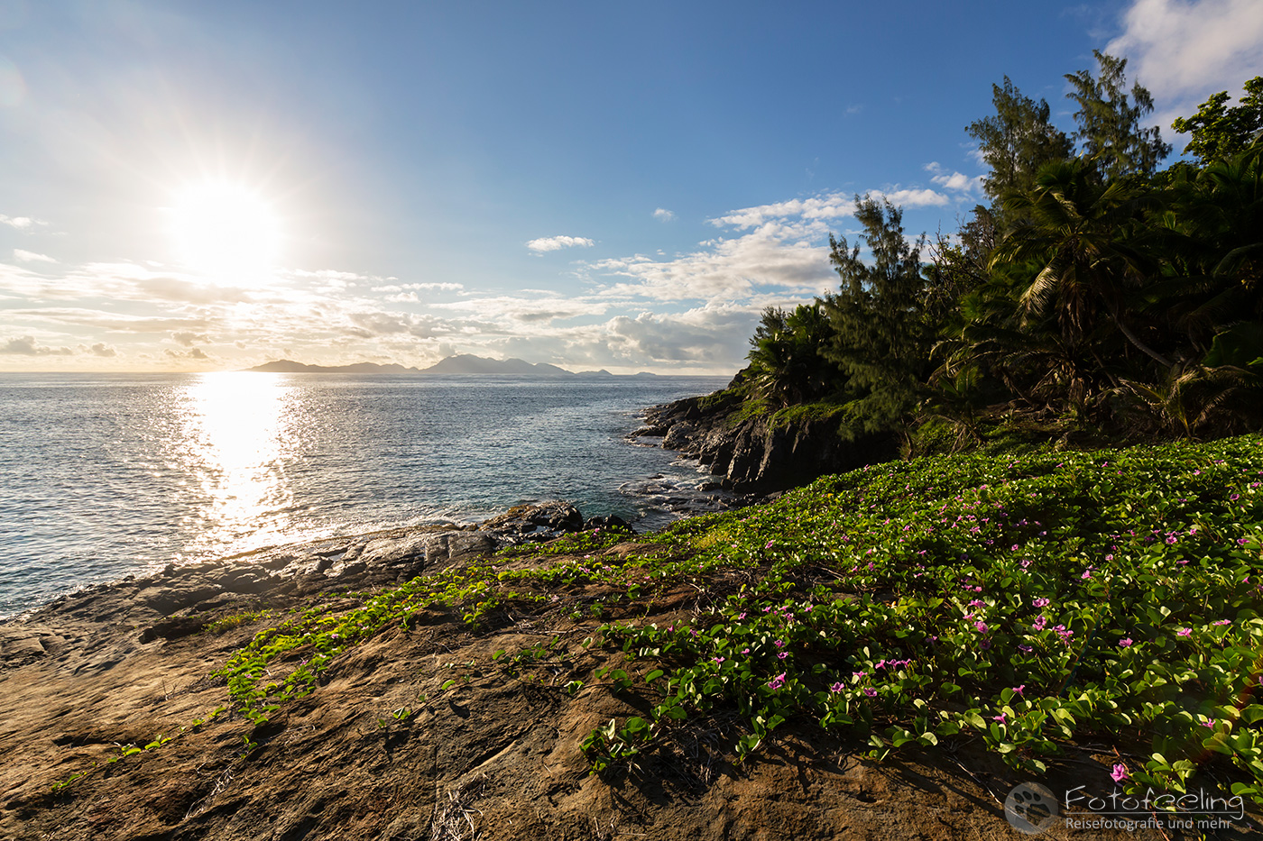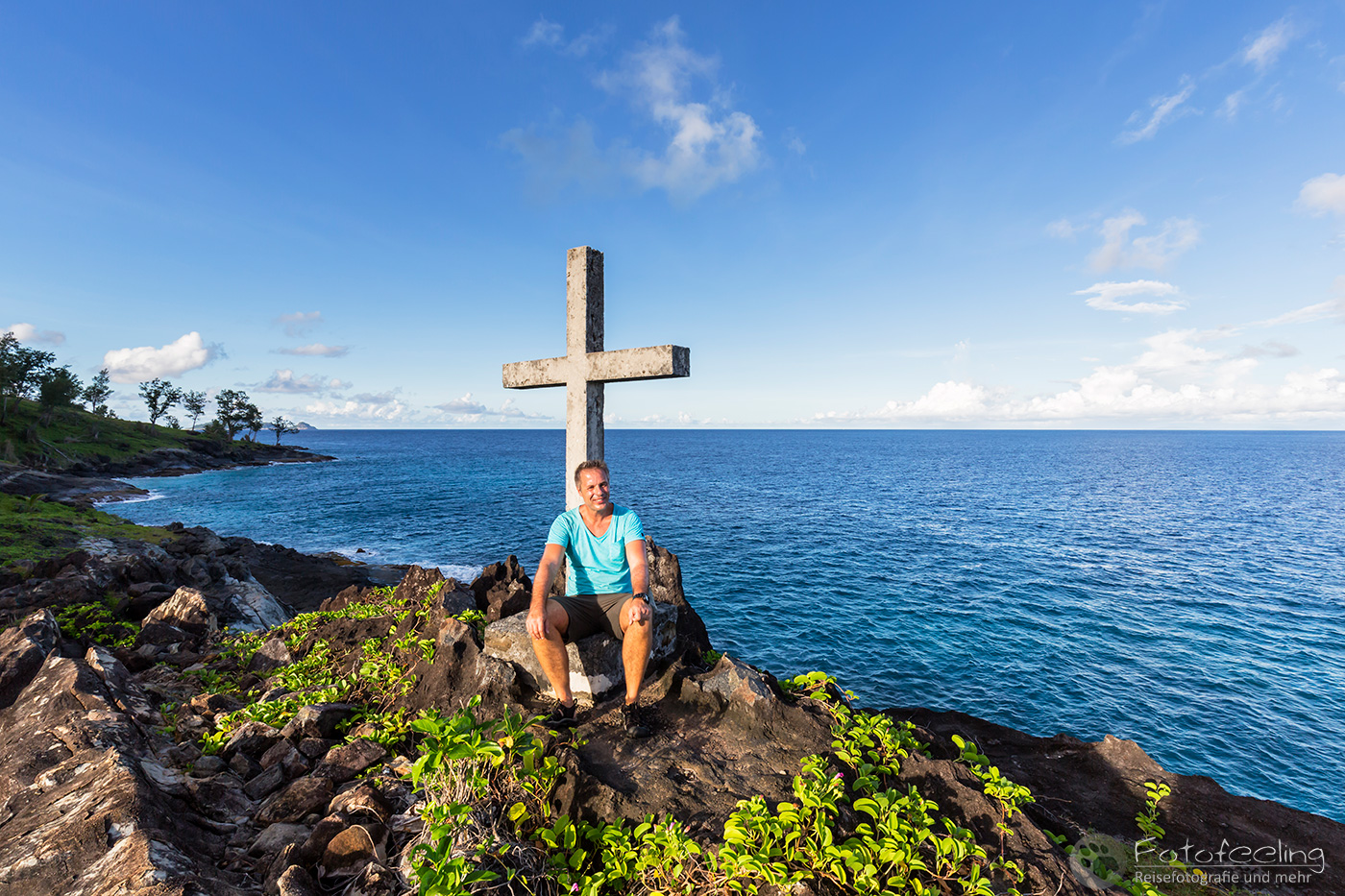 Noch im Dunkeln klingelte unser Wecker und noch sehr verschlafen quälte ich mich aus dem Bett. Wir wollten den Sonnenaufgang am Pointe Ramasse Tout genießen und mussten darum zeitig los. Es war noch sehr still auf der Insel, nur die Krabben wuselten schon umher. Dank unserer Stirnlampen konnten wir den Weg gut erkennen und erklommen den kleinen Hügel. Kurz darauf saßen wir am Kreuz und schauten über das Meer. Die Sonne würde in der Nähe von Mahé aufgehen und ein oranges Glühen lag über der Insel, während sich der Himmel tiefblau abzeichnete.