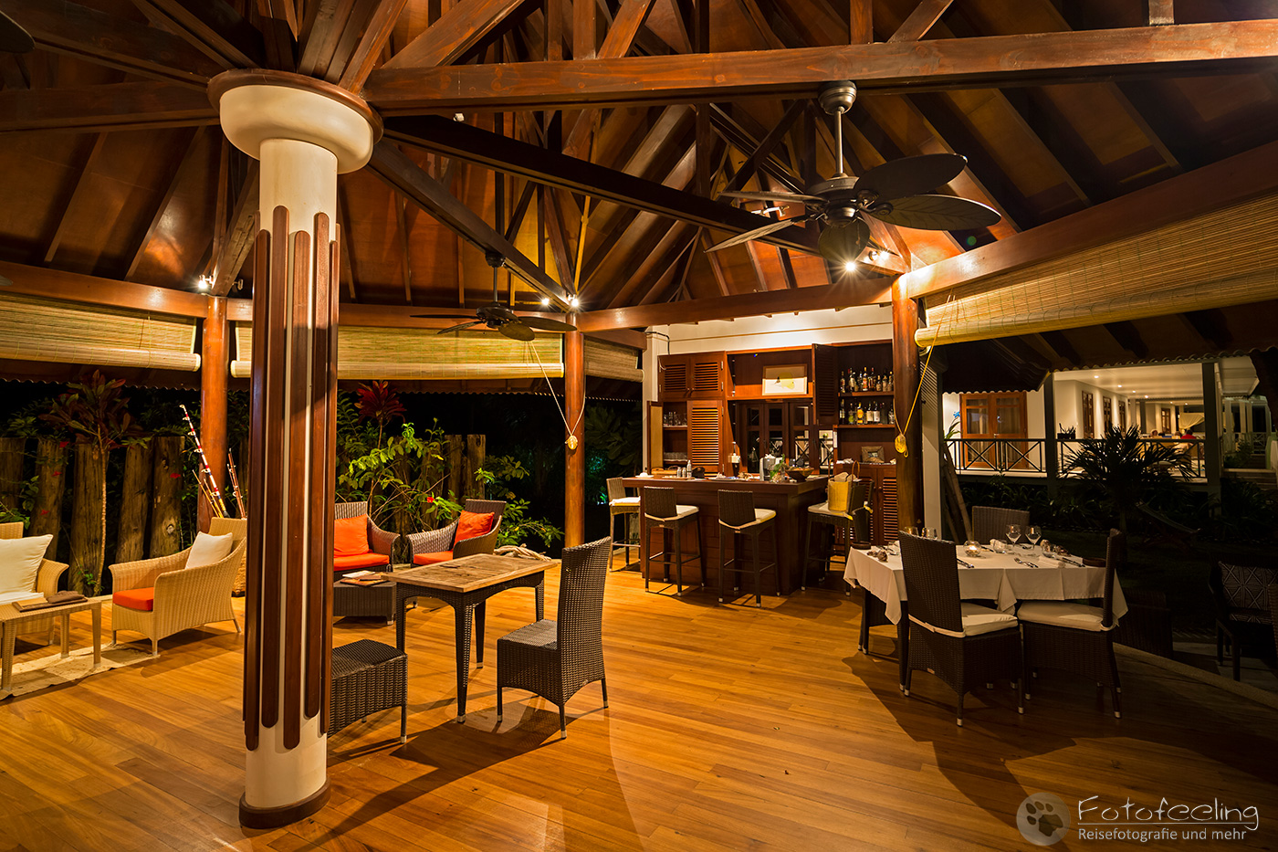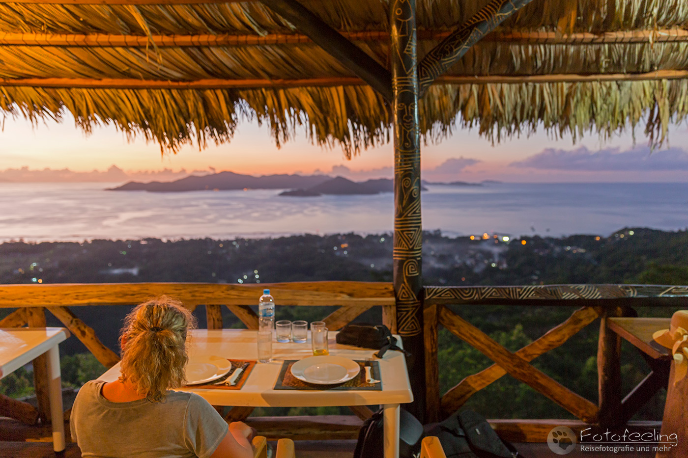 Um 17.30 Uhr gingen wir zur La Digue Island Lodge, wo wir mit den Berlinern verabredet waren. Wir setzten uns zu ihnen und genossen den Sonnenuntergang bei einem Gin Tonic mit Blick auf das Meer und Praslin.