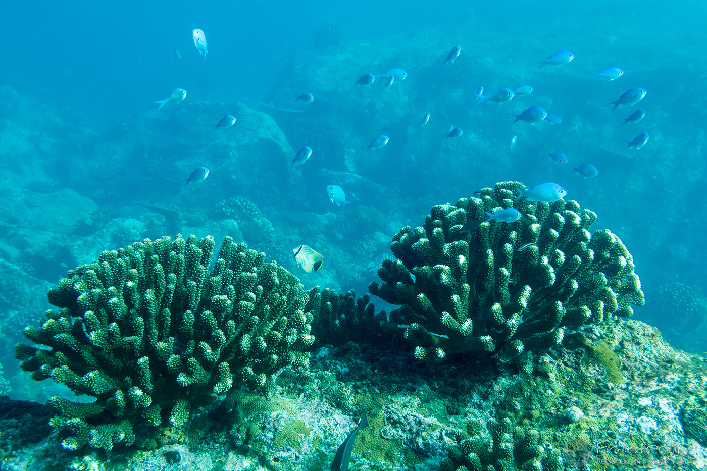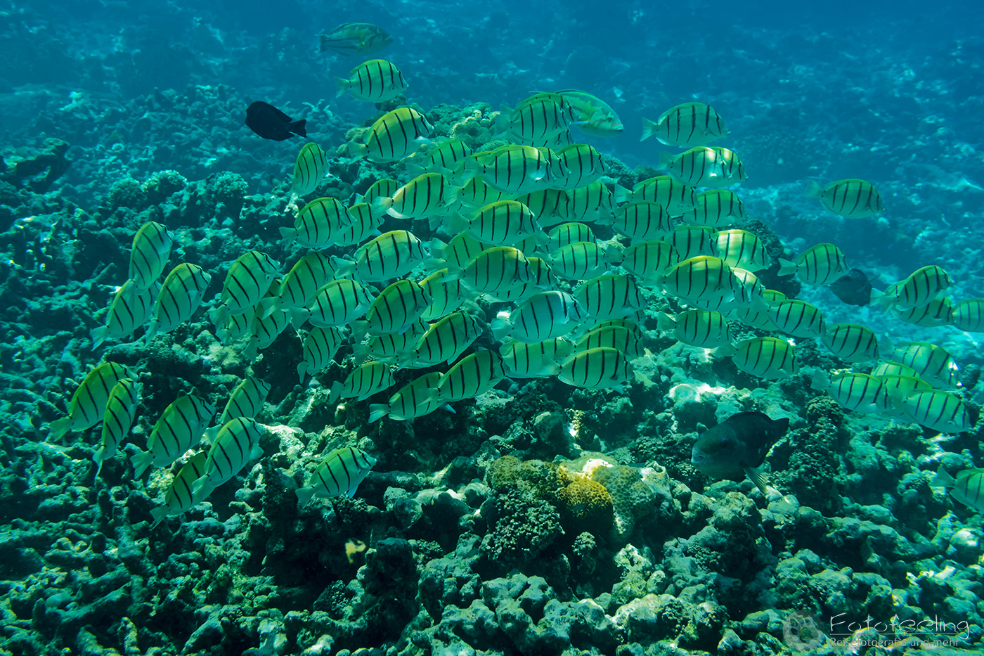 Kurz vor 15 Uhr fuhren wir zur kleinen Insel St. Pierre, wo wir schnorchelten. Es gab zwar allerhand bunte Fische, aber das Riff war dank El Nino total kaputt. Überall lagen graue Korallenteile herum und es sah ein wenig wie in einem Endzeitfilm aus. Doch das Leben setzte sich wieder durch und so wuchsen mitten in diesem Friedhof wieder einige neue farbige Korallen. Etliche Seeigel saßen auf den zerstörten Korallen und schauten mit ihren langen schwarzen Stachel respekteinflößend zu uns hoch. Wir sahen zwei kleine Barrakudas und viele bunte Fische, die scheinbar immer noch genug zu fressen hatten und auch Schutz fanden.