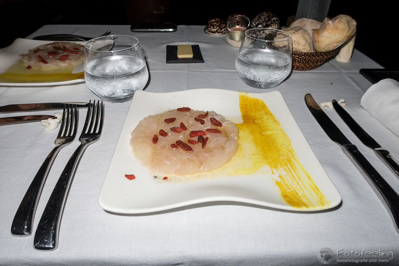 Um 7.30 Uhr gab es Abendessen. Jetzt lernten wir Emmanuel kennen. Er leitet zusammen mit Mariannick das Hotel und kocht auch noch ganz hervorragend. Witzigerweise spricht er auch noch etwas deutsch. Ein sehr netter, lustiger junger Koch und Gastgeber. Das Essen war wirklich klasse. Als Vorspeise gab es Jobfish Carpaccio mit Goji-Beeren. Als Hauptspeise Kartoffelpüree mit einer Zimt Note und gegrillten Fisch. Der krönende Abschluss war Creme Karamell. Das war vielleicht lecker!