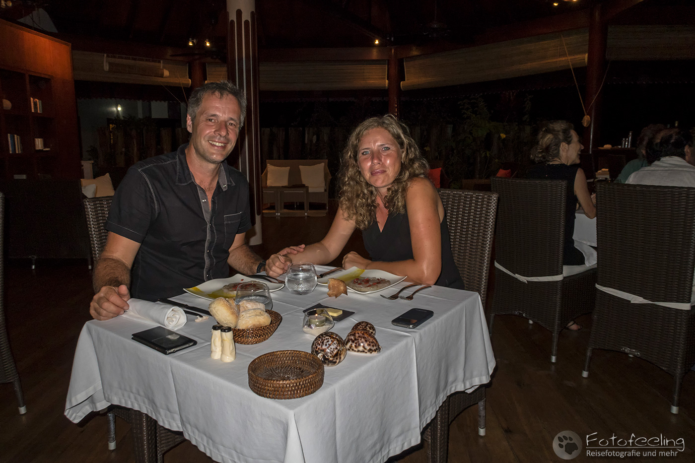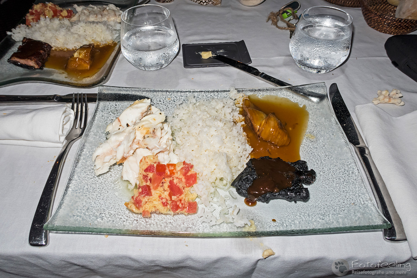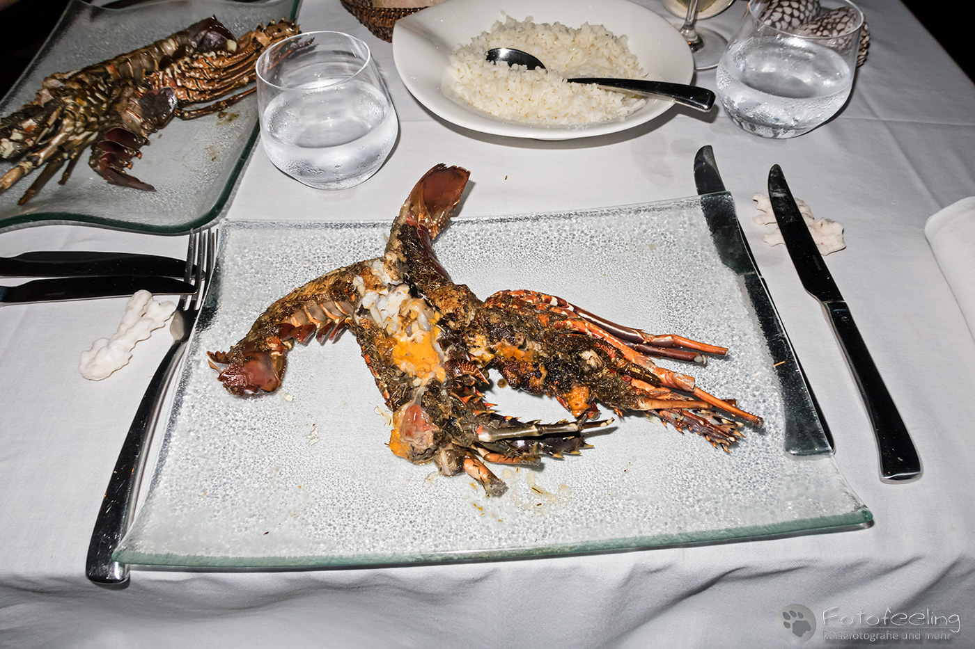 Am Ende des Strandes fand ein Fotoshooting von einer stark geschminkten Dame statt, die sich in den sanften Wellen rekelte... Okay, jeder wie er es mag. Wir versuchten lieber, zwischen den Felsen hindurchzugehen, um an den Presidential Beach zu kommen. Doch das war gar nicht so einfach. Mariannick hatte uns gesagt, dass man bei Ebbe gut durch die Steine zum nächsten Strand kommt, aber dank der aktuellen Mondphase gab es momentan fast keinen Wasserstandsunterschied zwischen Ebbe und Flut und so kamen wir nicht an den Steinen vorbei. Während Chris weiter oben versuchte, einen Weg durch die Steine zu finden, schaute ich mir den Weg durch das Wasser an. Eigentlich hätten wir nur über zwei, drei Felsen klettern müssen, dann wären wir am anderen Strand. Ich schaute mir die Steine genauer an und stellte fest, dass sie nicht rutschig waren. Da wird Chris schauen, wenn ich so einfach einen Weg finde, dachte ich mir und stieg auf einen trockenen Stein. Das dachte ich jedenfalls solange, bis ich mit beiden Füßen auf dem Stein stand, der plötzlich gar nicht mehr trocken war. Was hatte ich mir nur dabei gedacht! Doch während der Gedanke blitzschnell durch meinen Kopf schoss, merkte ich schon, wie meine Flipflops auf dem glitschigen Stein wegrutschten und meine Füße mit ihnen. Meine Knie kamen auf dem Stein auf, aber auch sie hatten keinen Halt, so dass ich auf meinen Ellenbogen landete, doch auch diese rutschten weg und ich fiel ungebremst mit dem Kopf auf den Felsen. Vor Schreck stand mir mein Mund offen, wahrscheinlich wollte ich aufschreien, aber kein Laut kam über meine Lippen. Stattdessen schlugen meine Zähne mit voller Wucht auf den Stein und ich spürte wie sie splitterten. Gefühlte Stunden später kam ich endlich wieder auf die Füße. In meinem Mund waren Spucke, Blut und Zahnsplitter. Vorsichtig erkundete ich mit der Zunge den Schaden der sich gigantisch anfühlte. Meine Vorderzähne waren weg und nur noch ein paar Splitter standen im Mund. Nun flossen die Tränen ungebremst, ich glaube, ich stand unter Schock! So fand mich Chris, der sofort ahnte, dass etwas nicht stimmt und auf mich zugelaufen kam. Unter Tränen erzählte ich ihm, was passiert war und er überredete mich, den Mund zu öffnen. Ganz so schlimm war es dann zum Glück doch nicht. Es hatte nur einen Schneidezahn erwischt und dieser stand zum Glück vorne noch zur Hälfte als Fassade, während er hinten bis zum Zahnfleisch weggebrochen war. Alle anderen Zähne hatten zwar ein paar Riefen abbekommen, aber sie waren noch intakt. Trotzdem war ich völlig konfus und hatte keine Lust mehr auf Abenteuer. So gingen wir zurück zu unserer Unterkunft. Mein Kopf dröhnte und mein Knie blutete etwas. Wir duschten und gingen später zum Abendessen, das zu einer kleinen Herausforderung für mich wurde, aber irgendwie ging es und schmeckte mir sogar. Als Vorspeise gab es Avocado/Mangosalat mit Goji-Beeren, als Hauptgericht gegrillte Langusten und zur Nachspeise Schokosoufflee mit Passionsfrucht. Es war einfach nur lecker und ein wenig wie ein Pflaster für meine geschundene Seele.