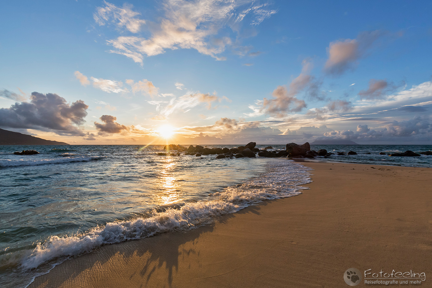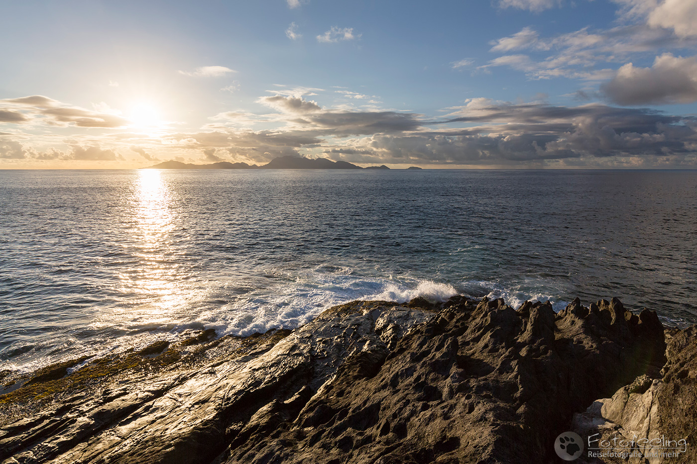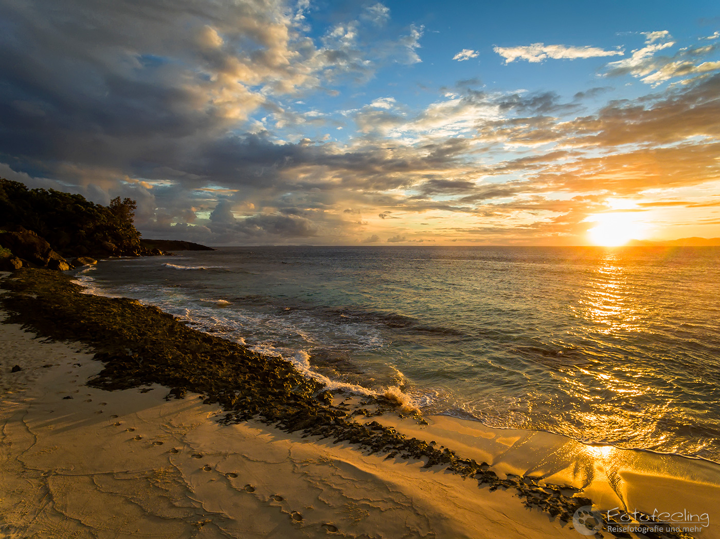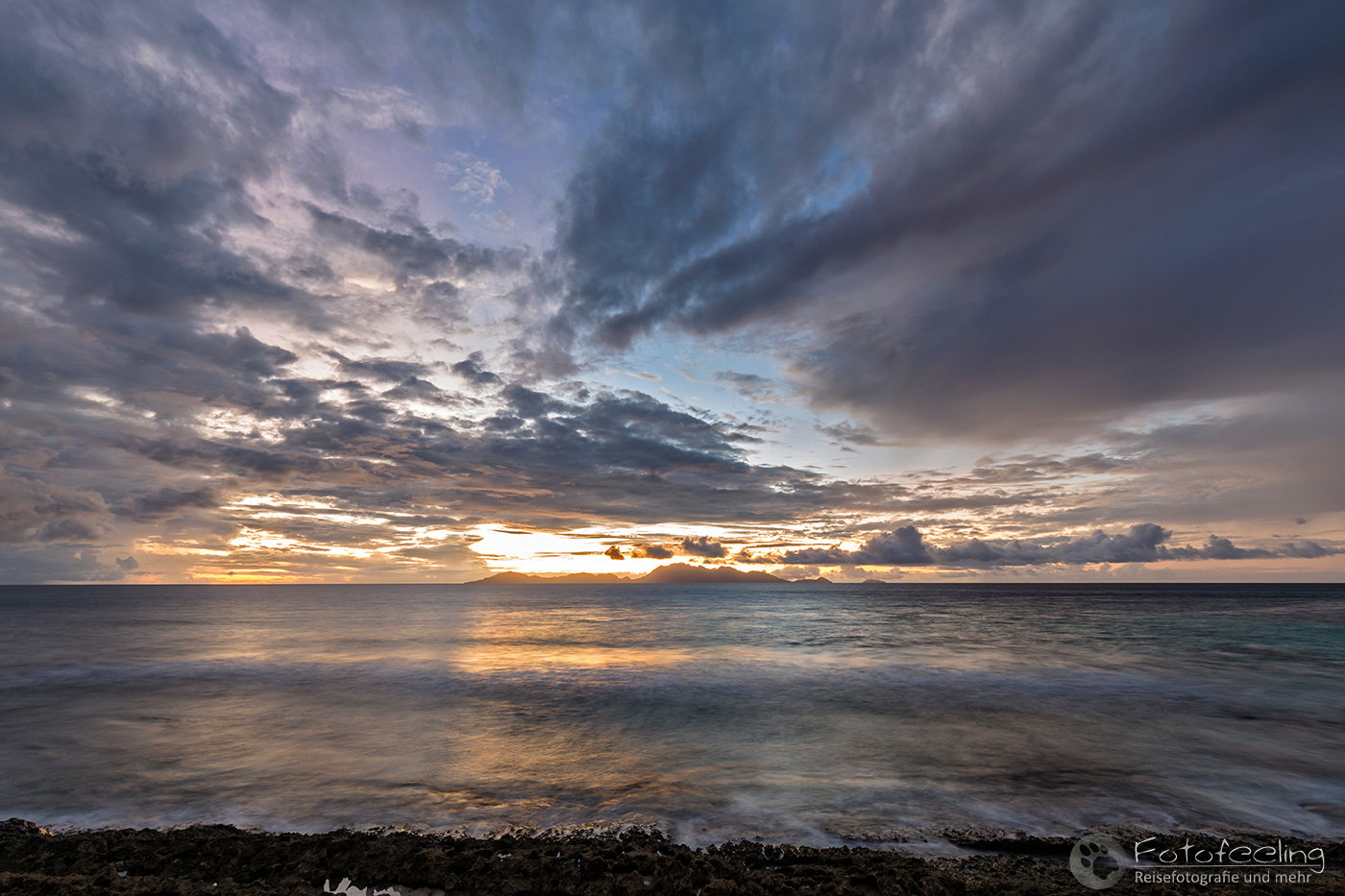 Den Sonnenuntergang verbrachten wir wieder an "unserer" kleinen Glacis Bucht und diesmal ging die Sonne auch im Meer unter. Es war, als ob sie uns verabschieden wollte. In der Ferne sahen wir die Umrisse von Silhouette und so langsam realisierten wir, dass sich unsere Reise nun dem Ende neigte. Wir aßen noch einmal im La Plage ein super gutes Abendessen und genossen das Rauschen der Wellen - diesmal ohne Wind.