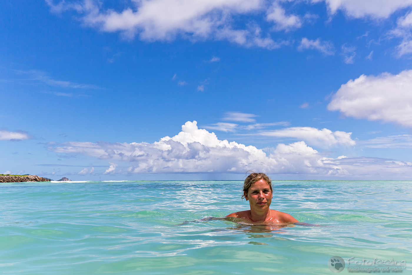 Danach gingen wir an den Strand und badeten im seichten Wasser. Durch das Riff und Steine im flachen Wasser war das gar nicht so einfach, aber an ein paar schönen Felsen fanden wir eine perfekte Bademulde und genossen das warme Wasser, auch wenn man hier nicht so richtig schwimmen kann.