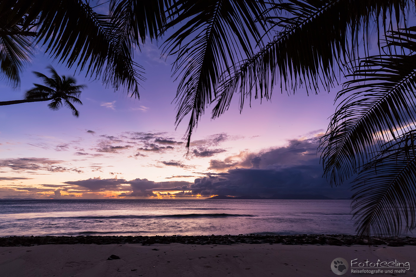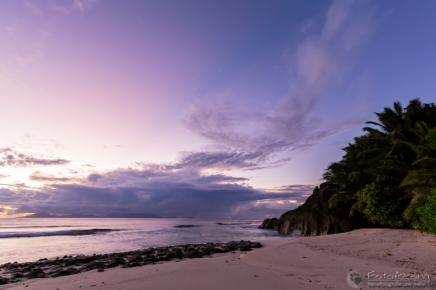 An diesem Morgen war es besonders dunkel, denn dicke Wolken bedeckten Himmel. Trotzdem standen wir früh auf und gingen wie jeden Morgen zum Anse Lascar. Als wir ankamen, verfärbte sich der Himmel lila und es leuchtete fantastisch. Wieder hatte sich das Aufstehen gelohnt, denn gerade die Morgenstimmung ist etwas ganz besonderes an diesem friedlichen Ort.