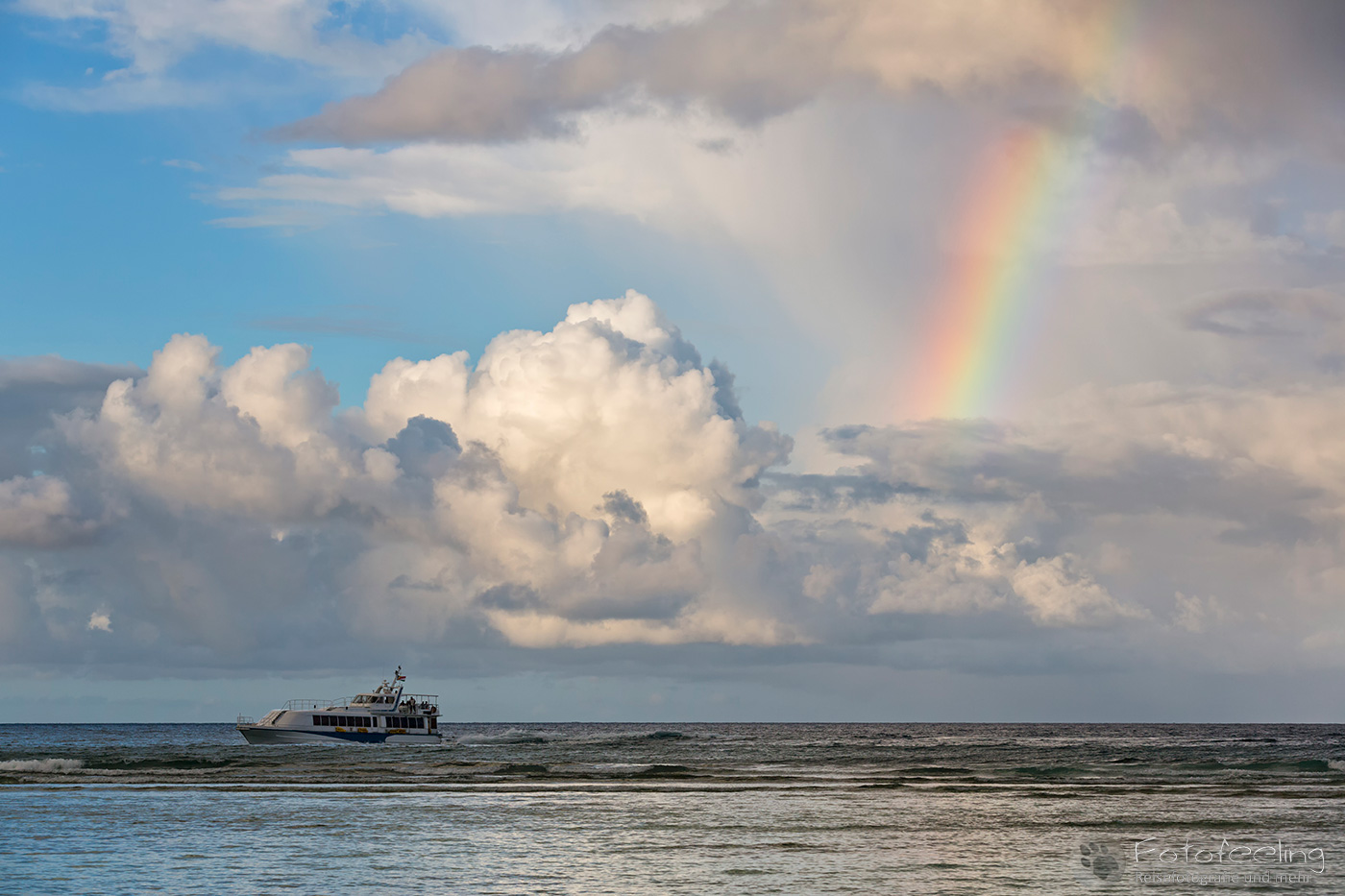 Etwas später bildet sich ein schöner schillernder Regenbogen über dem Meer. Man konnte richtig sehen, wo der Regen herunter fiel und wo die Sonne schien. Mitten in dieser Szenerie kam erst die Fähre an und dann noch ein Hubschrauber, der wohl wichtige Gäste brachte, denn am Anleger stand ein ganzes Aufgebot an Personal und am Vormittag wurde die Präsidenten Villa hergerichtet.