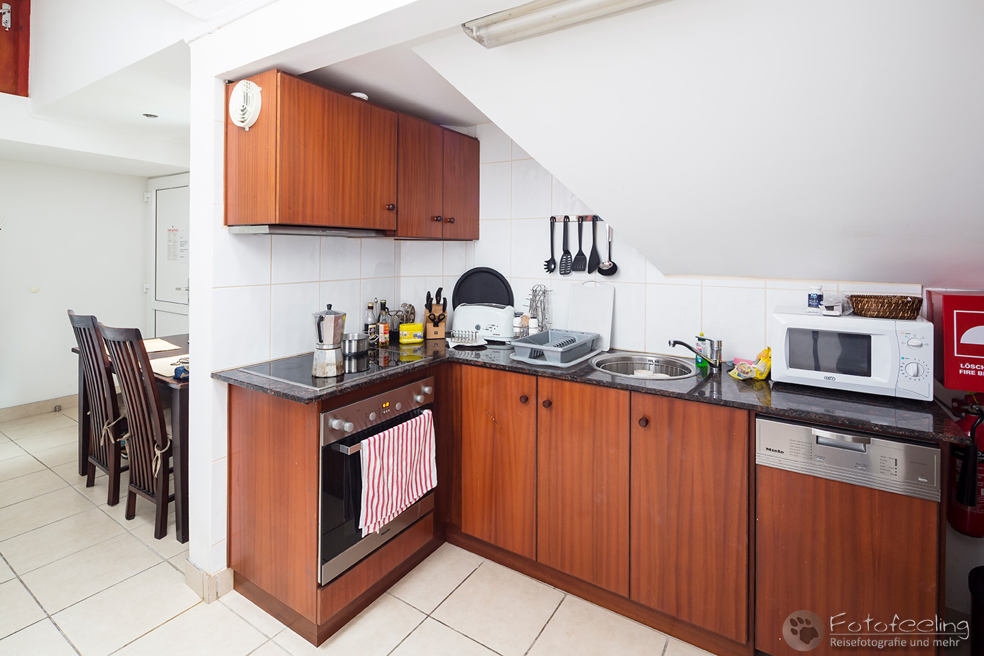 Das Zimmer war wirklich toll mit allem, was man sich nur wünschen konnte. Die Küche war mit Kühlschrank, Spülmaschine, Toaster perfekt ausgestattet. Im Bad gab es sogar eine Waschmaschine mit Trockner. Ein gemütliches Schlafzimmer mit einem einladenden Bett. Einzig der kleine Balkon war nach der Freiheit der letzten Wochen ein Manko für uns. Das war natürlich nicht schlimm und stand auch so in der Beschreibung, aber wir als "Draußensitzer" waren von der eingeschränkten Sicht durch die Dachschräge schon etwas enttäuscht. Aber wir waren ja nicht hier, um auf dem Balkon zu sitzen, sondern wollten die Insel erkunden. Jedenfalls konnten wir vom Balkon aus, hinter dem Savoy Hotel, einem riesigen Bunker, das Meer hören und unten den Pool betrachten. Ich packte schnell aus, während wir auf den Mietwagen warteten, der direkt zu unserer Unterkunft gebracht wurde.