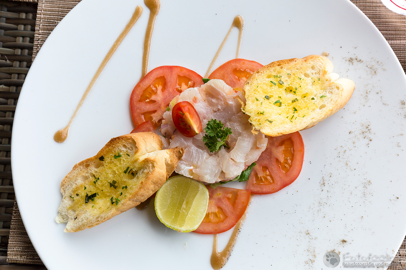 Im nahe gelegenen Restaurant Del Place aßen wir Mittag. Wir suchten uns einen schönen Platz auf der Terrasse, aber leider war der Wind so heftig, dass beinahe der Sonnenschirm weggeflogen wäre und wir uns unter den überdachten Teil der Terrasse zurückziehen mussten. Da wir nicht so viel Hunger hatten bestellten wir Ceviche aus Fisch und Räucherfischsalat. War das vielleicht lecker!!! Als Nachtisch gab es sogar noch einen richtigen Cappuccino für mich, eine wahre Rarität auf den Seychellen.
