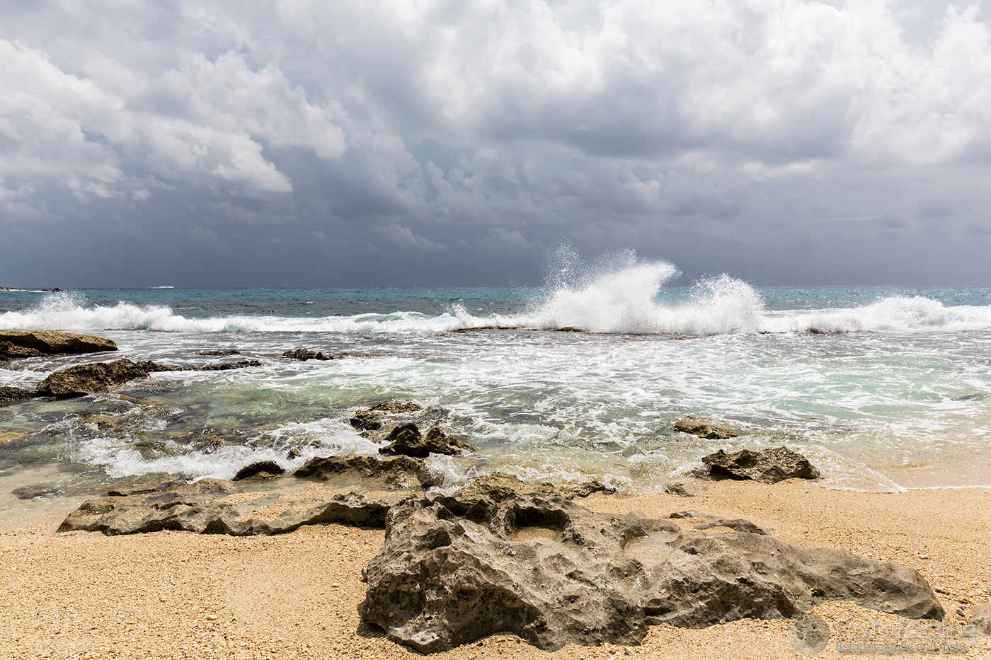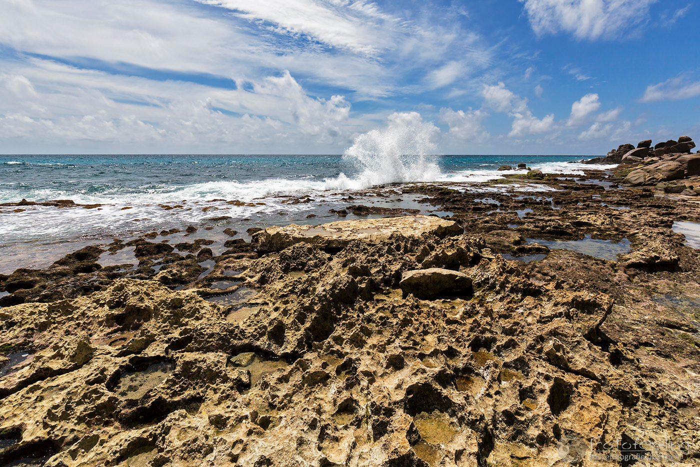 Am Petite Police einem Riffstrand, krachten wieder die Wellen auf die Steine. Es sah unglaublich klasse aus, wenn die Gischt meterhoch spritzte und klatschend auf den Rifffelsen landete. Über dem Meer lag eine dunkle Regenfront.