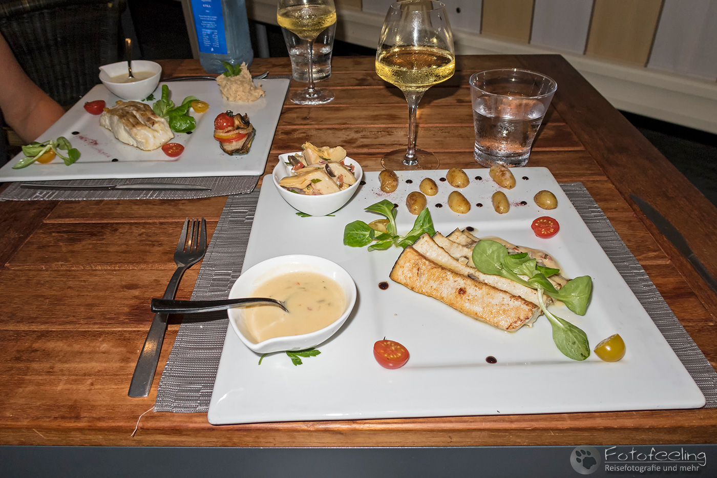 Über den Sunset Beach fuhren wir zurück zu unserem Apartment. Wir schwammen noch ein wenig im Pool und quatschten mit Tassilo, dem Sohn der Besitzerin. Zum Sonnenuntergang gingen wir zum Strand vor, aber dichte Wolken und ein heftiger Wind, der wie ein heißer Fön blies, verdeckten das Schauspiel und so senkte sich die Dämmerung wie ein blaues Tuch herab, jedoch ohne den Hauch einer rötlichen Verfärbung. Normalerweise legt sich der Wind mit der Dämmerung, aber nicht an diesem Abend, wo wir im La Plage direkt am Strand einen Tisch reserviert hatten. So saßen wir zwar draußen, aber hinter Planen, die uns vor dem heftigen Wind schützten. Dafür rauschte das Meer unbeschreiblich schön und das Essen war hervorragend. Mein Red Snapper in Knoblauchsoße mit geräuchertem Fischmus und Gemüse war nicht nur eine Augenweide, sondern auch ein Hochgenuss und Chris Schwertfisch mit Austernsoße, Oliven-Artischockensalat und Kartoffeln stand dem in nichts nach. So gingen wir sehr zufrieden zurück zu unserem Zimmer und nach einem Glas Wein ins Bett.
