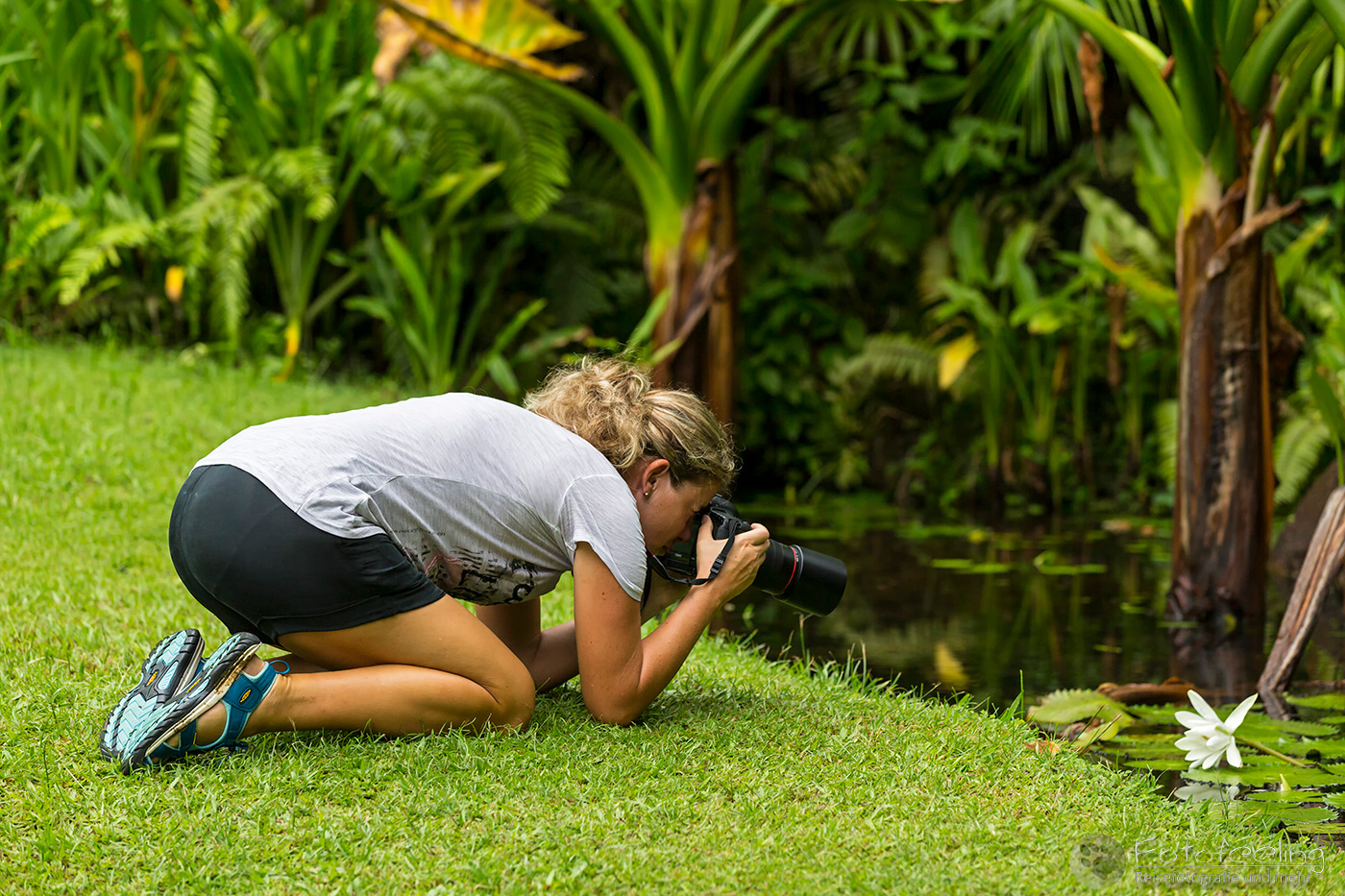 Natürlich quälten wir uns auch an diesem Morgen aus den Betten und gingen wieder im Dunkeln zum Anse Lascars. Der Sonnenaufgang war wie immer schön. Aber am schönsten waren wiederum die Ruhe und das warme Licht. Da Chris noch nicht am Anse Patatas war, gingen wir an diesem Morgen gemeinsam bis an den dritten Strand. Der Weg dorthin war immer noch sehr abenteuerlich, besonders, wenn man ihn wie Chris zum ersten Mal ging. Überall standen Palmen und man musste schon schauen, damit man nicht ständig unter den gewichtigen Kokosnüssen spazierte. Ein kleiner Wasserlauf rauschte den Berg hinab in Richtung Meer. Unten angekommen erkundeten wir die Bucht. Chris ließ den Kopter steigen und ich sah mir die Felsen am Ende des Strandes genauer an. Danach wanderten wir langsam zu unserem Bungalow zurück. An der Betonbrücke zweigte Chris doch noch einmal nach rechts zum Kreuz ab, aber ich ging diesmal nicht mit, denn ich musste unbedingt packen. So trennten sich hier kurz unsere Wege, die sich zum Frühstück dann wieder fanden.