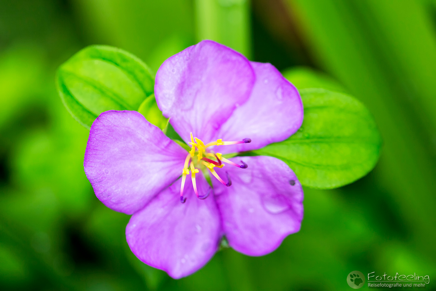 Während Chris den Kopter startete, machte ich ein paar Bilder und genoss die Wärme des Morgens. Die Sonne ging zwar nicht allzu spektakulär auf, aber dieser Platz war so schön, dass ich jeden Augenblick genoss. Das erste Licht erreichte die Lavafelsen und das schwarze Gestein begann golden zu schimmern. Wunderschön leuchteten die lila Blumen im Gegenlicht und die Insel wurde so nach und nach in Farbe getaucht.