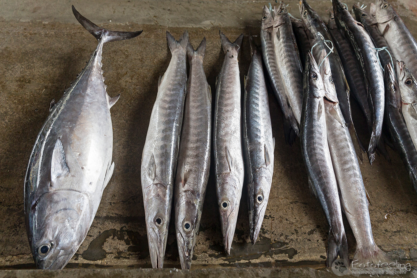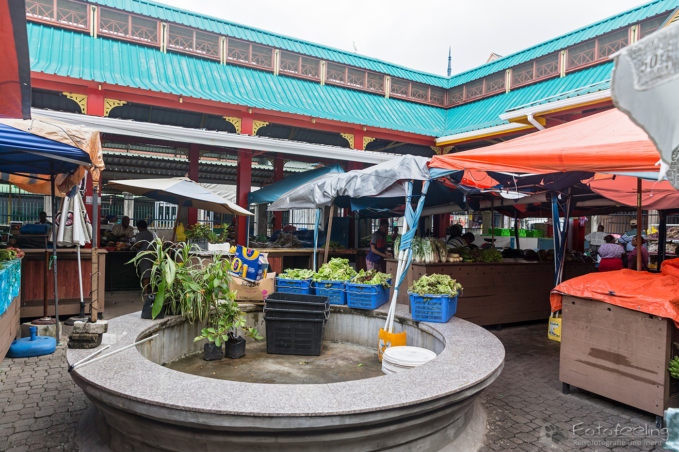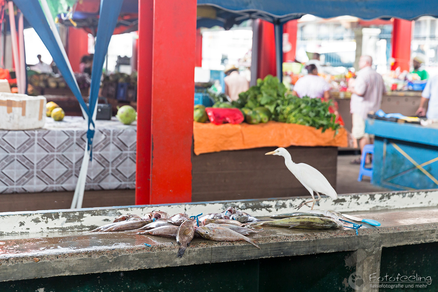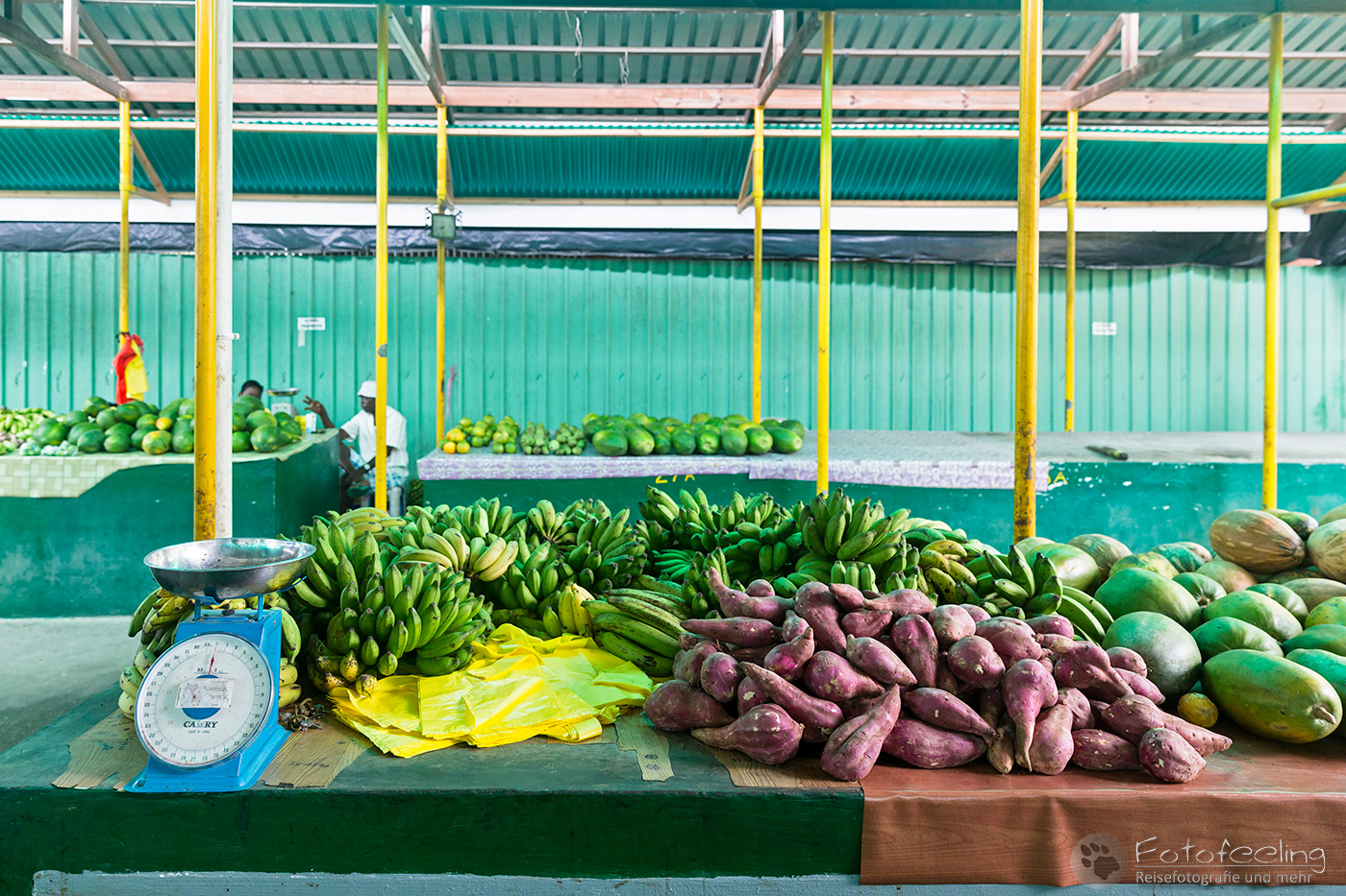 Am Morgen verabschiedeten wir uns noch von Natalie, die zurück nach Praslin flog. Es war leider wieder bewölkt. So frühstückten wir in Ruhe und sprangen dann ins Auto und fuhren noch einmal nach Victoria. Diesmal hatte der Markt geöffnet, aber da wir relativ spät dran waren, waren fast alle Fische verkauft. Trotzdem schlenderten wir noch durch die Hallen und kauften uns eine große Ananas.