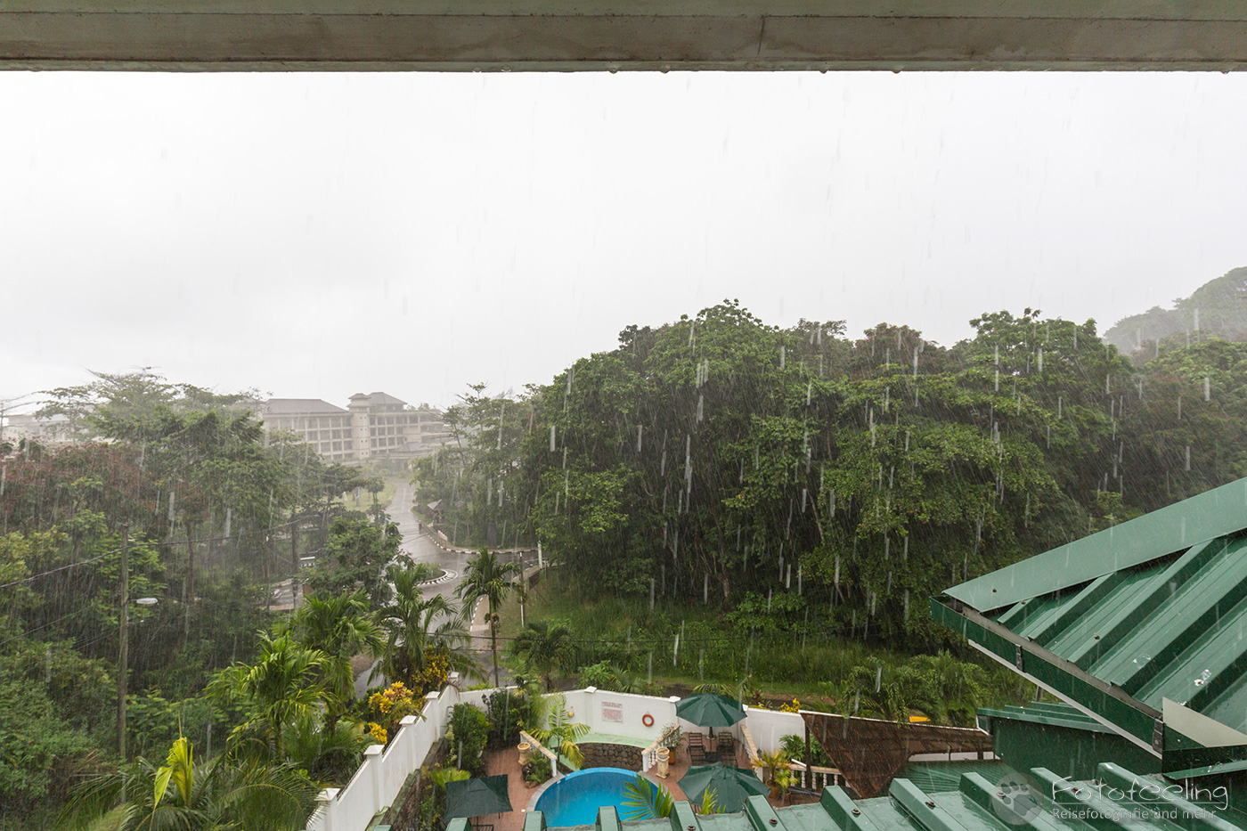 Um 7 Uhr schlenderten wir zum Bungalow zurück und lasen noch ein wenig, eher wir zum Frühstücken gingen. Das Wetter war an diesem Tag durchwachsen. So zogen dicke Wolken umher, doch die Sonne kämpfte sich immer wieder mal durch. Wir lasen, badeten und waren einfach nur faul. Mittags ließen wir uns wieder eine Kokosnuss schmecken. Am Nachmittag gewannen die Wolken das Spiel und ein heftiger tropischer Regen bahnte sich seinen Weg auf die Erde. Schwarze Wolken hingen über den Bergen und das Grün wirkte mal wieder noch kräftiger als gewöhnlich. Es war klasse, denn wir saßen im warmen Wasser und genossen die leichte Abkühlung. Dicke Tropfen trafen auf uns und das Wasser, das Blasen warf.