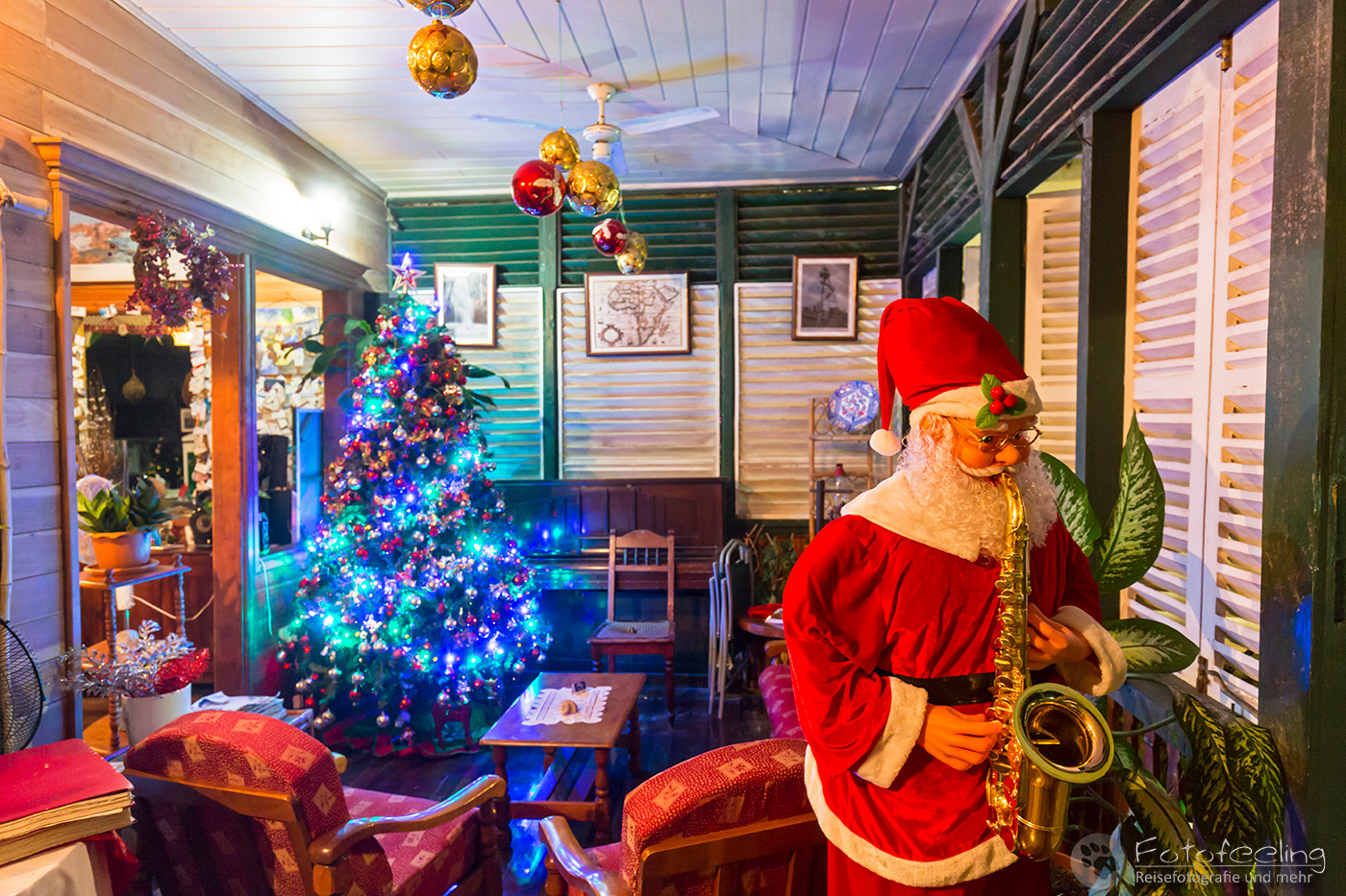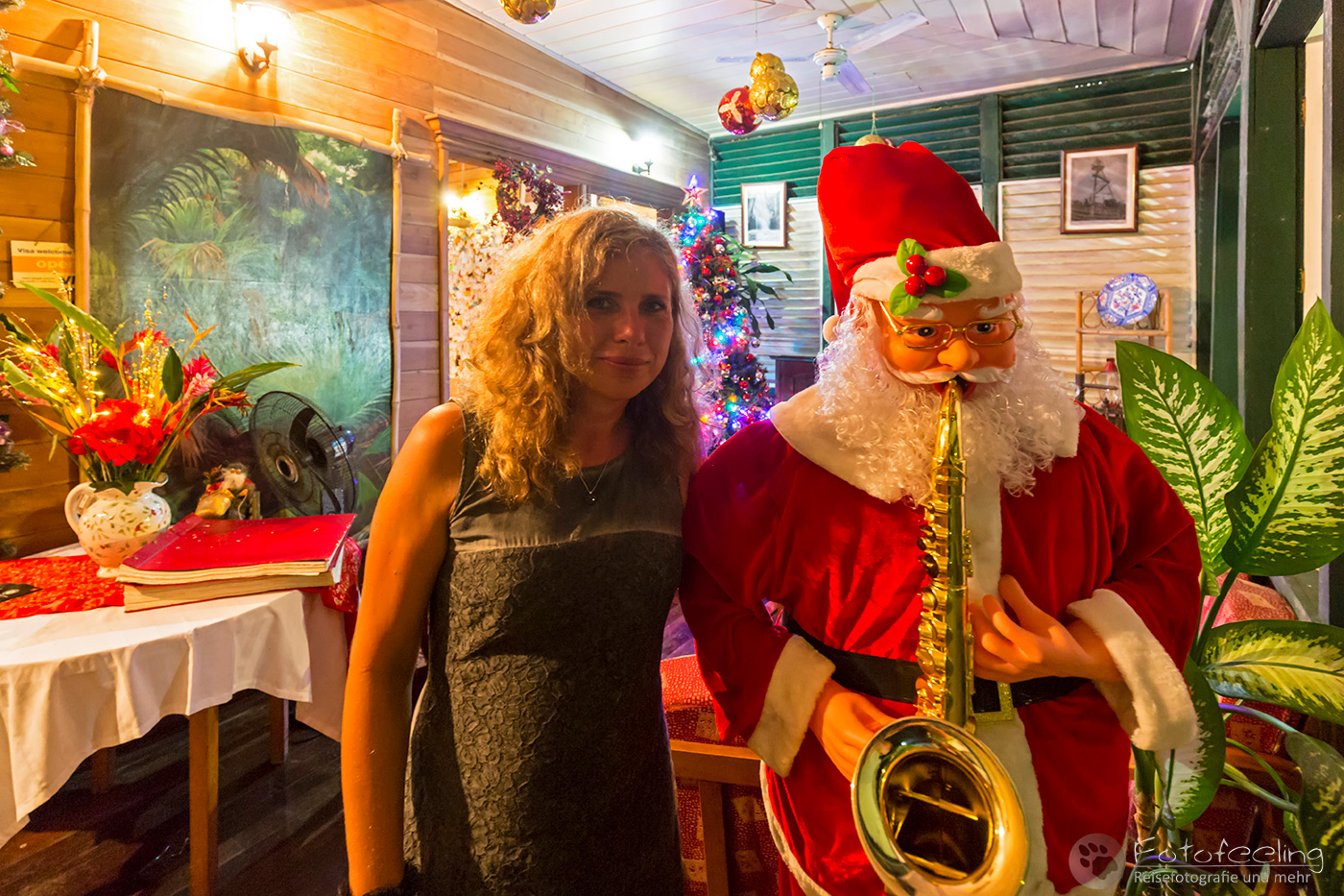 Abends zog es uns dann doch noch hinaus und wir gingen ganz hervorragend essen. Im Restaurant Marie Antoinette gab es ein kreolisches Buffet, direkt am Tisch. Das Essen war lecker und authentisch. Die ganze Gaststätte war weihnachtlich geschmückt und strahlte im Glanz von Kugeln und Weihnachtsmännern.